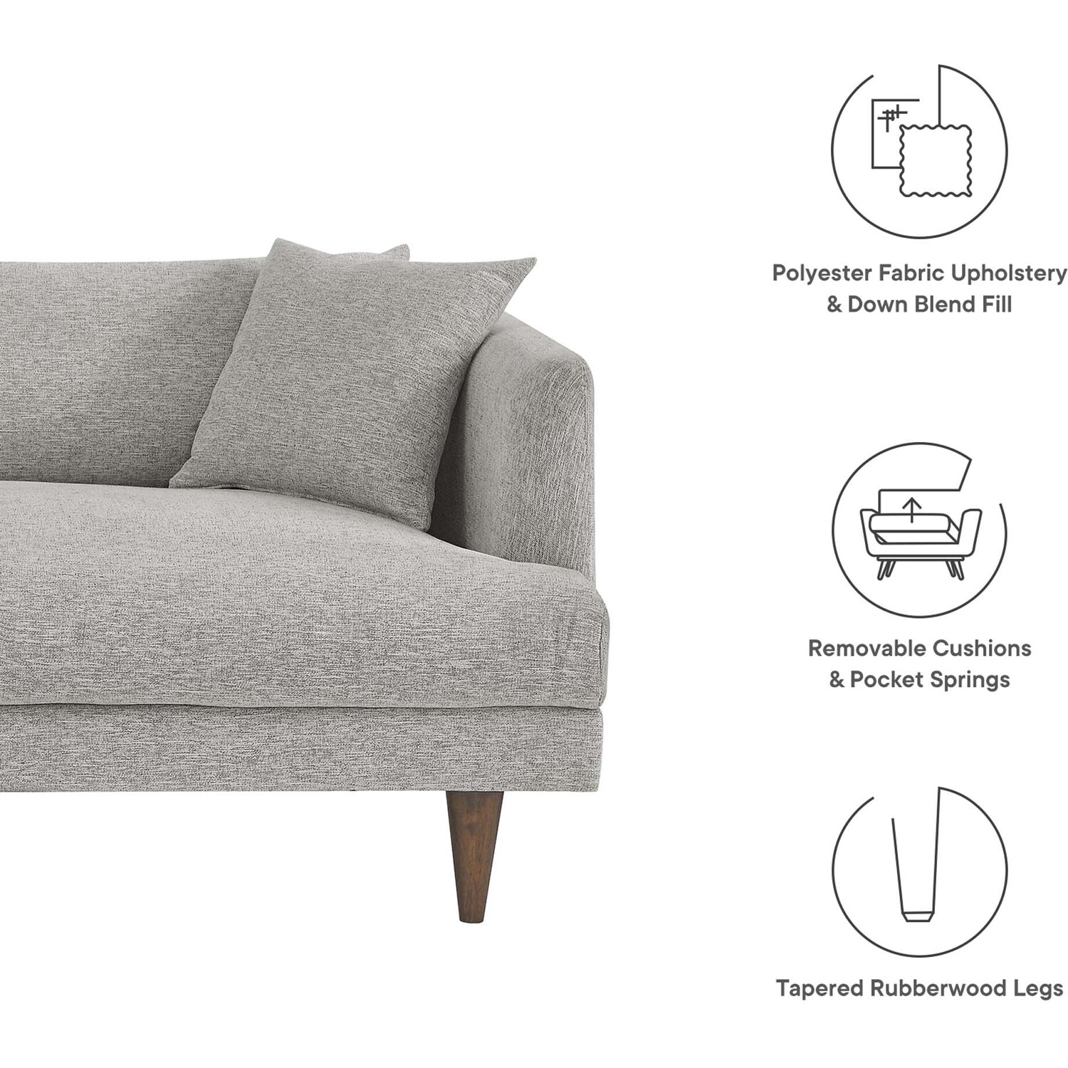 Dive deep into comfort and conversations with the Zoya Upholstered Down-Filled Sofa. The perfect addition to modern living rooms, family rooms, or game rooms, Zoya's design invites you into an immersive lounging experience, with a low, comfortable profile and spacious deep seating. Upholstered in polyester fabric with a down blend and dense foam filling, this living room sofa provides a soft, cloud-like sensation that retains its shape. Accompanied by back cushions and two square throw pillows, this sofa delivers a lounging experience optimized for comfort. The convenience of removable and washable cushions makes maintenance a breeze. Underneath a lavish exterior, Zoya integrates pocket springs, which offer added support, and comes perched on sleek tapered rubberwood legs and set on a solid wood frame. Whether you're hosting a movie night or reading your favorite book, the Zoya Fabric Sofa is your ticket to a luxurious lounge. Comes equipped with non-marking foot caps. Assembly required. Weight capacity: 600 lbs.Upholstered Polyester Fabric