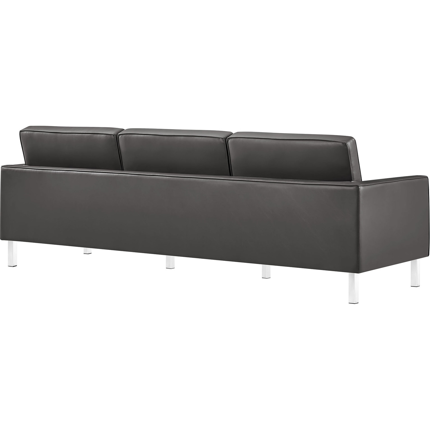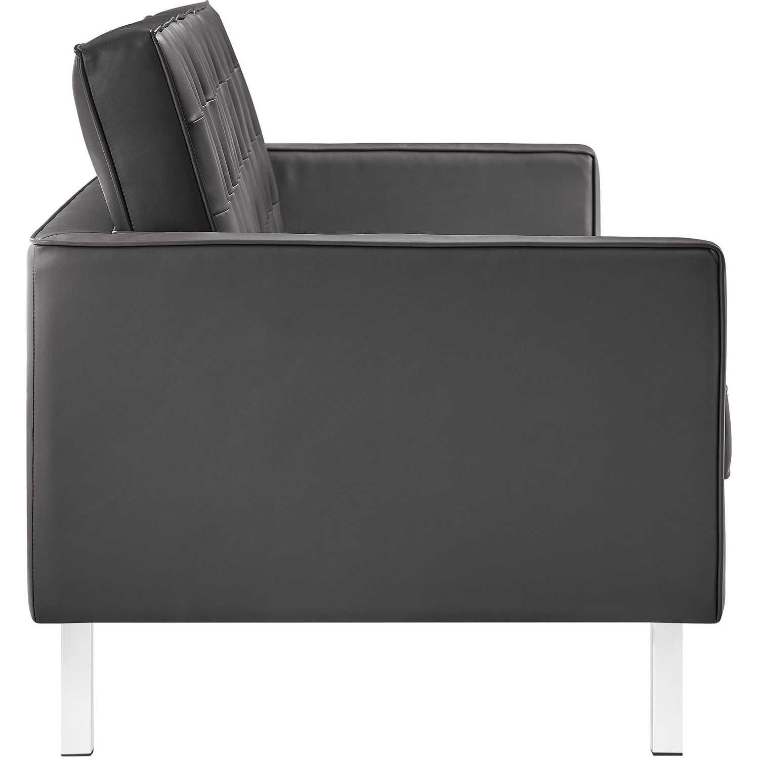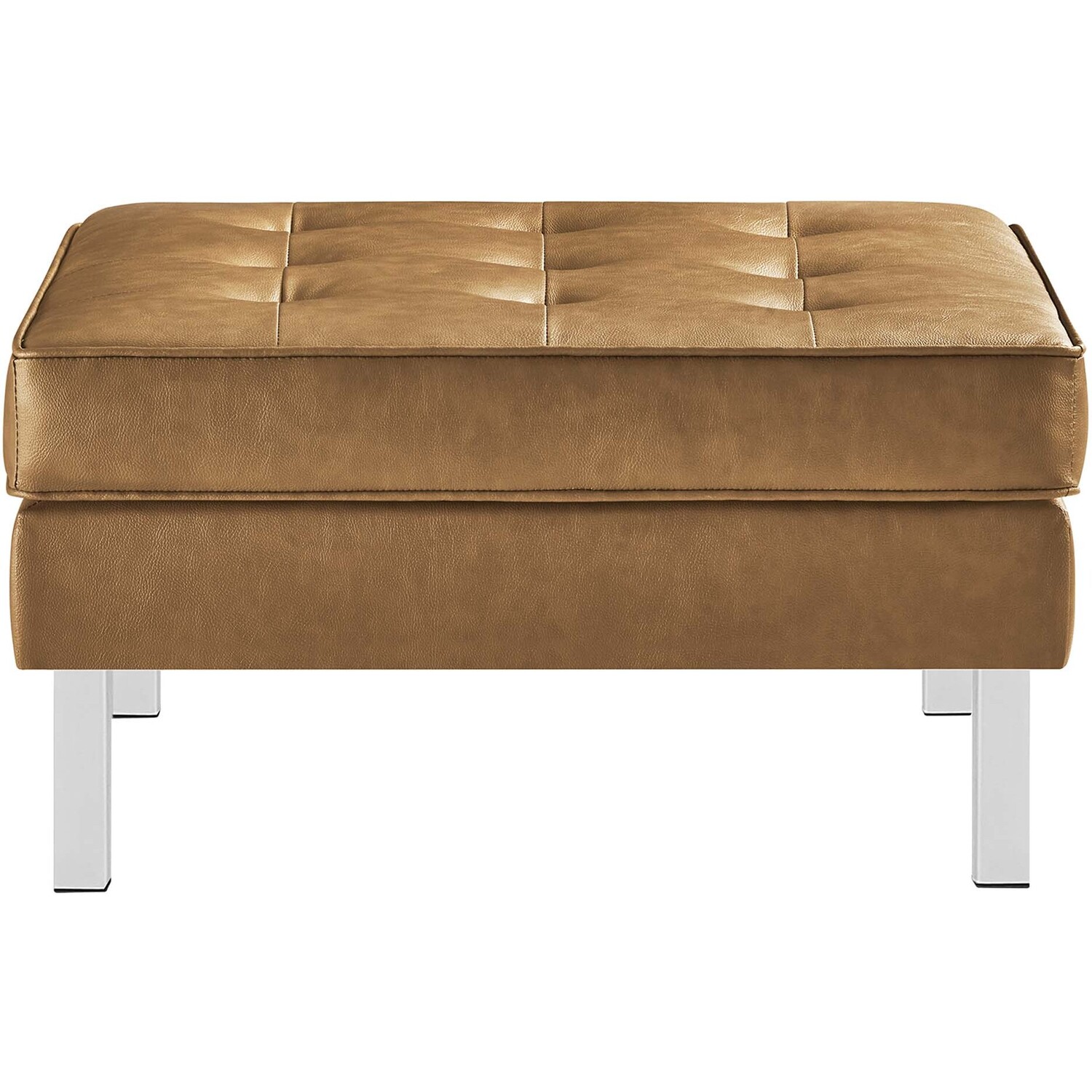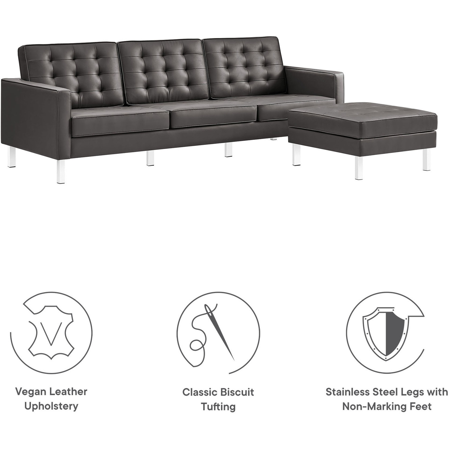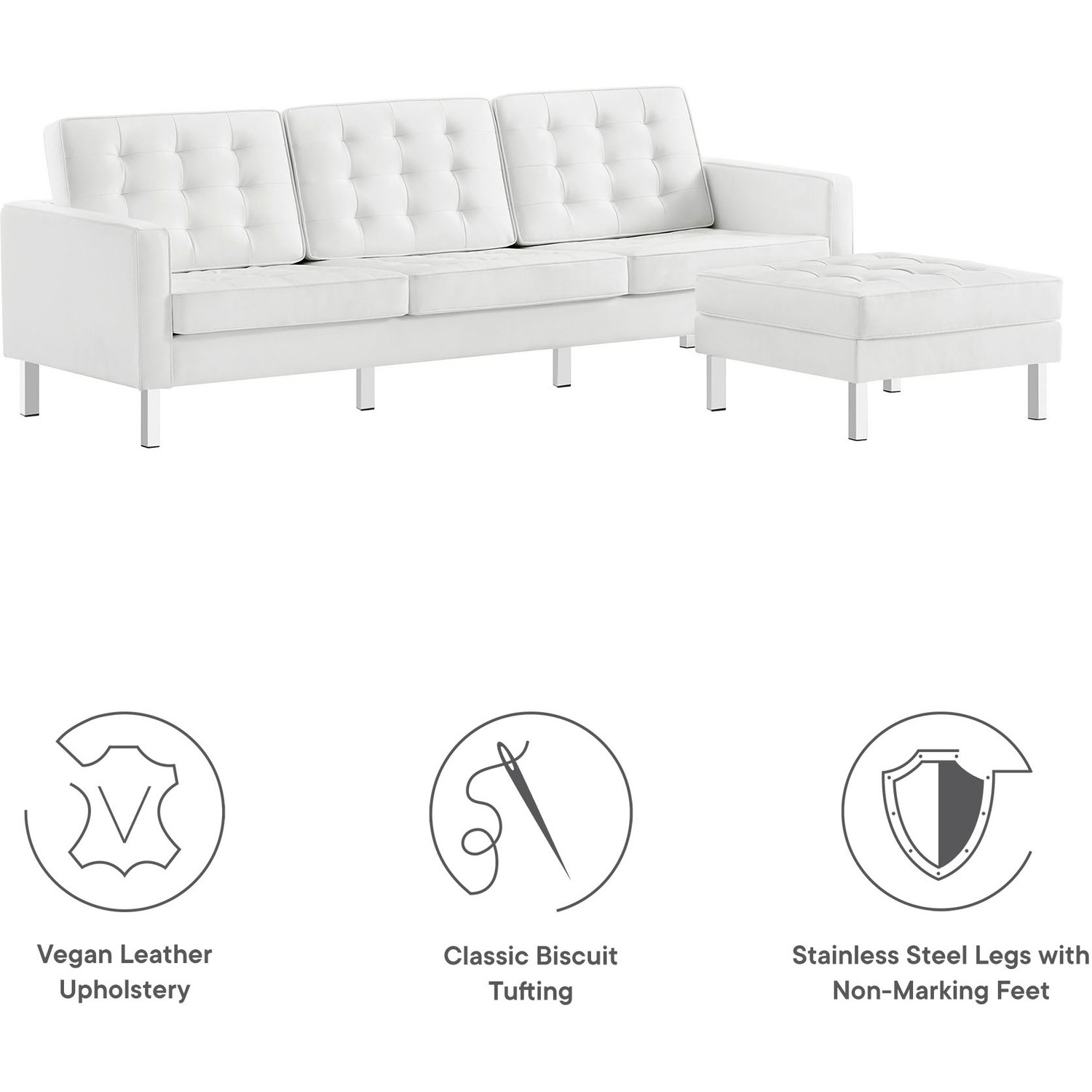 Revolutionize your living room furniture with the iconic Loft Vegan Leather Sofa and Ottoman Set. Adding visual depth to your living room or lounge space, Loft features soft and durable vegan leather upholstery accented with classic biscuit tufting. This modern living room furniture set showcases a captivating linear design, tubular stainless steel legs, and non-marking foot caps that protect flooring. Inspired by the richness of mid-century modern style, this stylish furniture set is an ideal choice for living rooms, office reception areas, and lounge spaces. Assembly required. Set Includes: 1 Sofa, 1 Ottoman.Mid-Century Sofa and Ottoman Set