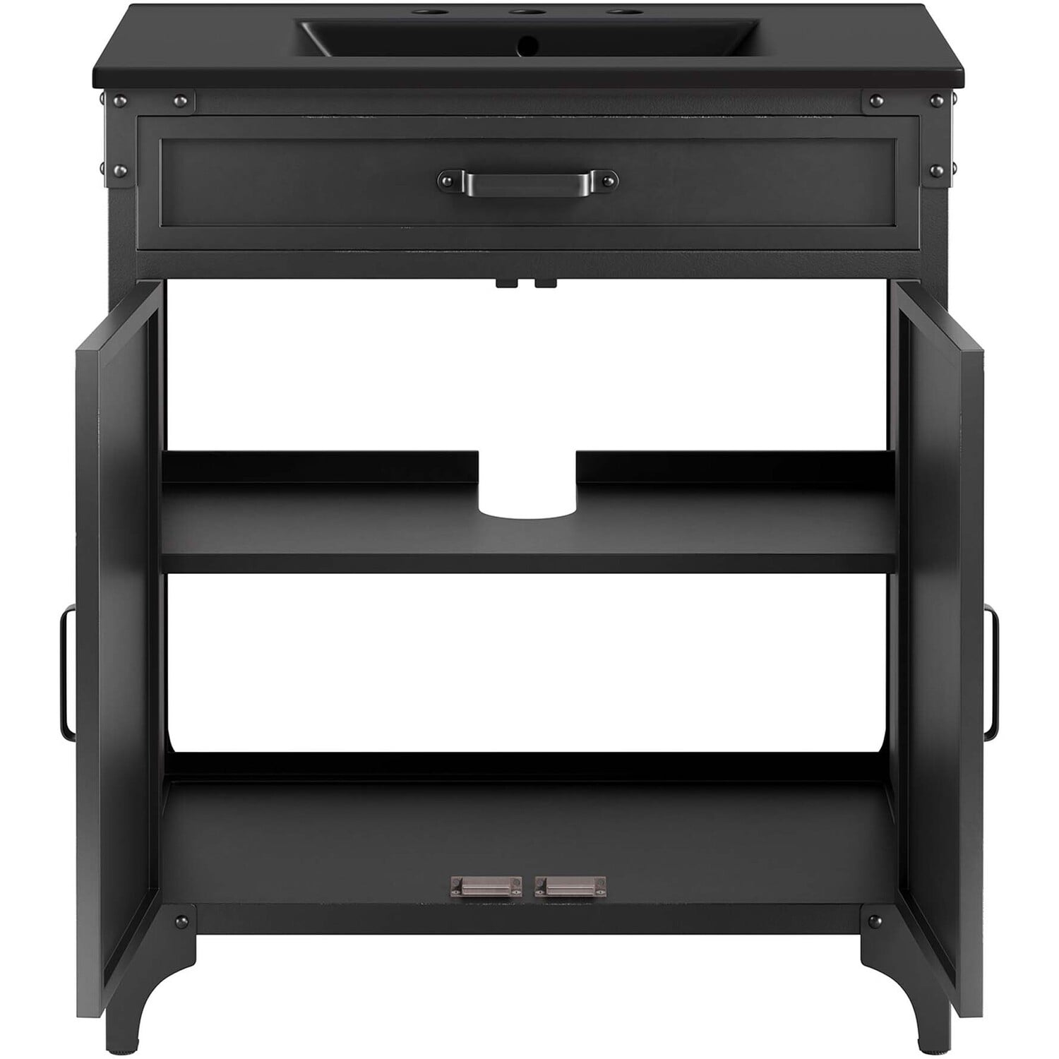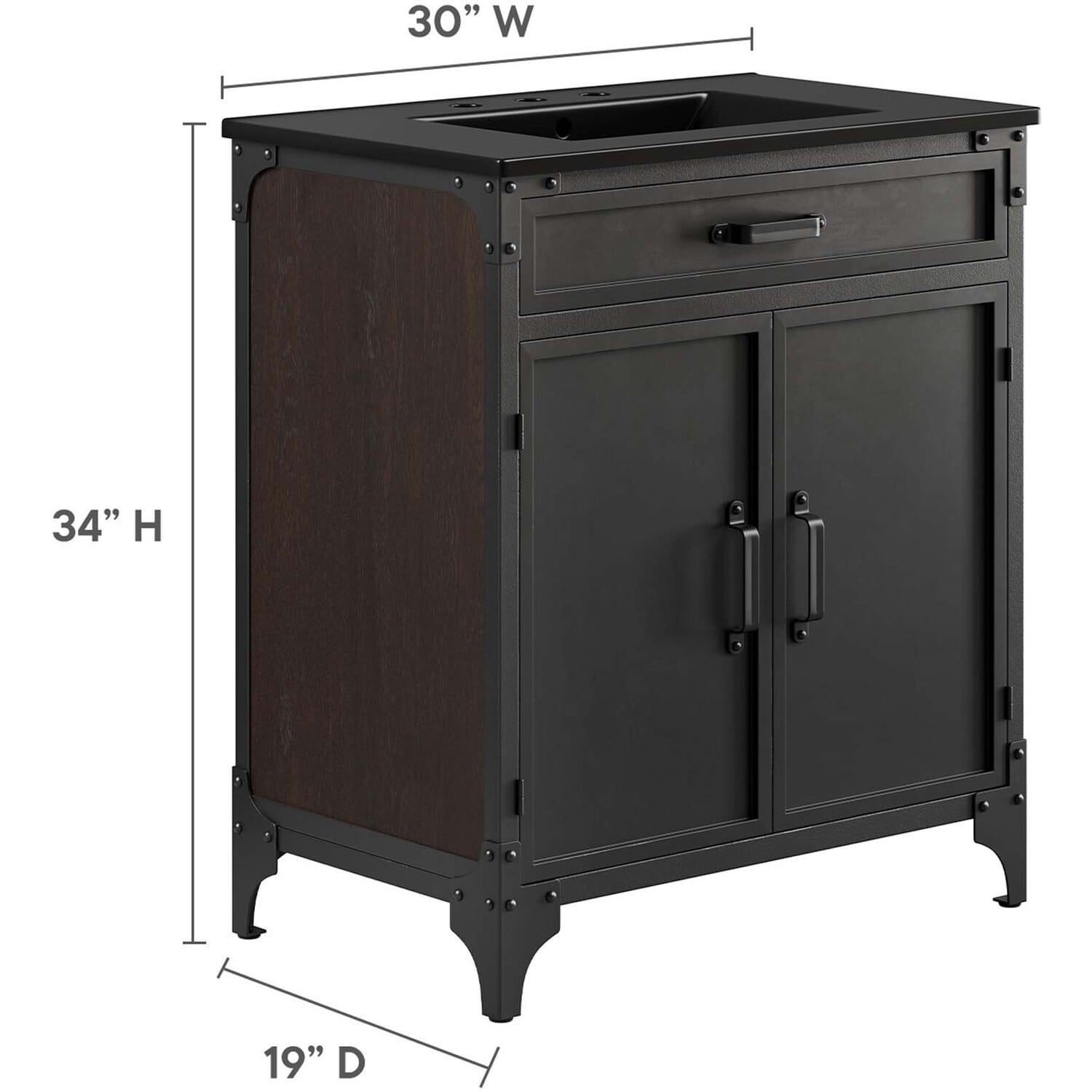 Experience the perfect blend of functionality and industrial modern style with the Steamforge 30" Bathroom Vanity. Crafted from sturdy metal with an antique patina and MDF with a beautiful wood grain veneer, this bathroom vanity cabinet brings a touch of utilitarian elegance to your bathroom decor. With pivot hinged double doors and spacious shelving complete with a plumbing cutout, this vanity provides ample storage space for all your bathroom essentials. The ceramic sink basin boasts an integrated countertop with 8" centerset holes, ready for your chosen fixtures (not included). With non-marking foot pads to protect your flooring, this bathroom vanity offers the ideal balance of design and practicality.Industrial Modern Bathroom Vanity