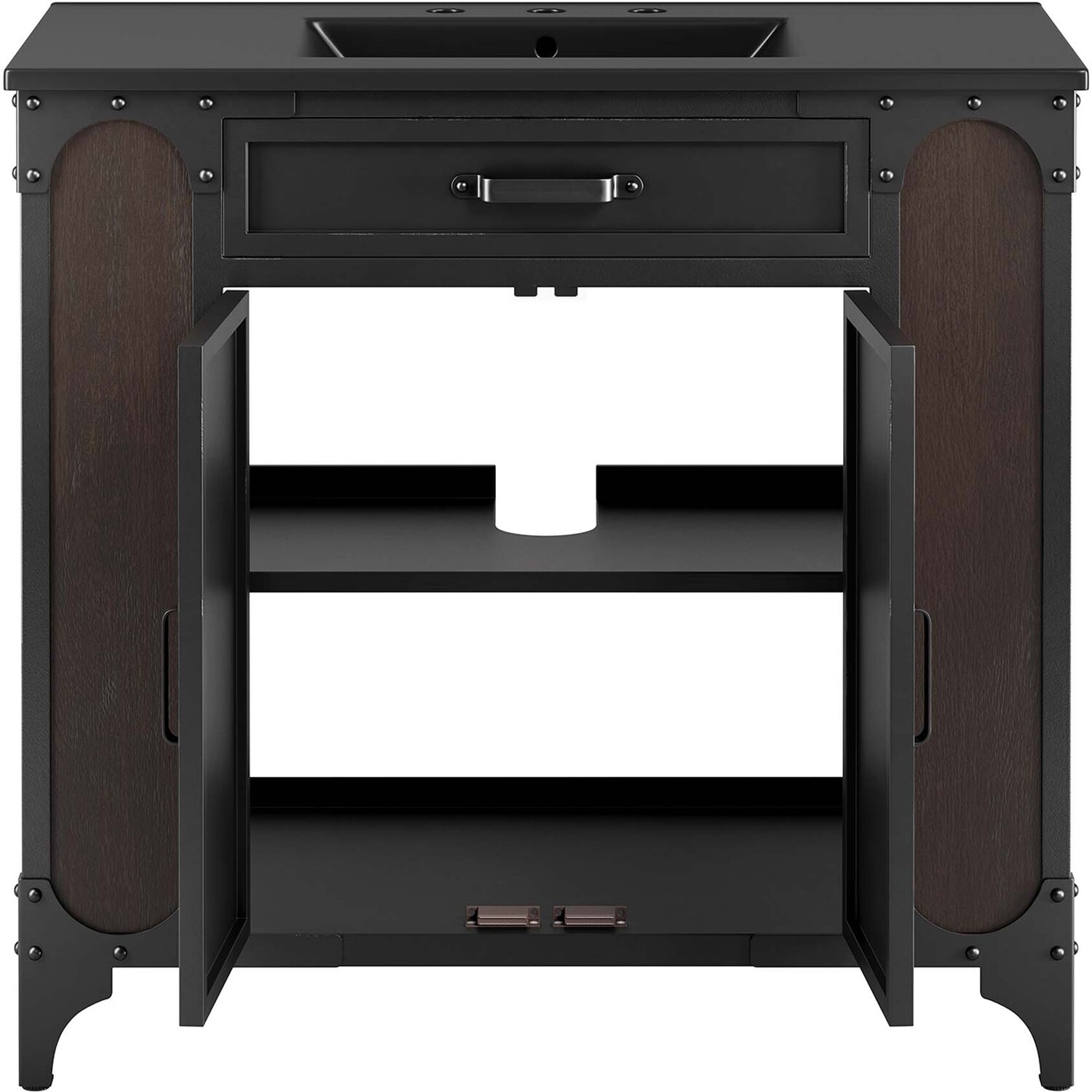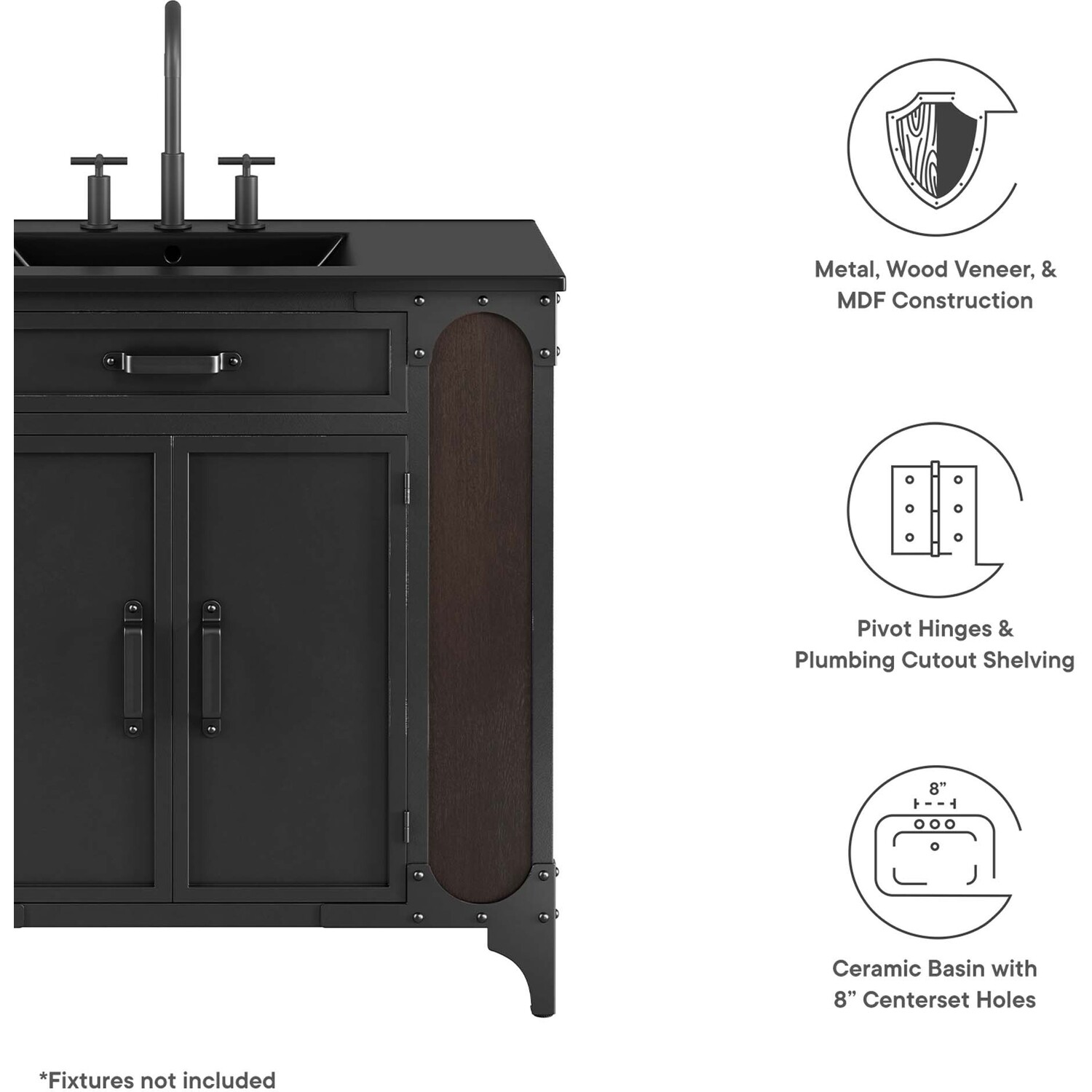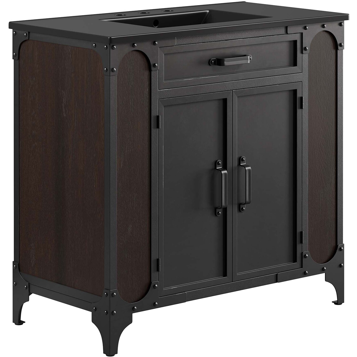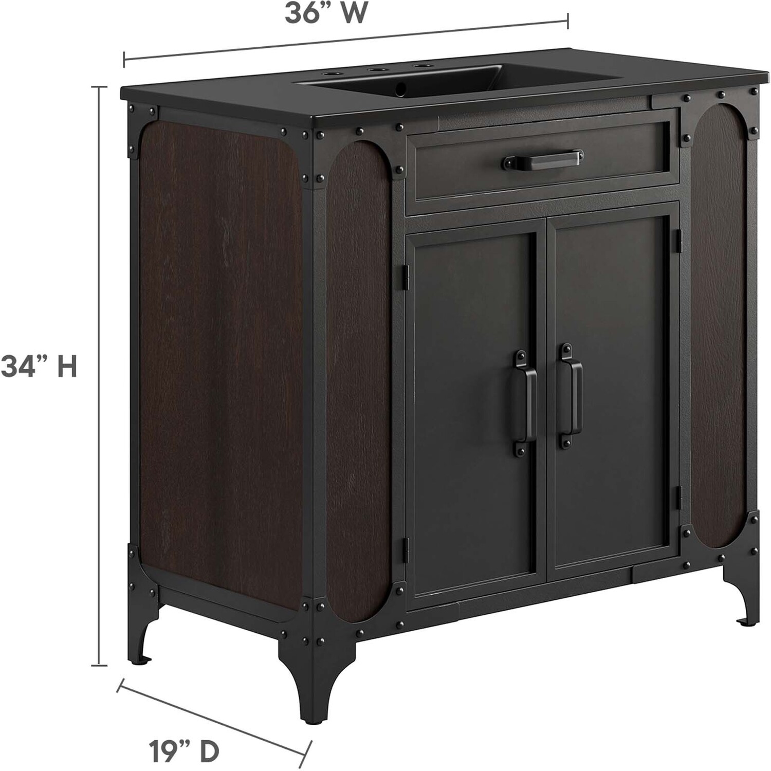 Experience the perfect blend of functionality and industrial modern style with the Steamforge 36" Bathroom Vanity. Crafted from sturdy metal with an antique patina and MDF with a beautiful wood grain veneer, this bathroom vanity cabinet brings a touch of utilitarian elegance to your bathroom decor. With a fixed drawer, pivot hinges on the double doors, and spacious shelving complete with a plumbing cutout, this vanity provides ample storage space for all your bathroom essentials. The ceramic sink basin boasts an integrated countertop with 8" centerset holes, ready for your chosen fixtures (not included). With non-marking foot pads to protect your flooring, this bathroom vanity offers the ideal balance of design and practicality.Industrial Modern Bathroom Vanity