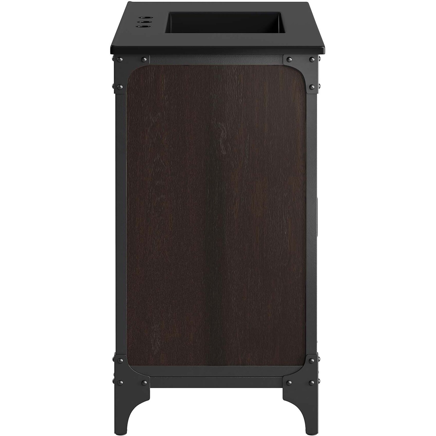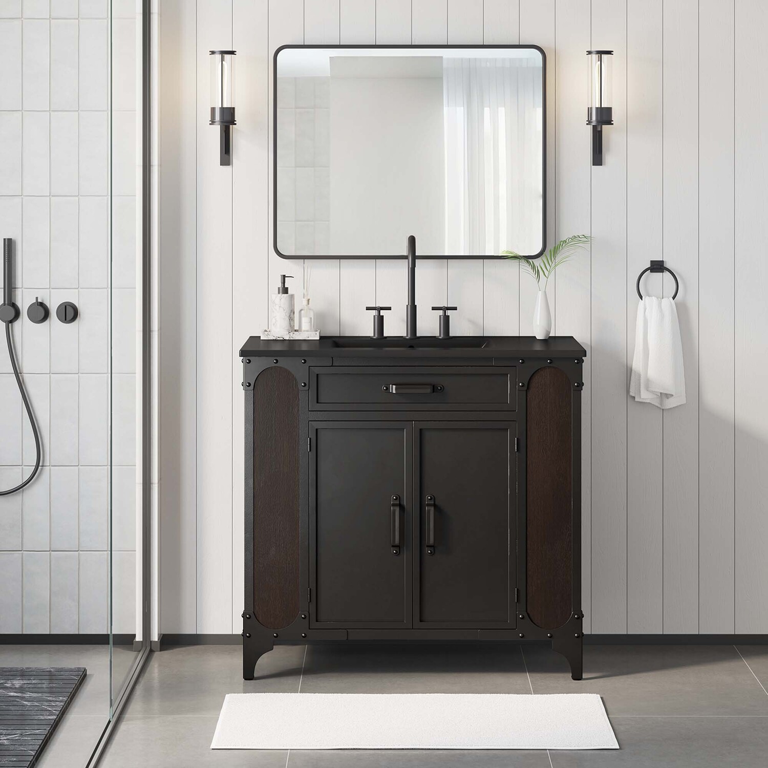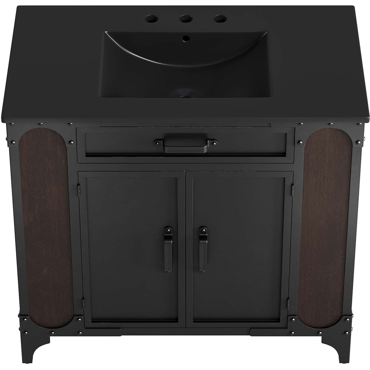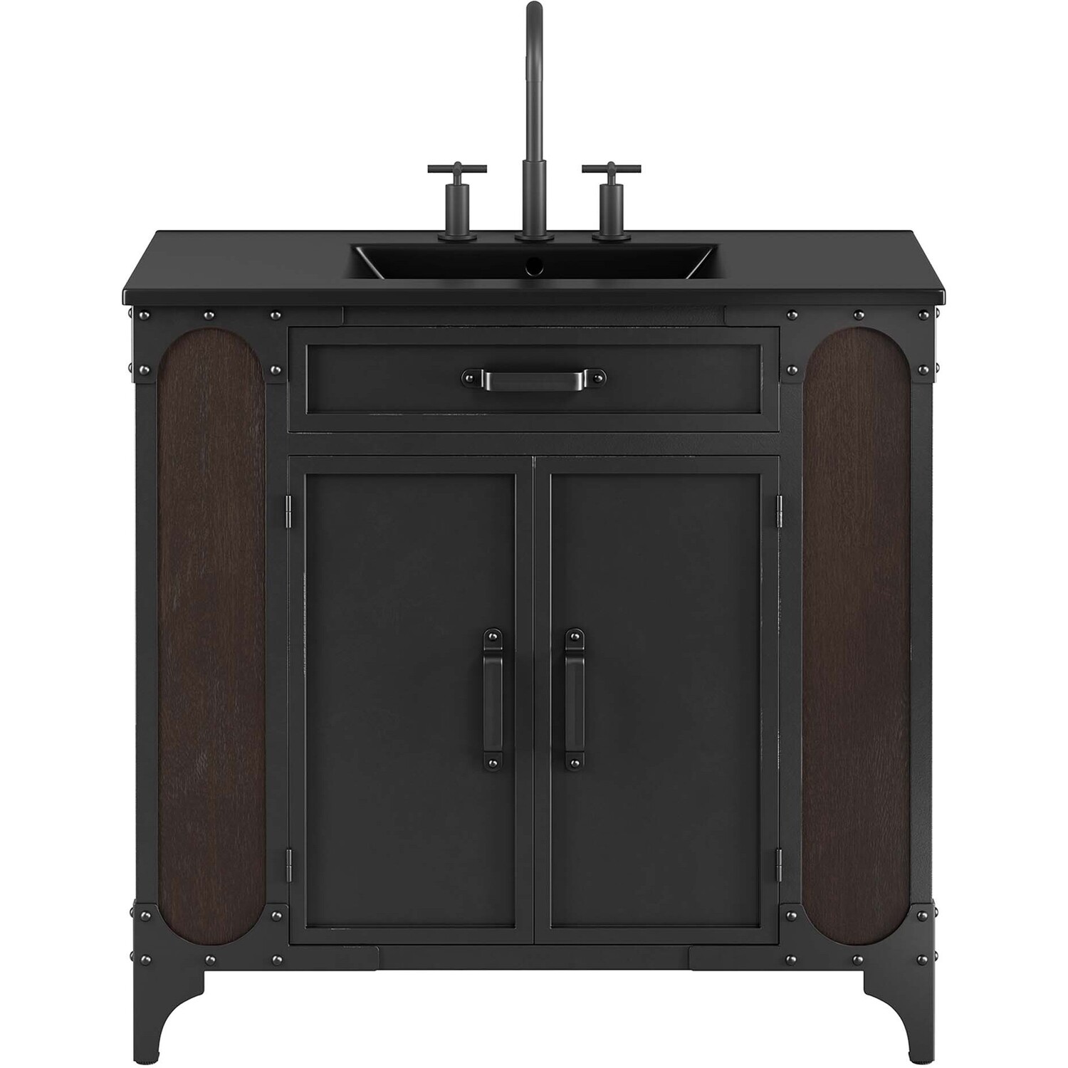 Experience the perfect blend of functionality and industrial modern style with the Steamforge 36" Bathroom Vanity. Crafted from sturdy metal with an antique patina and MDF with a beautiful wood grain veneer, this bathroom vanity cabinet brings a touch of utilitarian elegance to your bathroom decor. With a fixed drawer, pivot hinges on the double doors, and spacious shelving complete with a plumbing cutout, this vanity provides ample storage space for all your bathroom essentials. The ceramic sink basin boasts an integrated countertop with 8" centerset holes, ready for your chosen fixtures (not included). With non-marking foot pads to protect your flooring, this bathroom vanity offers the ideal balance of design and practicality.Industrial Modern Bathroom Vanity