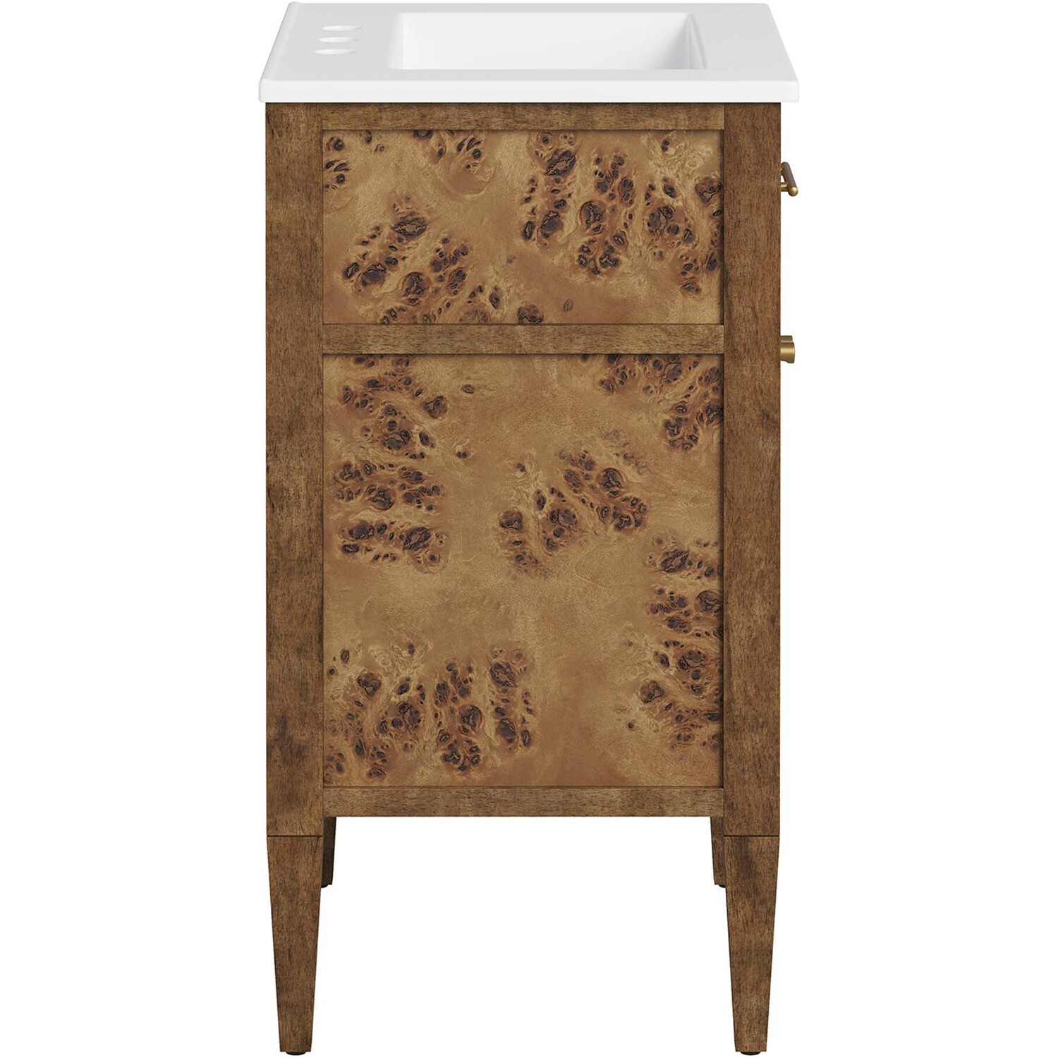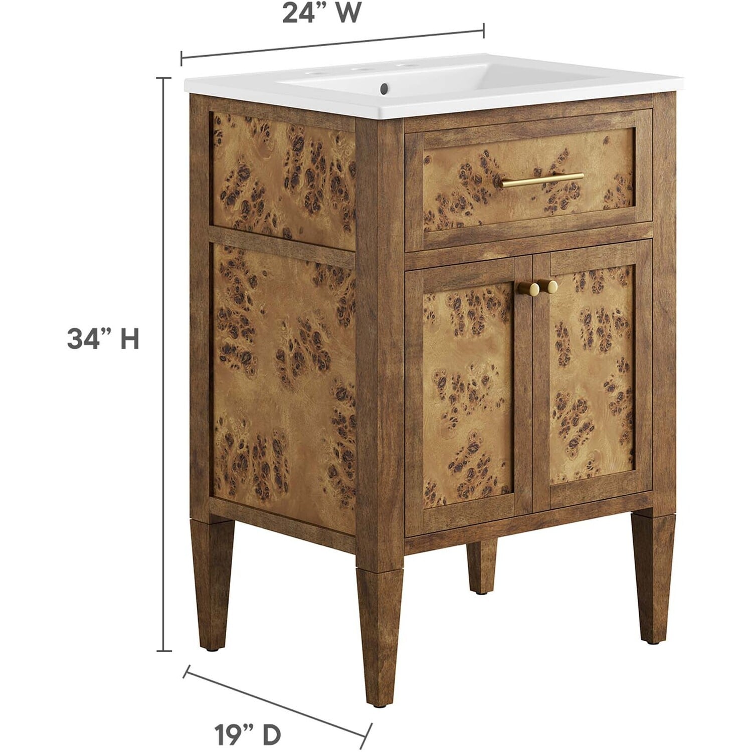 Discover the epitome of organic aesthetics and practicality with the Elysian 24" Burl Wood Bathroom Vanity. Each vanity cabinet is uniquely crafted from exquisite mango wood, further adorned with a rich burl wood veneer, radiating a distinctive charm and character. This bathroom vanity's centerpiece is an elegant ceramic sink basin, thoughtfully designed with an integrated countertop and 8" centerset holes ready for your choice of fixtures (not included). A fixed top drawer and tapered wood legs add to the sleek design, while the spacious shelving beneath–complete with a convenient plumbing cutout–offers ample storage space for all your bathroom essentials. While assembly is required, this vanity includes easy-to-follow assembly instructions.Modern Bathroom Vanity