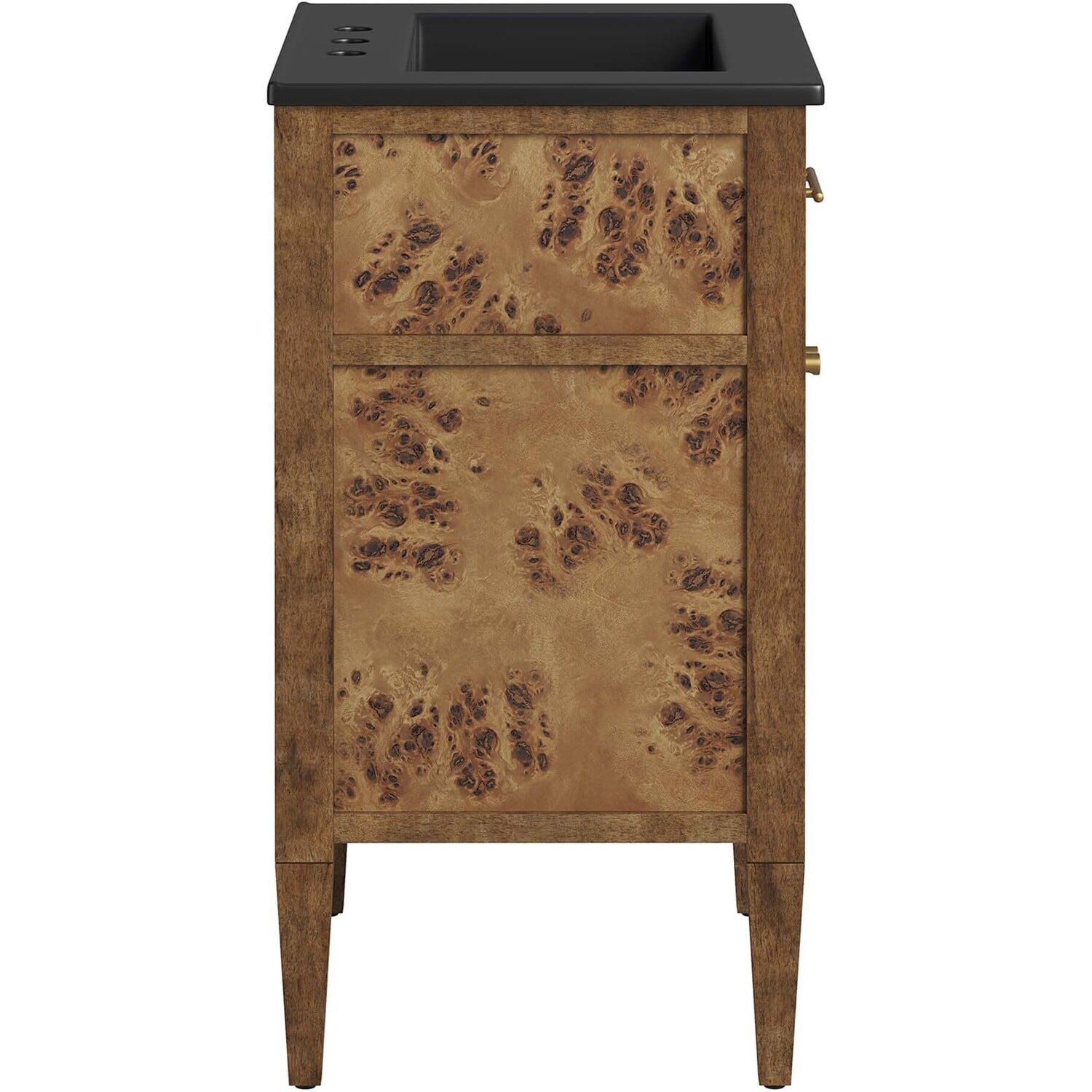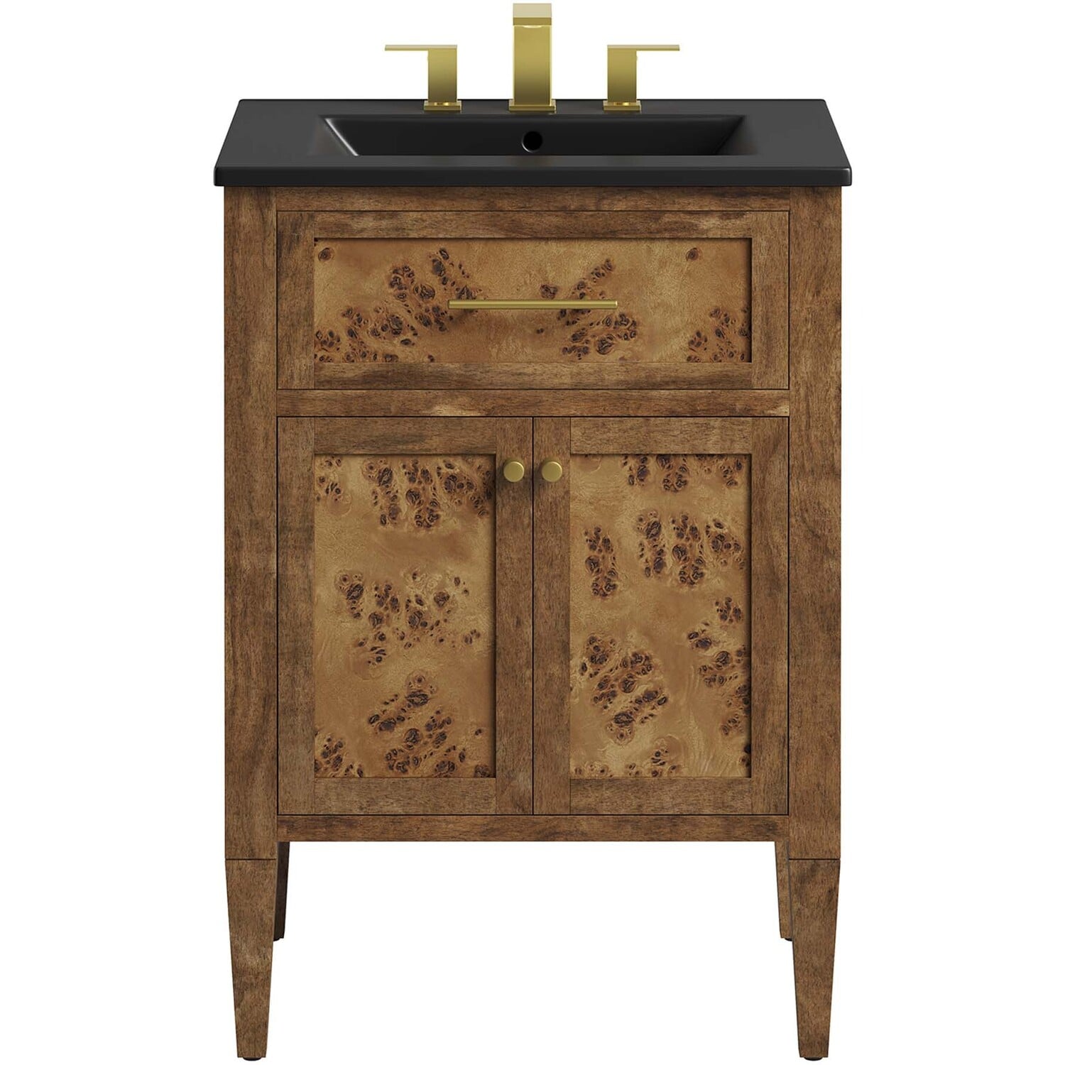 Discover the epitome of organic aesthetics and practicality with the Elysian 24" Burl Wood Bathroom Vanity. Each vanity cabinet is uniquely crafted from exquisite mango wood, further adorned with a rich burl wood veneer, radiating a distinctive charm and character. This bathroom vanity's centerpiece is an elegant ceramic sink basin, thoughtfully designed with an integrated countertop and 8" centerset holes ready for your choice of fixtures (not included). A fixed top drawer and tapered wood legs add to the sleek design, while the spacious shelving beneath–complete with a convenient plumbing cutout–offers ample storage space for all your bathroom essentials. While assembly is required, this vanity includes easy-to-follow assembly instructions.Modern Bathroom Vanity