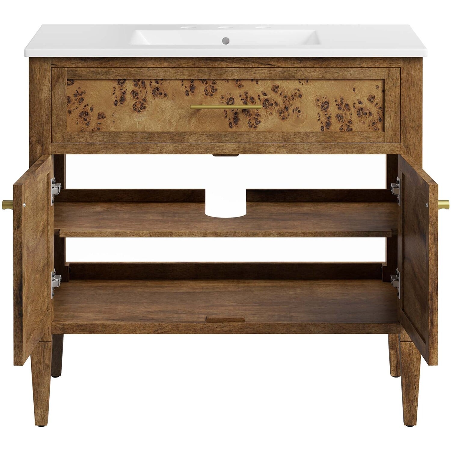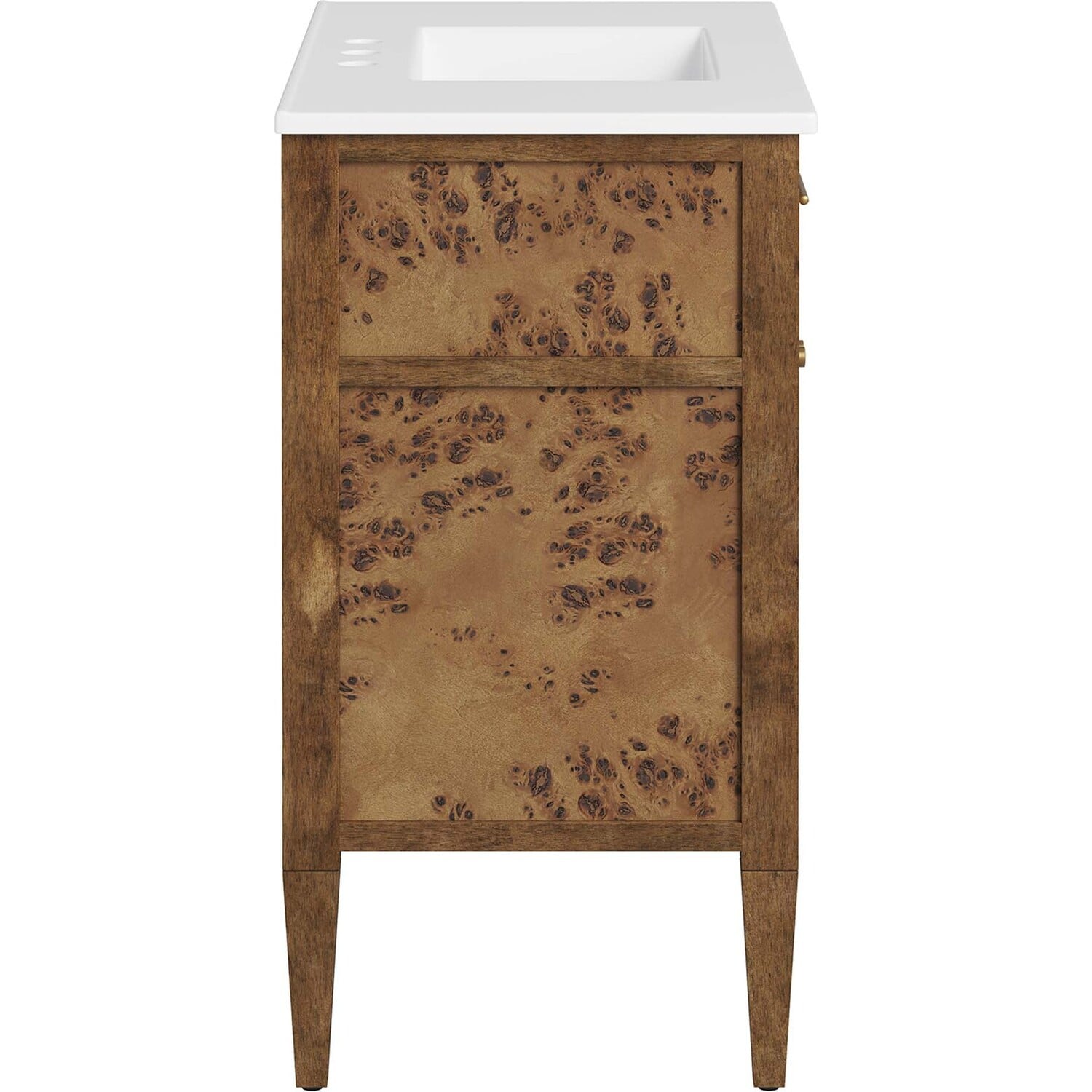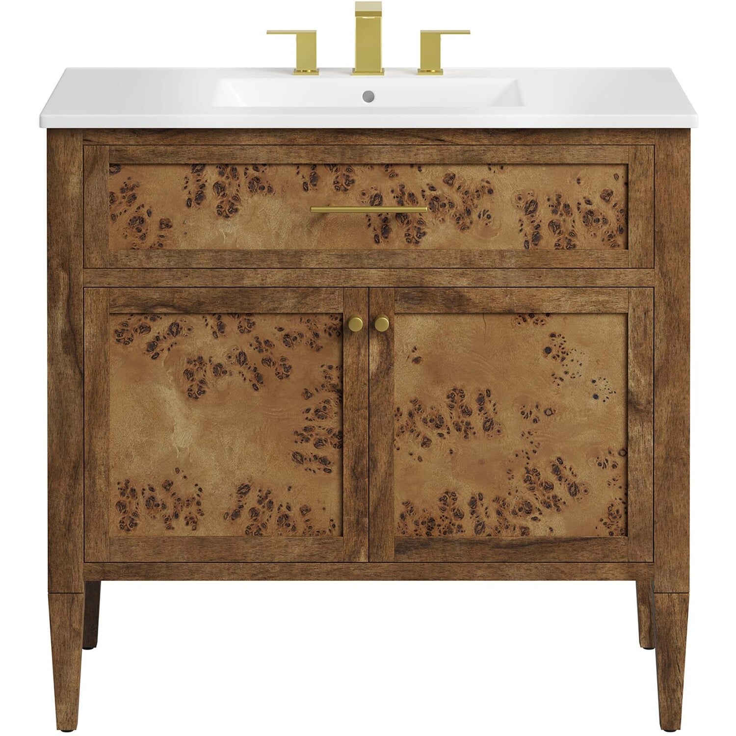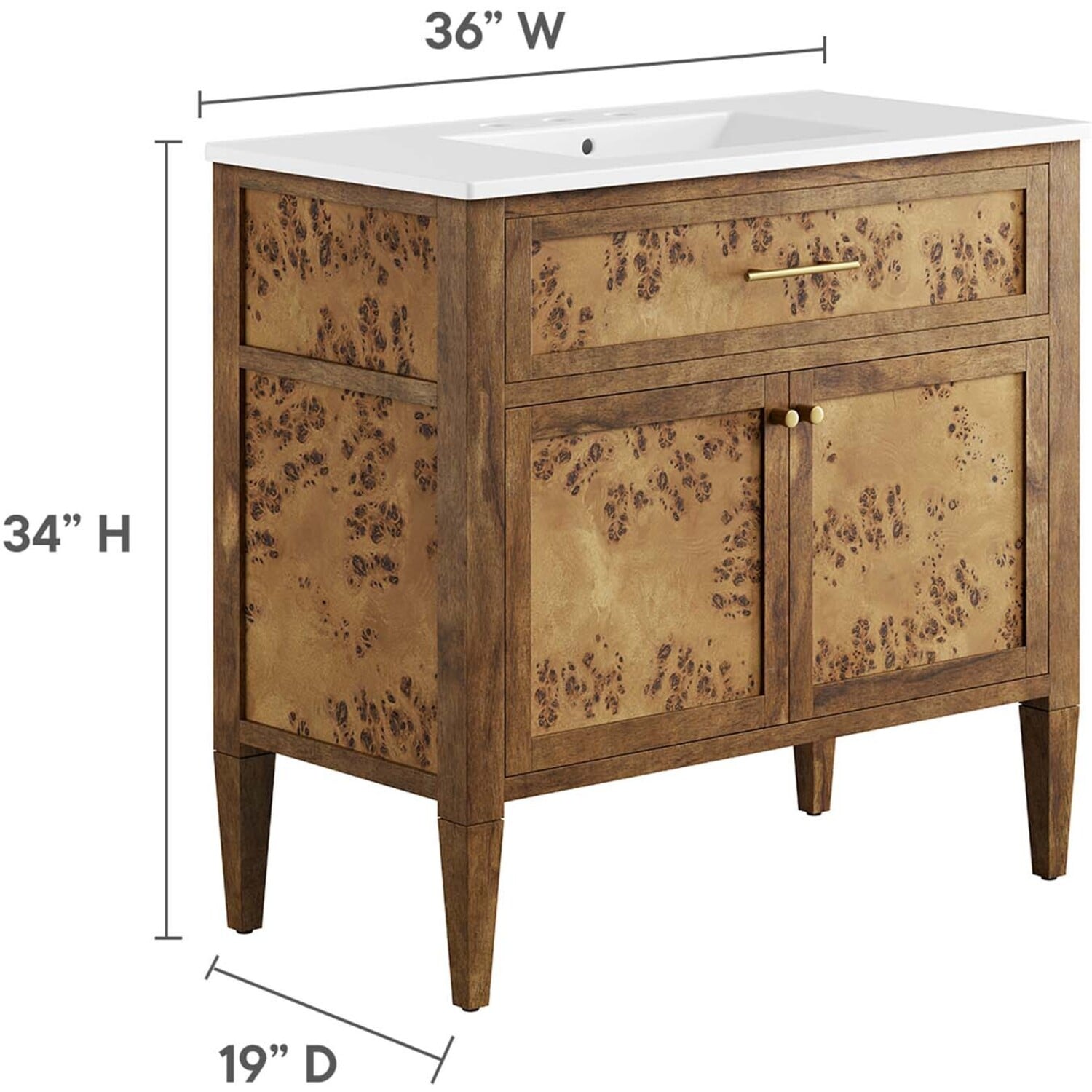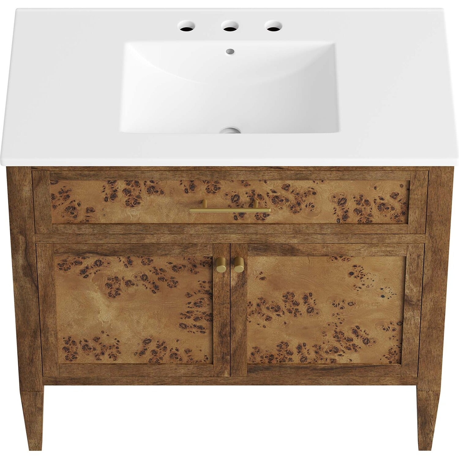 Discover the epitome of organic aesthetics and practicality with the Elysian 36" Burl Wood Bathroom Vanity. Each vanity cabinet is uniquely crafted from exquisite mango wood, further adorned with a rich burl wood veneer, radiating a distinctive charm and character. This bathroom vanity's centerpiece is an elegant ceramic sink basin, thoughtfully designed with an integrated countertop and 8" centerset holes ready for your choice of fixtures (not included). A fixed top drawer and tapered wood legs add to the sleek design, while the spacious shelving beneath–complete with a convenient plumbing cutout–offers ample storage space for all your bathroom essentials. While assembly is required, this vanity includes easy-to-follow assembly instructions.Modern Bathroom Vanity