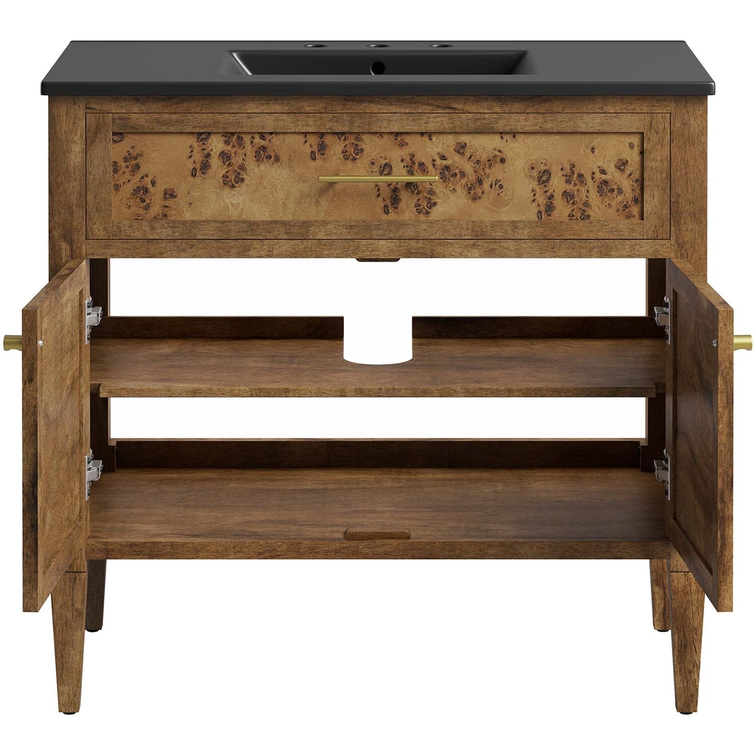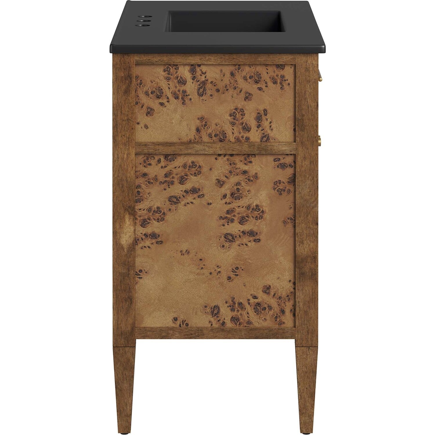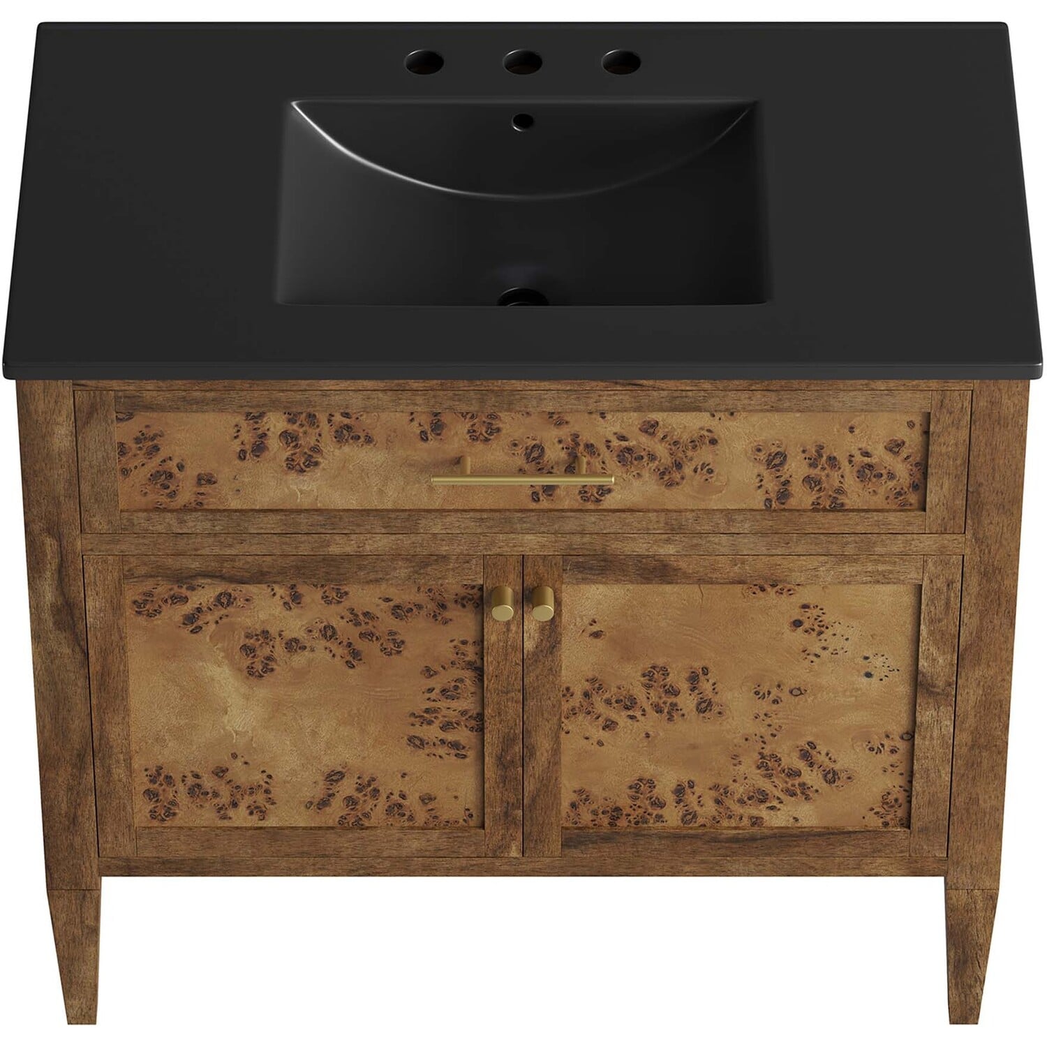 Discover the epitome of organic aesthetics and practicality with the Elysian 36" Burl Wood Bathroom Vanity. Each vanity cabinet is uniquely crafted from exquisite mango wood, further adorned with a rich burl wood veneer, radiating a distinctive charm and character. This bathroom vanity's centerpiece is an elegant ceramic sink basin, thoughtfully designed with an integrated countertop and 8" centerset holes ready for your choice of fixtures (not included). A fixed top drawer and tapered wood legs add to the sleek design, while the spacious shelving beneath–complete with a convenient plumbing cutout–offers ample storage space for all your bathroom essentials. While assembly is required, this vanity includes easy-to-follow assembly instructions.Modern Bathroom Vanity