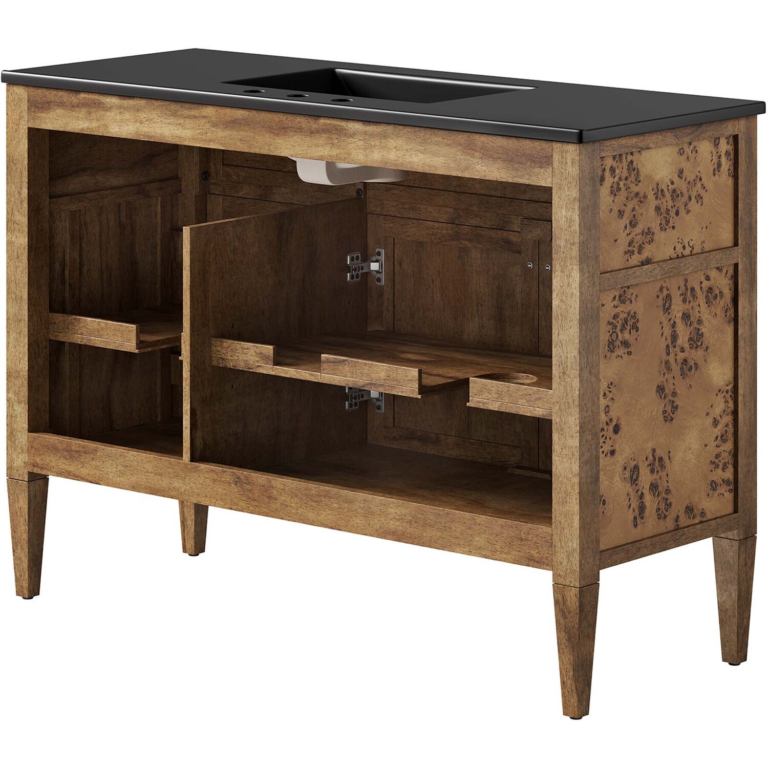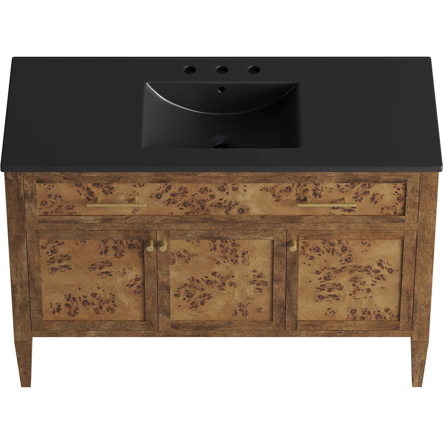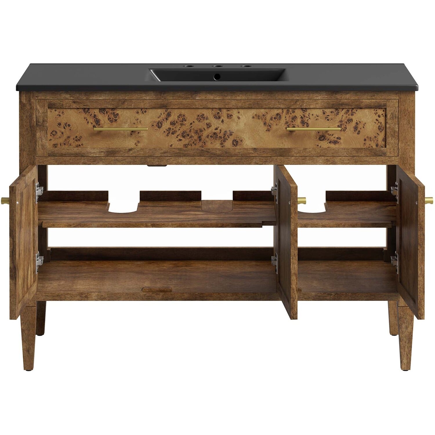 Discover the epitome of organic aesthetics and practicality with the Elysian 48" Burl Wood Single Sink Bathroom Vanity. Each vanity cabinet is uniquely crafted from exquisite mango wood, further adorned with a rich burl wood veneer, radiating a distinctive charm and character. This bathroom vanity's centerpiece is an elegant ceramic single sink basin, thoughtfully designed with an integrated countertop and 8" centerset holes ready for your choice of fixtures (not included). A fixed top drawer and tapered wood legs add to the sleek design, while the spacious shelving beneath–complete with a convenient plumbing cutout–offers ample storage space for all your bathroom essentials. While assembly is required, this vanity includes easy-to-follow assembly instructions.Modern Bathroom Vanity