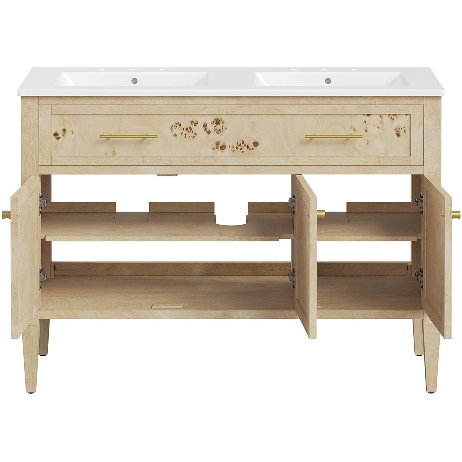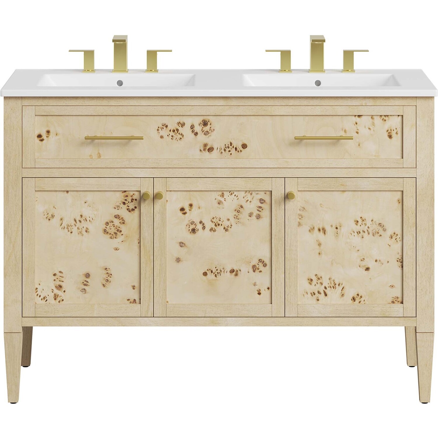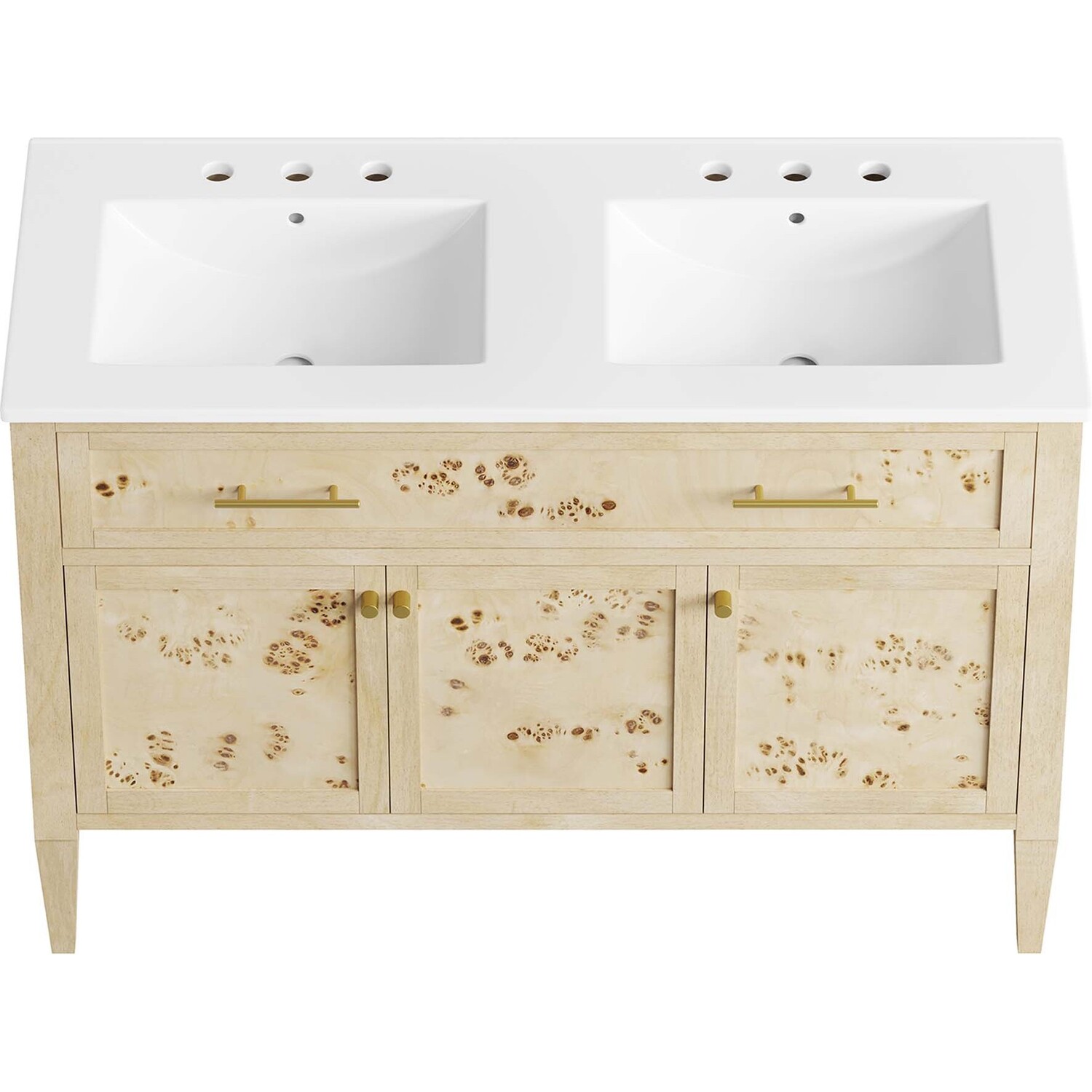 Discover the epitome of organic aesthetics and practicality with the Elysian 48" Burl Wood Dual Sink Bathroom Vanity. Each vanity cabinet is uniquely crafted from exquisite mango wood, further adorned with a rich burl wood veneer, radiating a distinctive charm and character. This bathroom vanity features an elegant ceramic double sink basin, thoughtfully designed with an integrated countertop and 8" centerset holes ready for your choice of fixtures (not included). A fixed top drawer and tapered wood legs add to the sleek design, while the spacious shelving beneath–complete with a convenient plumbing cutout–offers ample storage space for all your bathroom essentials. While assembly is required, this vanity includes easy-to-follow assembly instructions.Modern Bathroom Vanity