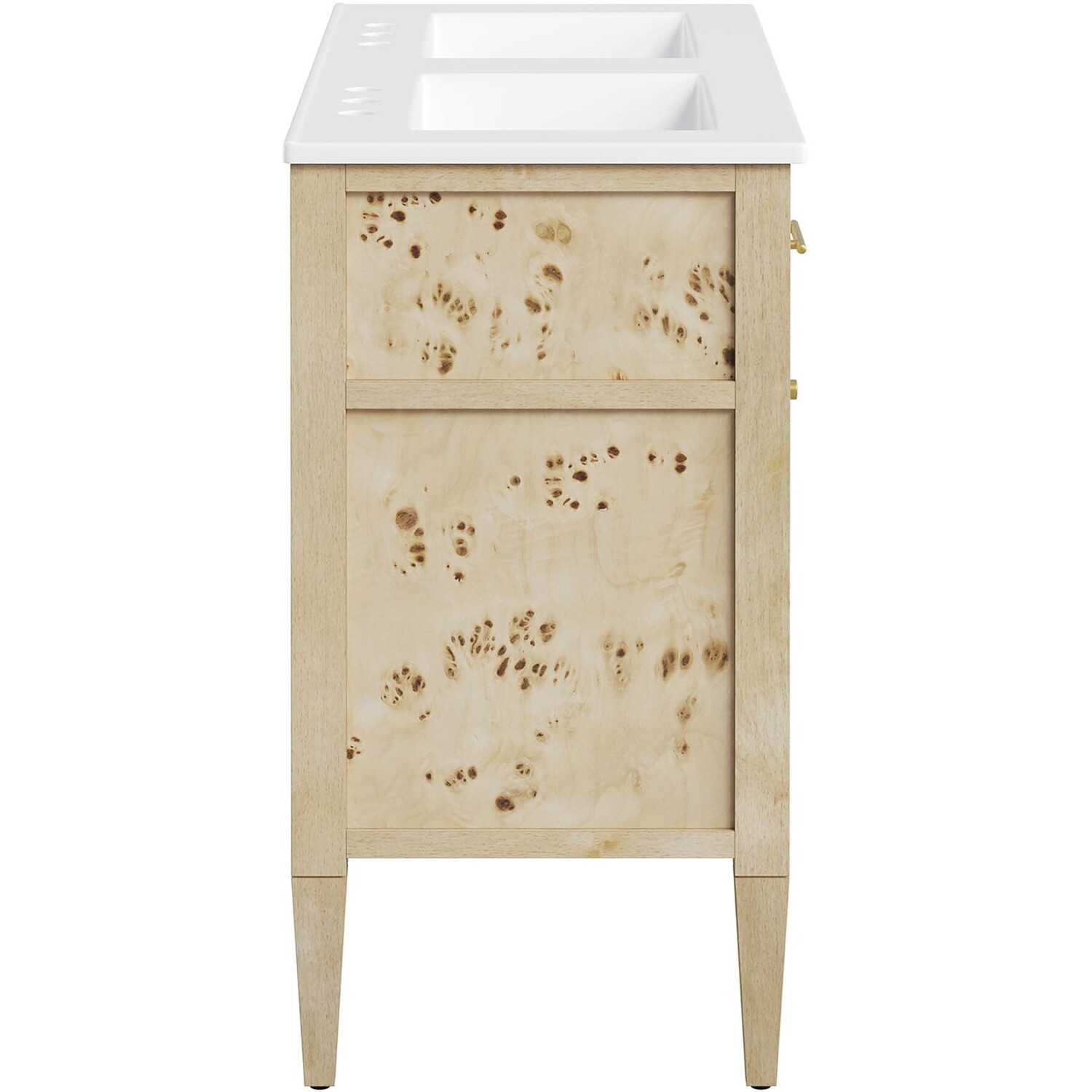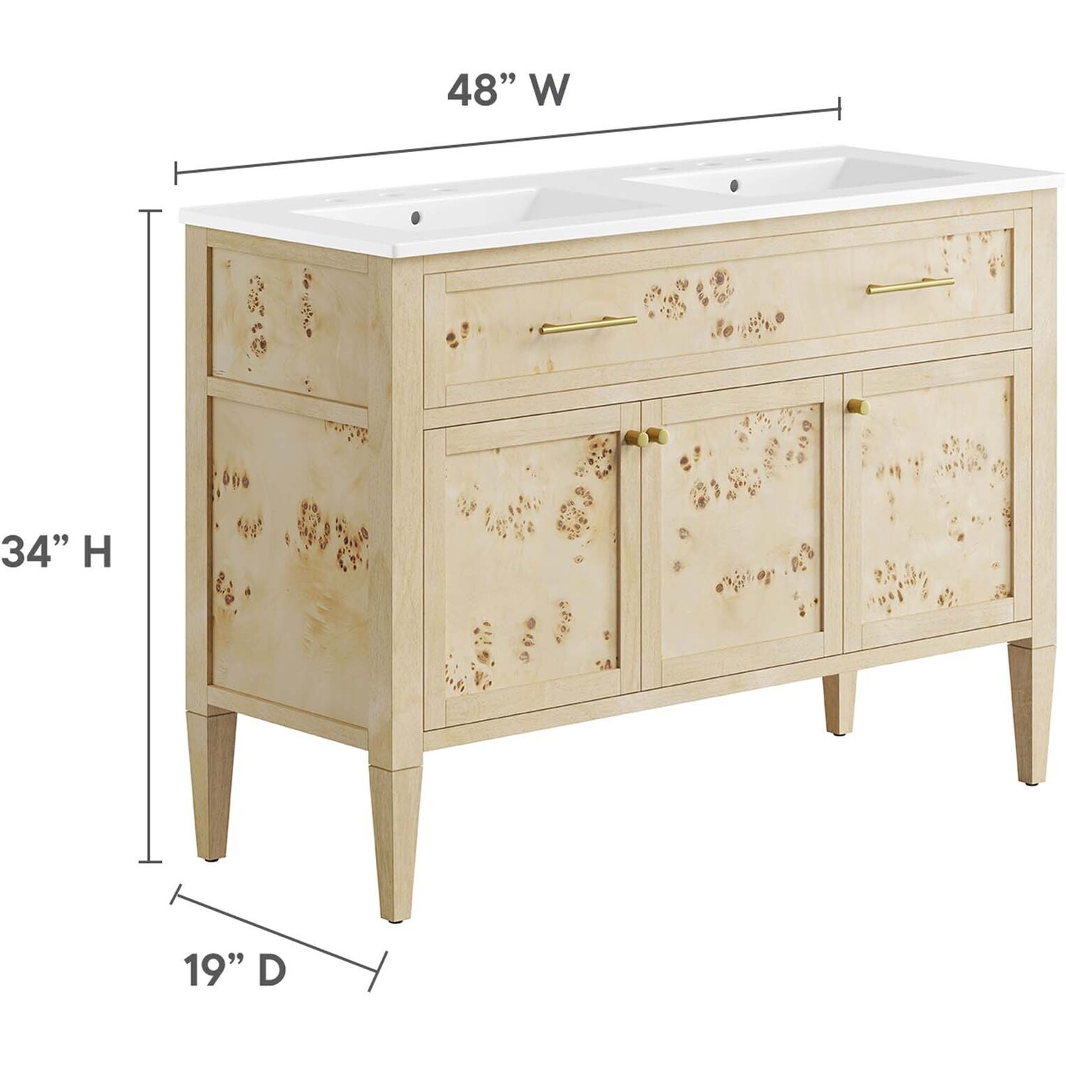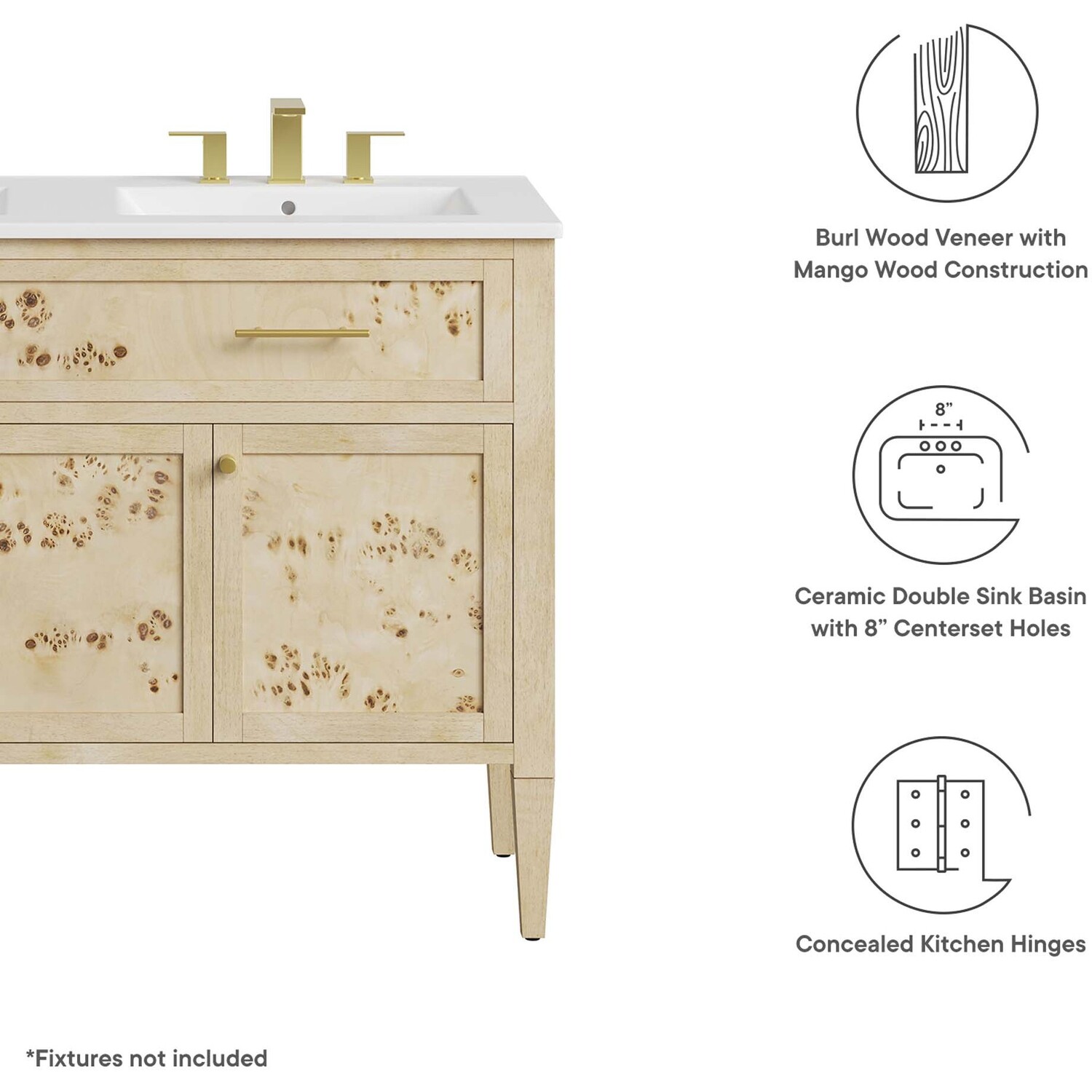 Discover the epitome of organic aesthetics and practicality with the Elysian 48" Burl Wood Dual Sink Bathroom Vanity. Each vanity cabinet is uniquely crafted from exquisite mango wood, further adorned with a rich burl wood veneer, radiating a distinctive charm and character. This bathroom vanity features an elegant ceramic double sink basin, thoughtfully designed with an integrated countertop and 8" centerset holes ready for your choice of fixtures (not included). A fixed top drawer and tapered wood legs add to the sleek design, while the spacious shelving beneath–complete with a convenient plumbing cutout–offers ample storage space for all your bathroom essentials. While assembly is required, this vanity includes easy-to-follow assembly instructions.Modern Bathroom Vanity