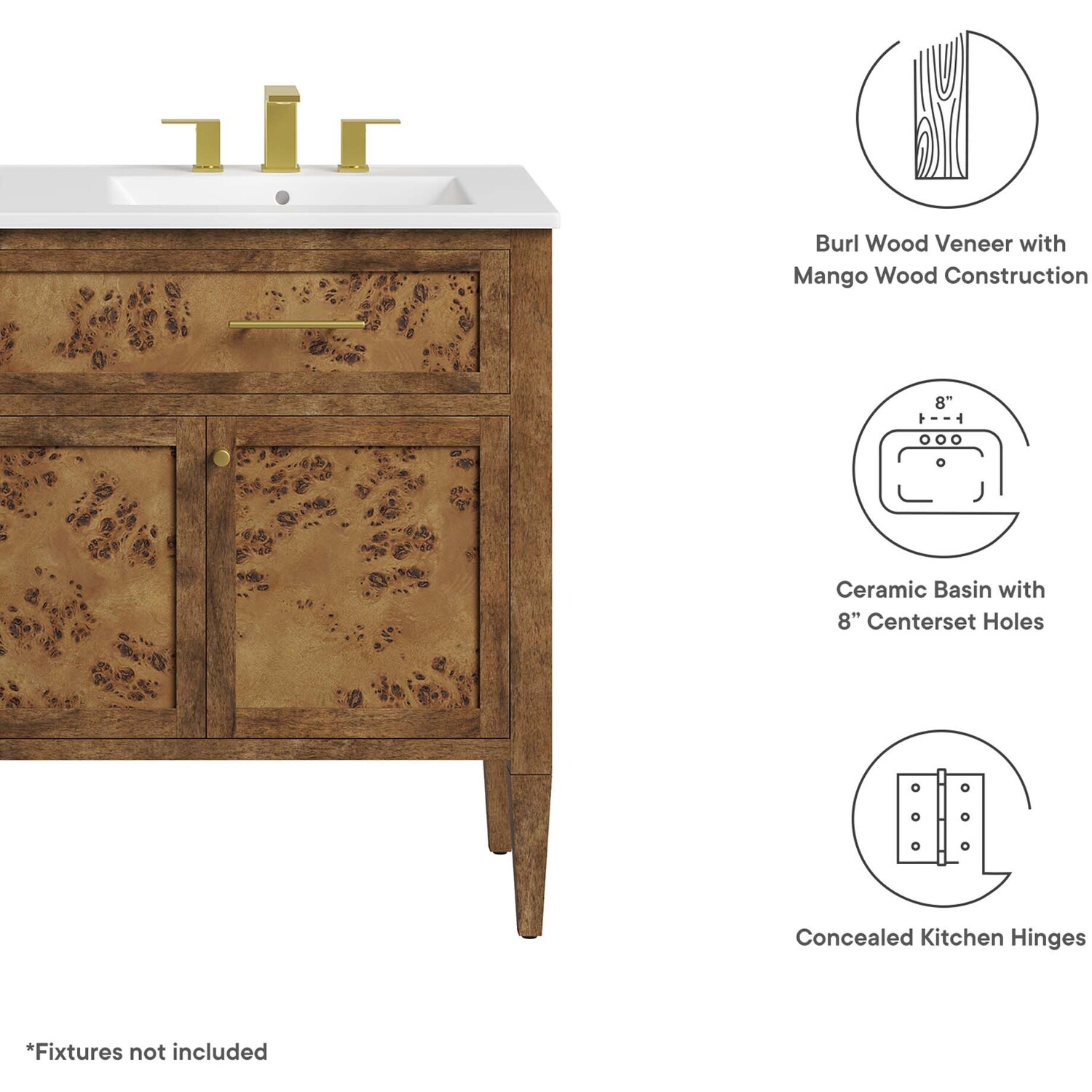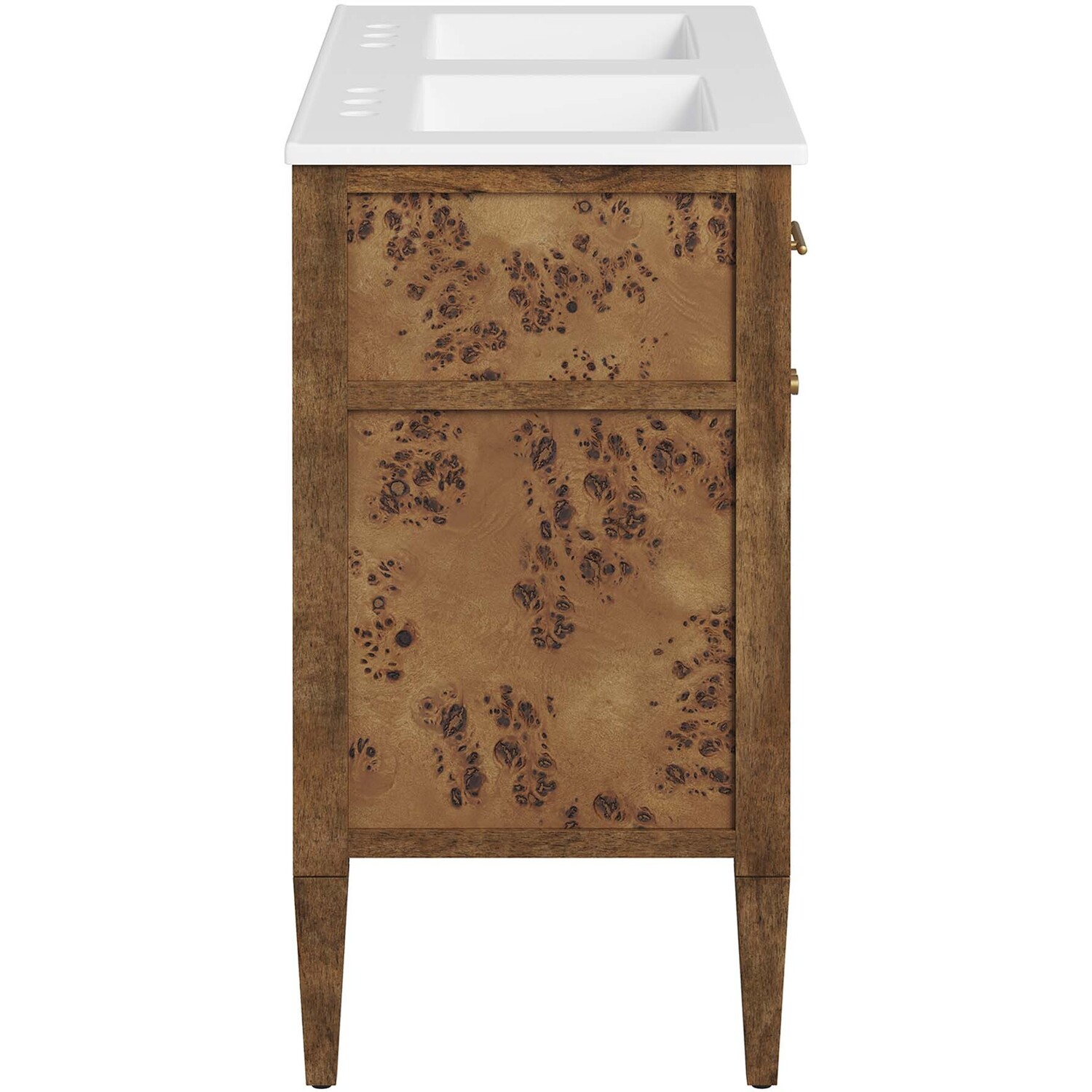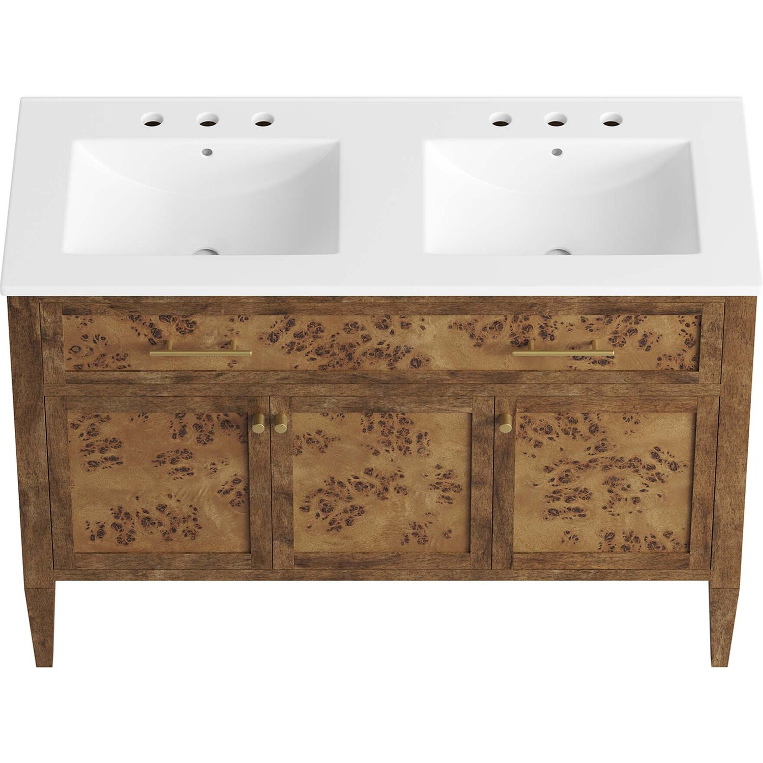 Discover the epitome of organic aesthetics and practicality with the Elysian 48" Burl Wood Double Sink Bathroom Vanity. Each vanity cabinet is uniquely crafted from exquisite mango wood, further adorned with a rich burl wood veneer, radiating a distinctive charm and character. This bathroom vanity's centerpiece is an elegant ceramic double sink basin, thoughtfully designed with an integrated countertop and 8" centerset holes ready for your choice of fixtures (not included). A fixed top drawer and tapered wood legs add to the sleek design, while the spacious shelving beneath–complete with a convenient plumbing cutout–offers ample storage space for all your bathroom essentials. While assembly is required, this vanity includes easy-to-follow assembly instructions.Modern Bathroom Vanity