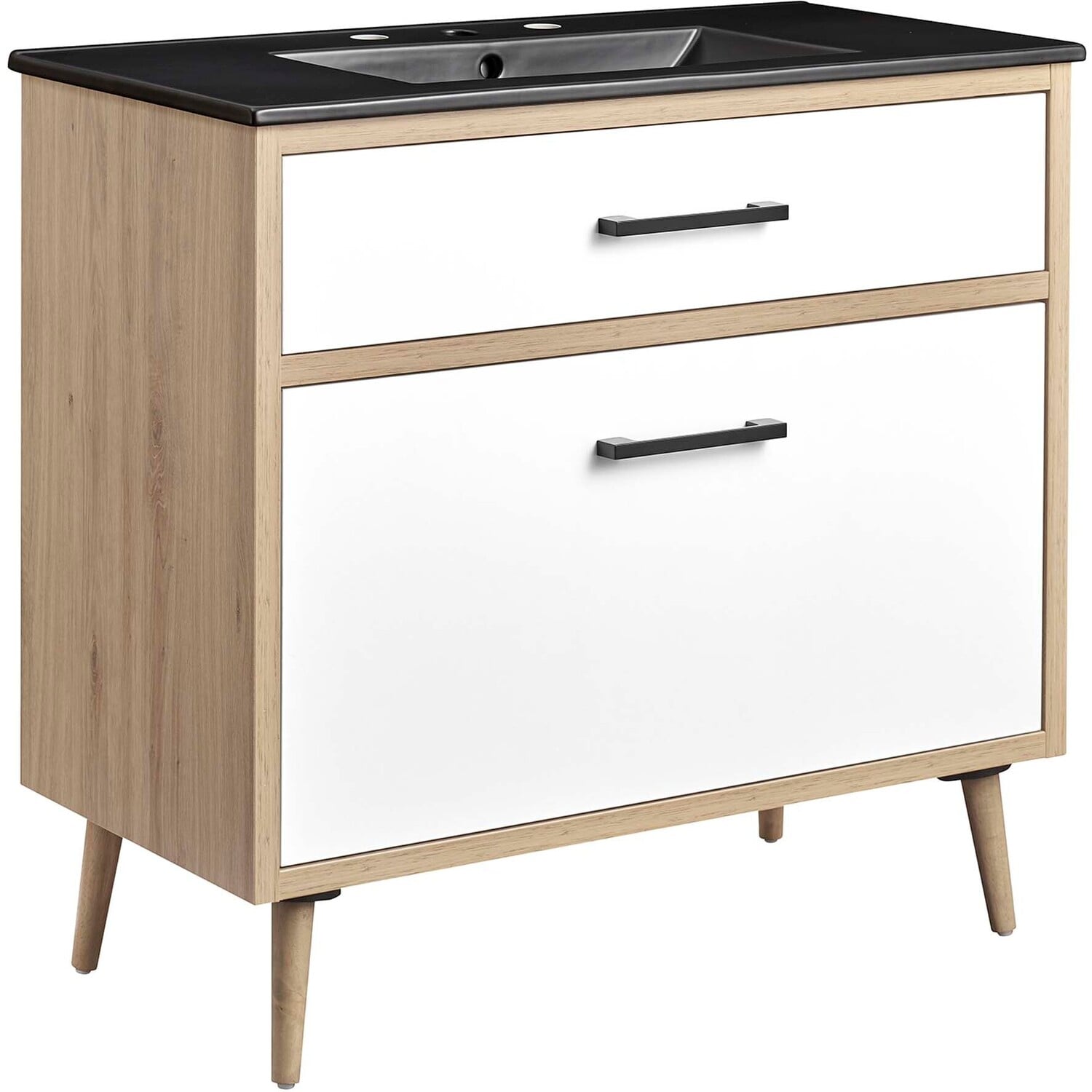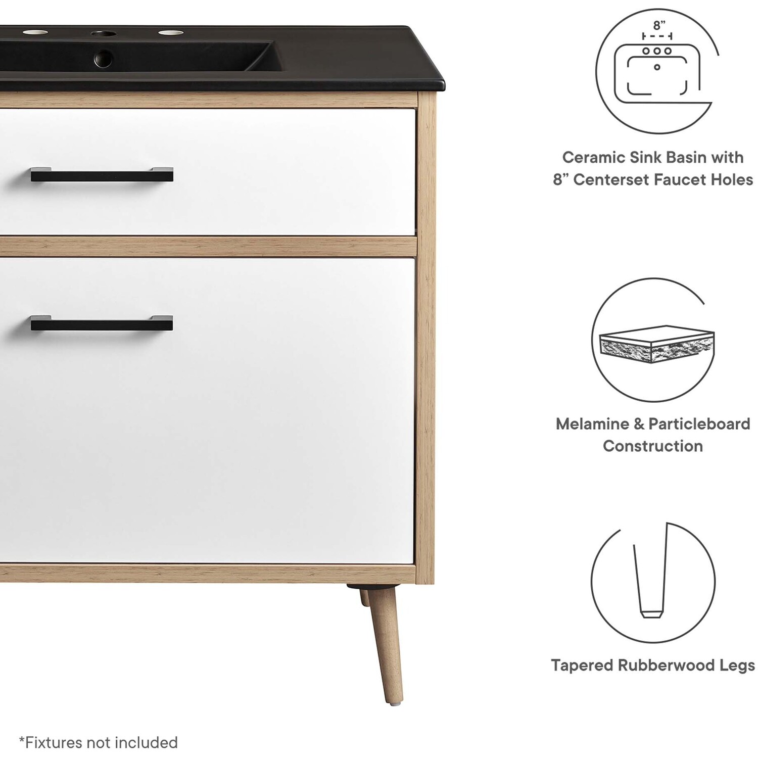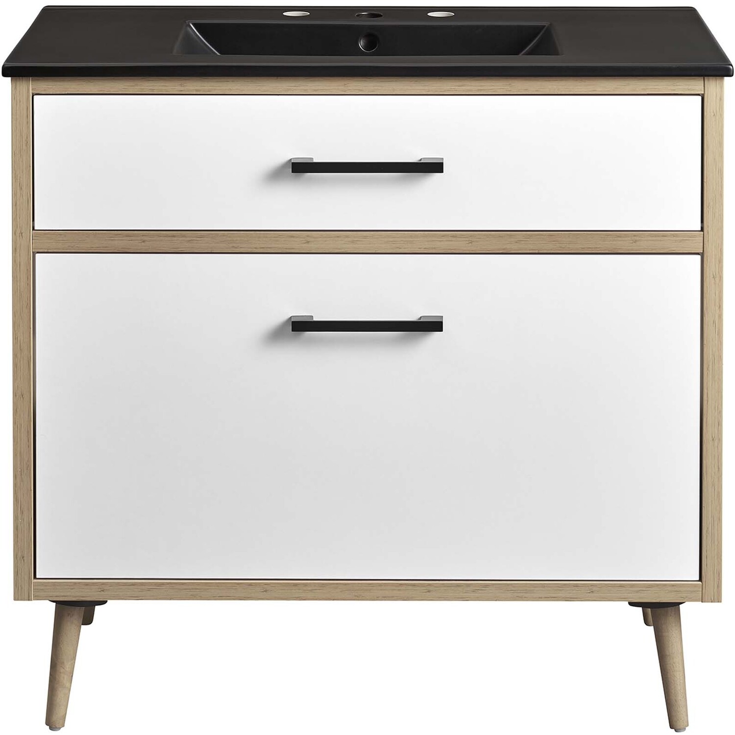 The Maverick 36" Bathroom Vanity is the perfect blend of modern style and convenience. Crafted with particleboard and melamine, the simple yet elegant design is enhanced by modern metal handle pulls and tapered and splayed rubberwood legs. The spacious full-glide bottom drawer provides plenty of storage space for all your bathroom essentials, while the fixed top drawer adds complementing style. This bathroom vanity cabinet features a ceramic sink basin with an integrated countertop and 8" centerset faucet holes. This bathroom vanity instantly transforms your space, creating a beautiful, modern look that will last for years. Includes non-marking foot glides to protect flooring. Assembly required. Fixtures not included.Modern 36" Bathroom Vanity