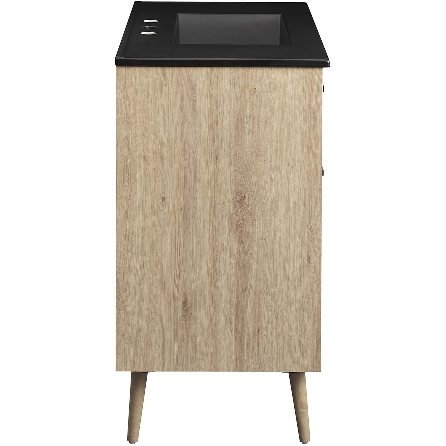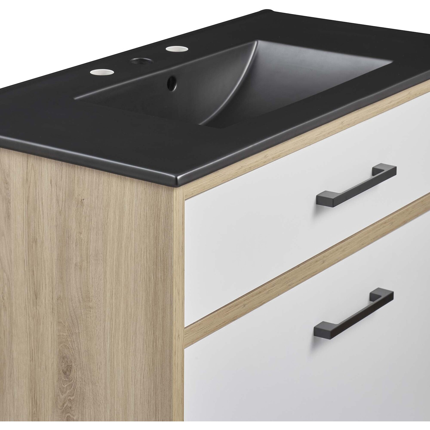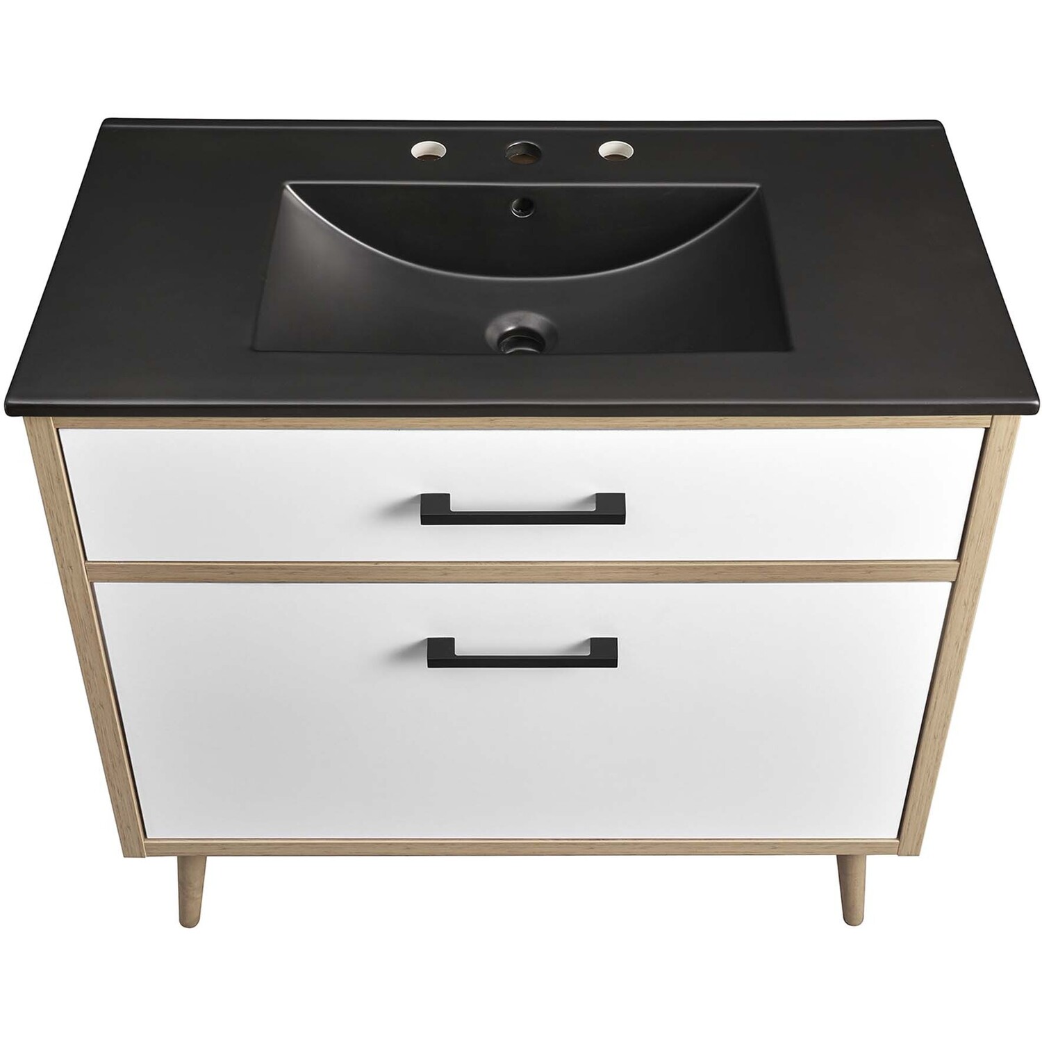 The Maverick 36" Bathroom Vanity is the perfect blend of modern style and convenience. Crafted with particleboard and melamine, the simple yet elegant design is enhanced by modern metal handle pulls and tapered and splayed rubberwood legs. The spacious full-glide bottom drawer provides plenty of storage space for all your bathroom essentials, while the fixed top drawer adds complementing style. This bathroom vanity cabinet features a ceramic sink basin with an integrated countertop and 8" centerset faucet holes. This bathroom vanity instantly transforms your space, creating a beautiful, modern look that will last for years. Includes non-marking foot glides to protect flooring. Assembly required. Fixtures not included.Modern 36" Bathroom Vanity