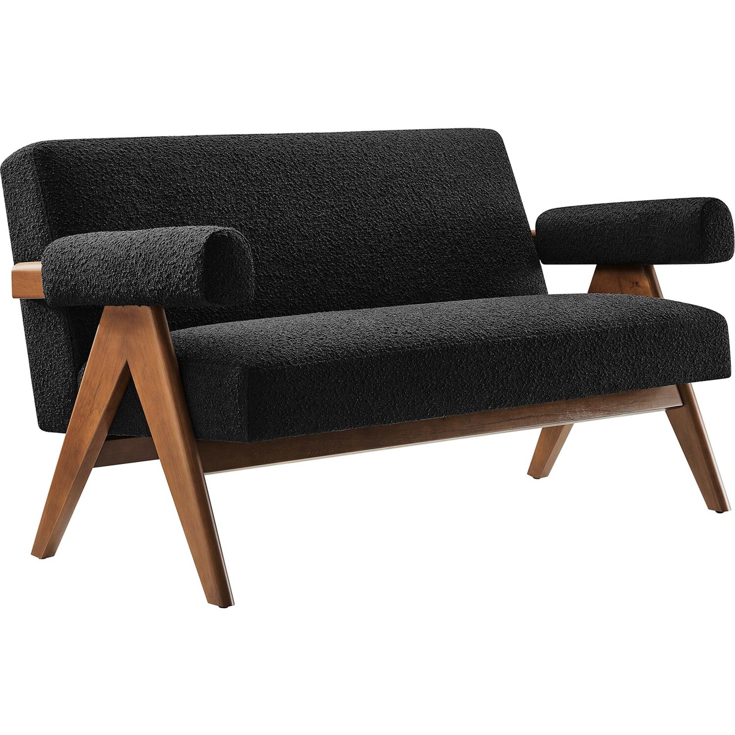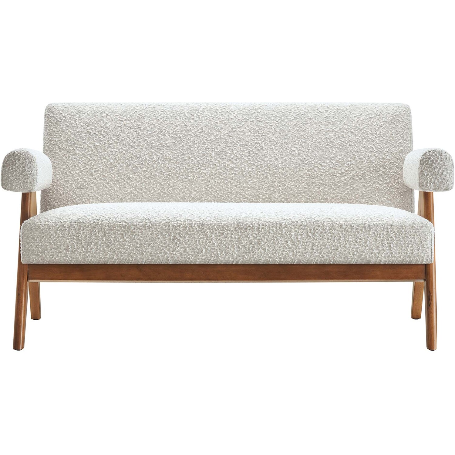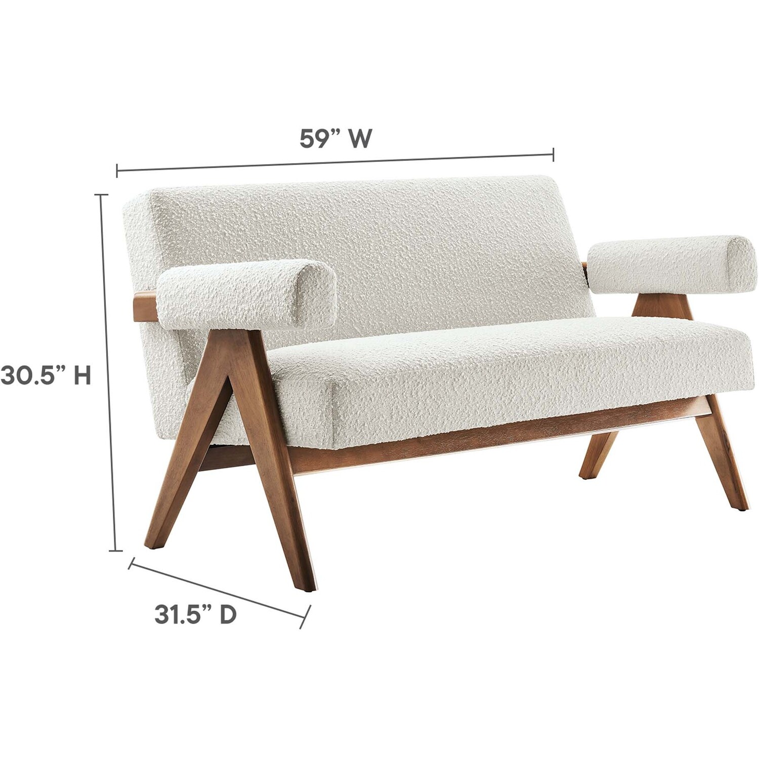 Add comfort and style to your home with the Lyra Boucle Fabric Upholstered Loveseat. This contemporary settee is chic and luxurious, featuring a relaxed design with a subtly angled backrest. Lyra comes upholstered in boucle fabric, creating a comfortable resting spot where you can dive into a good book or enjoy a cup of coffee. Featuring a sturdy plywood frame, inverted V-shaped rubberwood legs, and dense foam padding, this modern loveseat provides stability while enhancing living room, bedroom, hallway, or entryway spaces. Includes non-marking feet. Assembly Required. Weight Capacity: 662 lbs.Ergonomic Design for Comfort