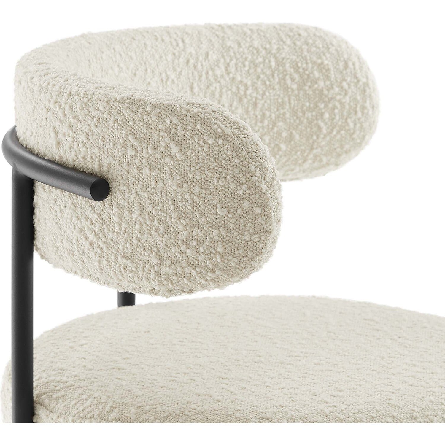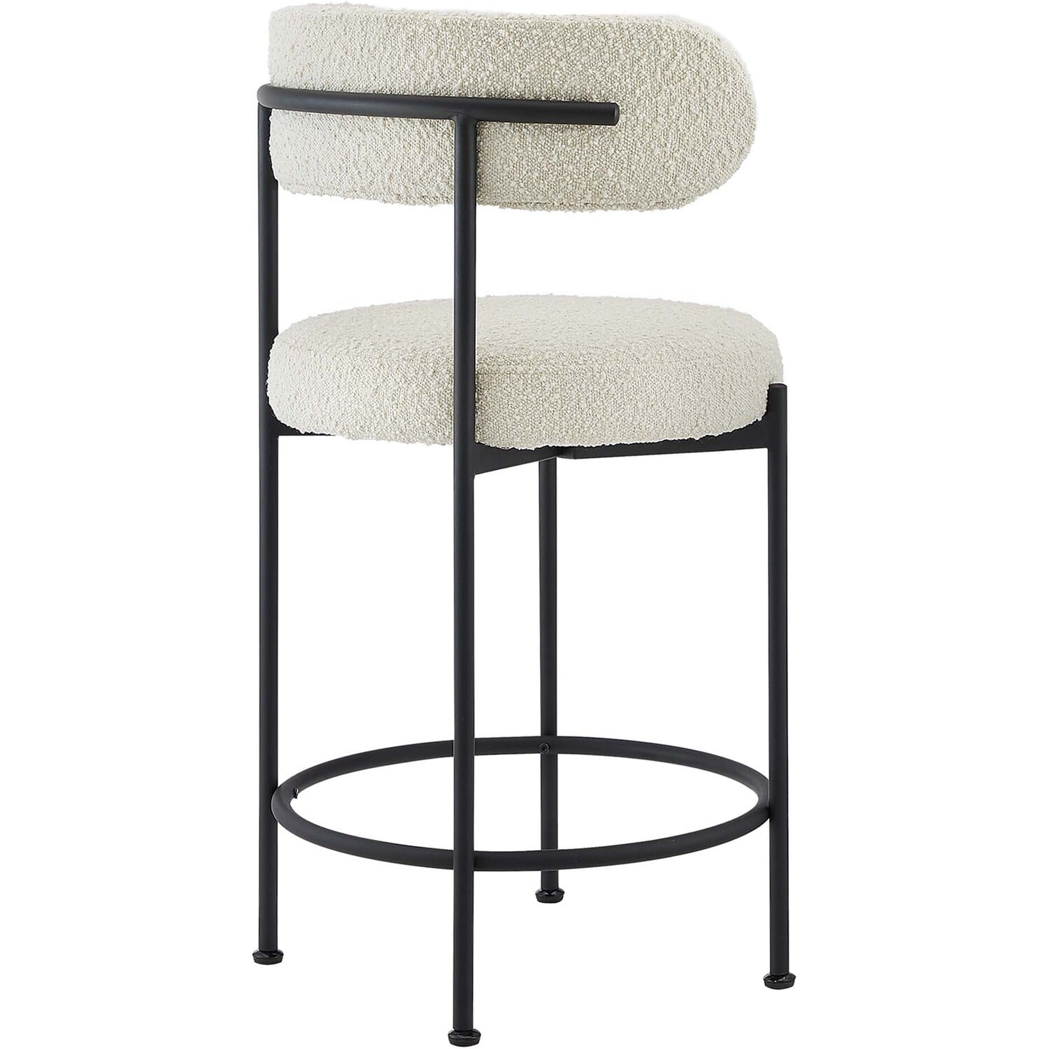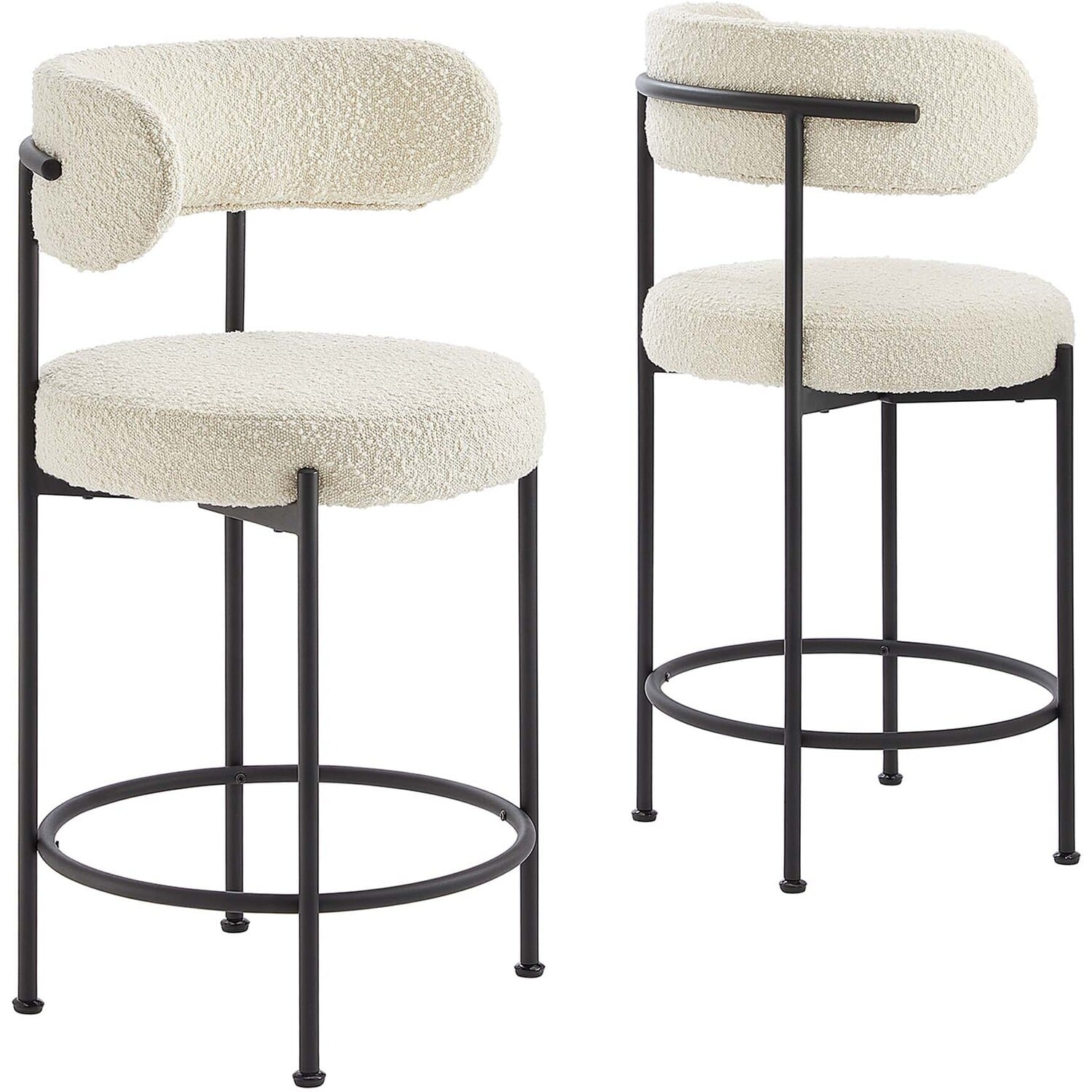 Experience luxury and modern sophistication with the Albie Boucle Counter Stools - Set of 2. Upholstered in nubby textured boucle fabric, this counter-height stool set exhibits a chic silhouette with its rounded seat and curved backrest, enhancing your dining or kitchen area's aesthetic. Resting on adjustable non-marking foot pins to provide stability and protect your flooring, the bases of these counter stools are crafted from sleek tubular metal that's the perfect complement to the charming upholstery. The dense padded foam seat cushions and backrests offer a premium seating experience during everyday mealtime or entertaining. Minimal assembly is required with easy to follow instructions. Weight Capacity: 330 lbs.Modern Counter Stools - Set of 2