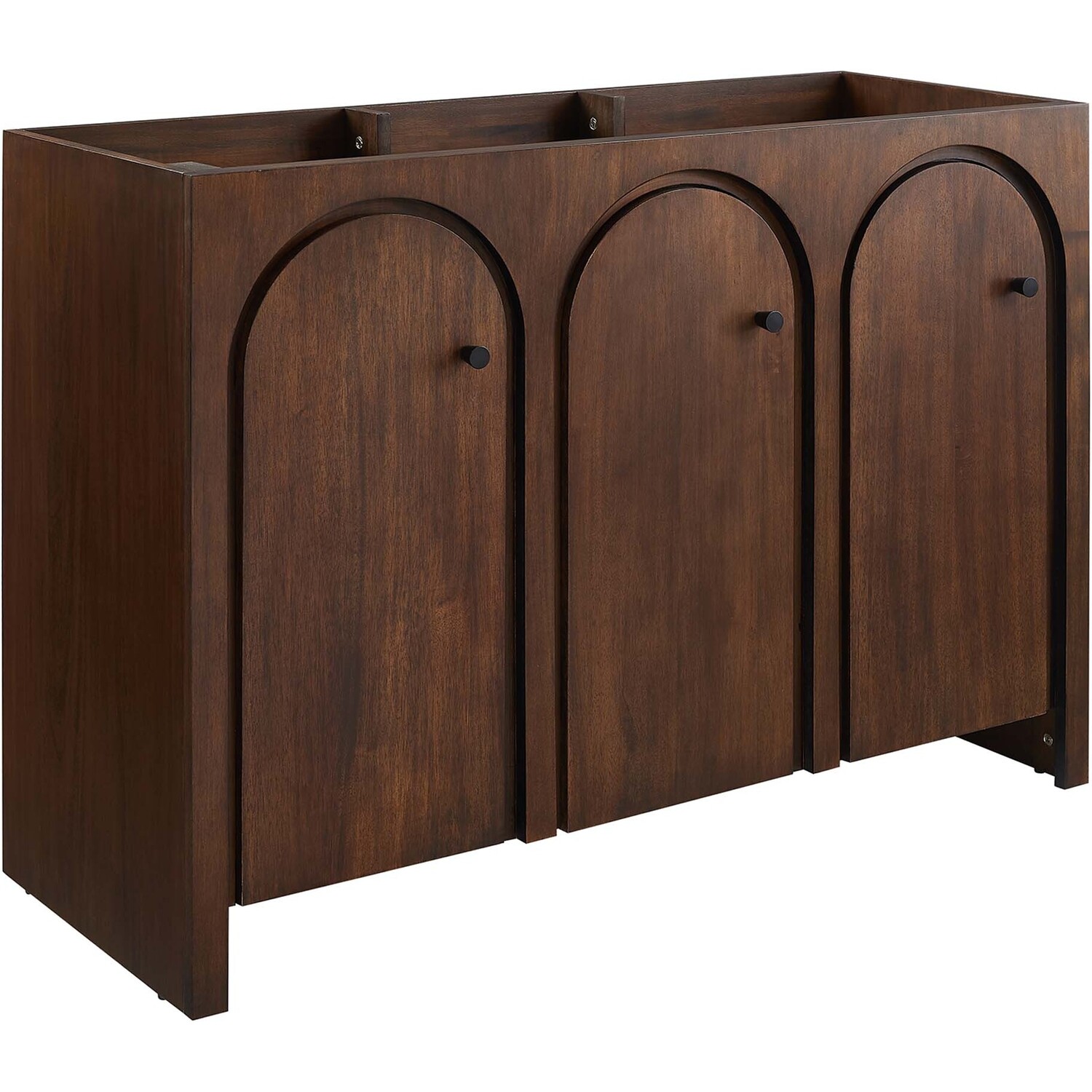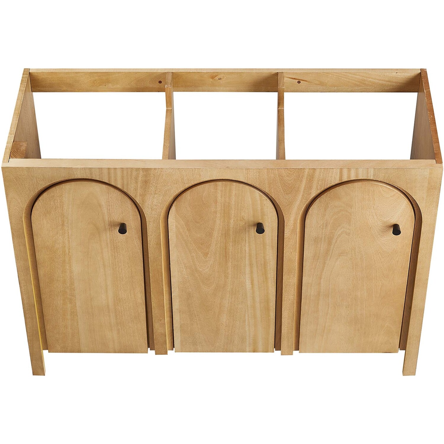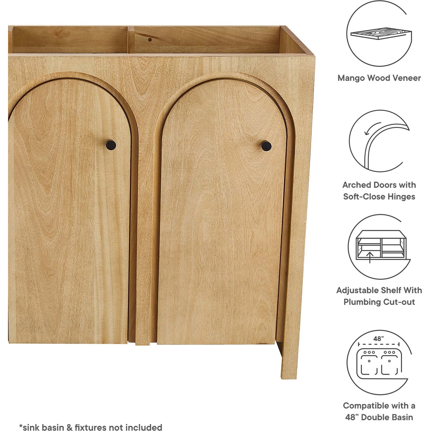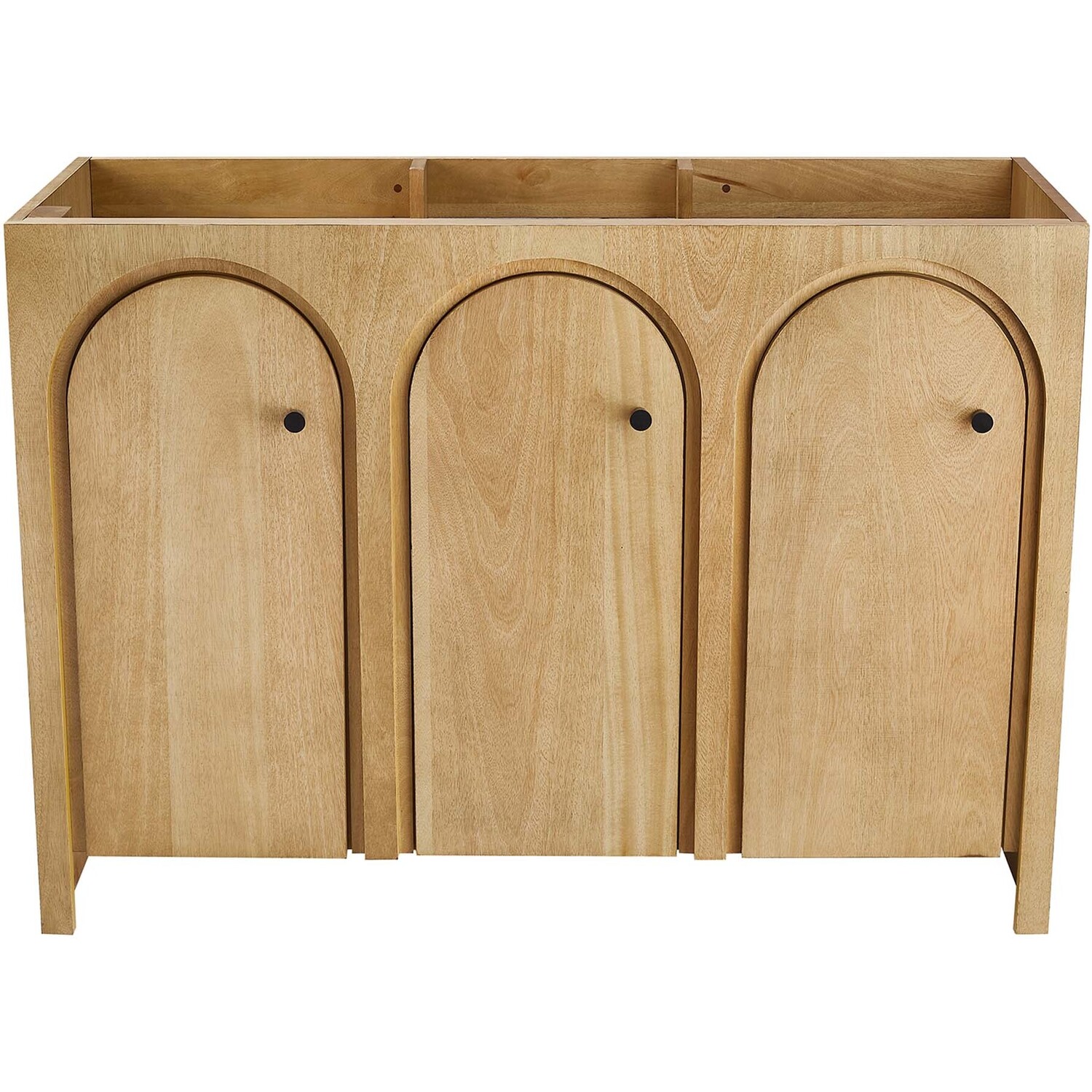 Elevate your bathroom's style with the Appia 48 Bathroom Vanity Cabinet, where retro elegance meets functionality. Expertly crafted from high-quality MDF and adorned with a mango wood veneer, this vanity cabinet brings stunning organic aesthetics to your bathroom. Its three arched doors add beautiful dimension to any primary or guest bathroom. Featuring soft-close hinges, the Appia compact vanity offers a smooth, quiet experience and includes adjustable shelves with convenient plumbing cut-outs for a double sink, providing ample storage for all your vanity bathroom essentials. Assembly is straightforward, ensuring you can enjoy this stylish and modern vanity effortlessly. Sink basin and fixtures are not included with this chic and practical bathroom vanity cabinet. Includes adjustable non-marking foot pads to protect flooring. Top Panel Weight Capacity: 250 lbs.Soft-Close Hinges