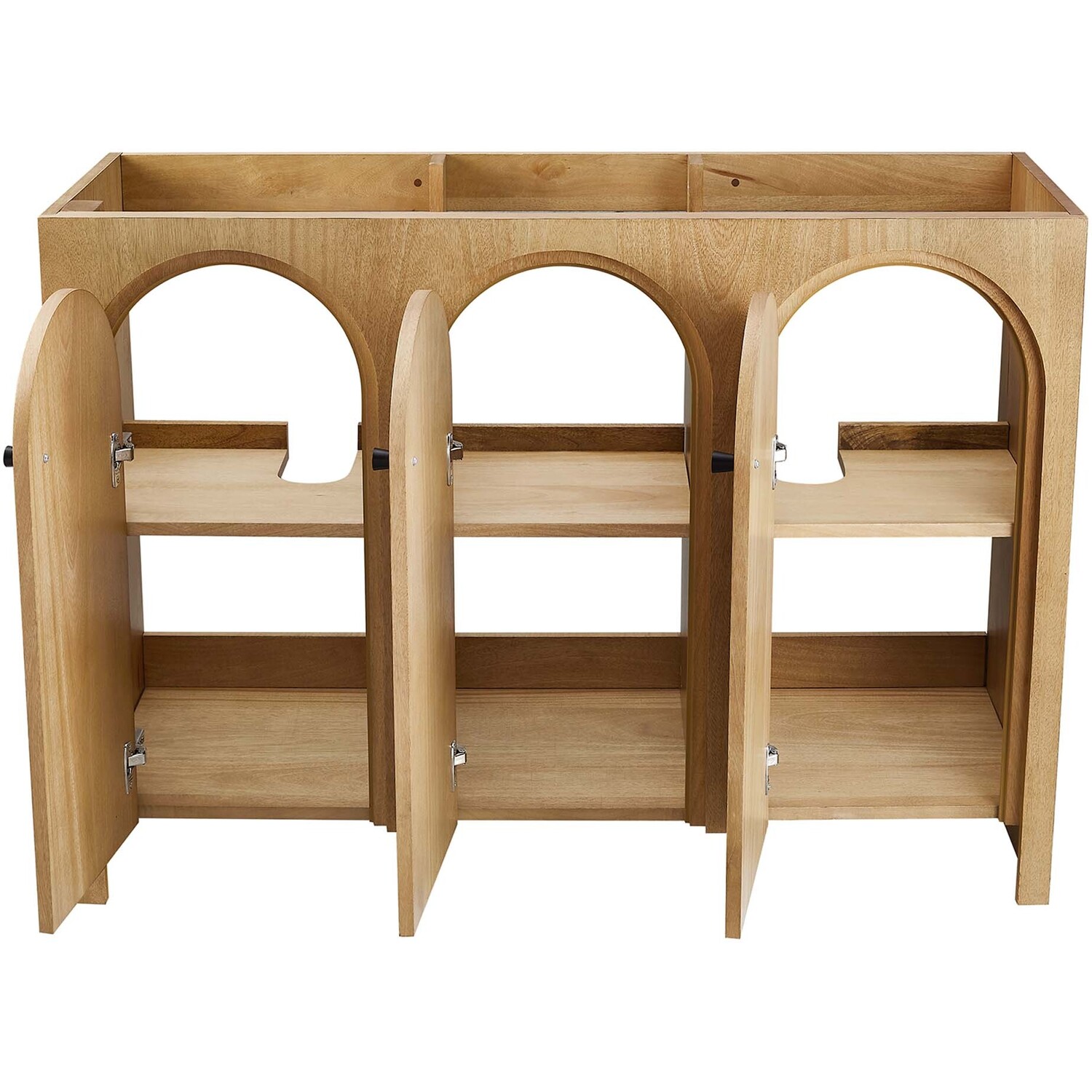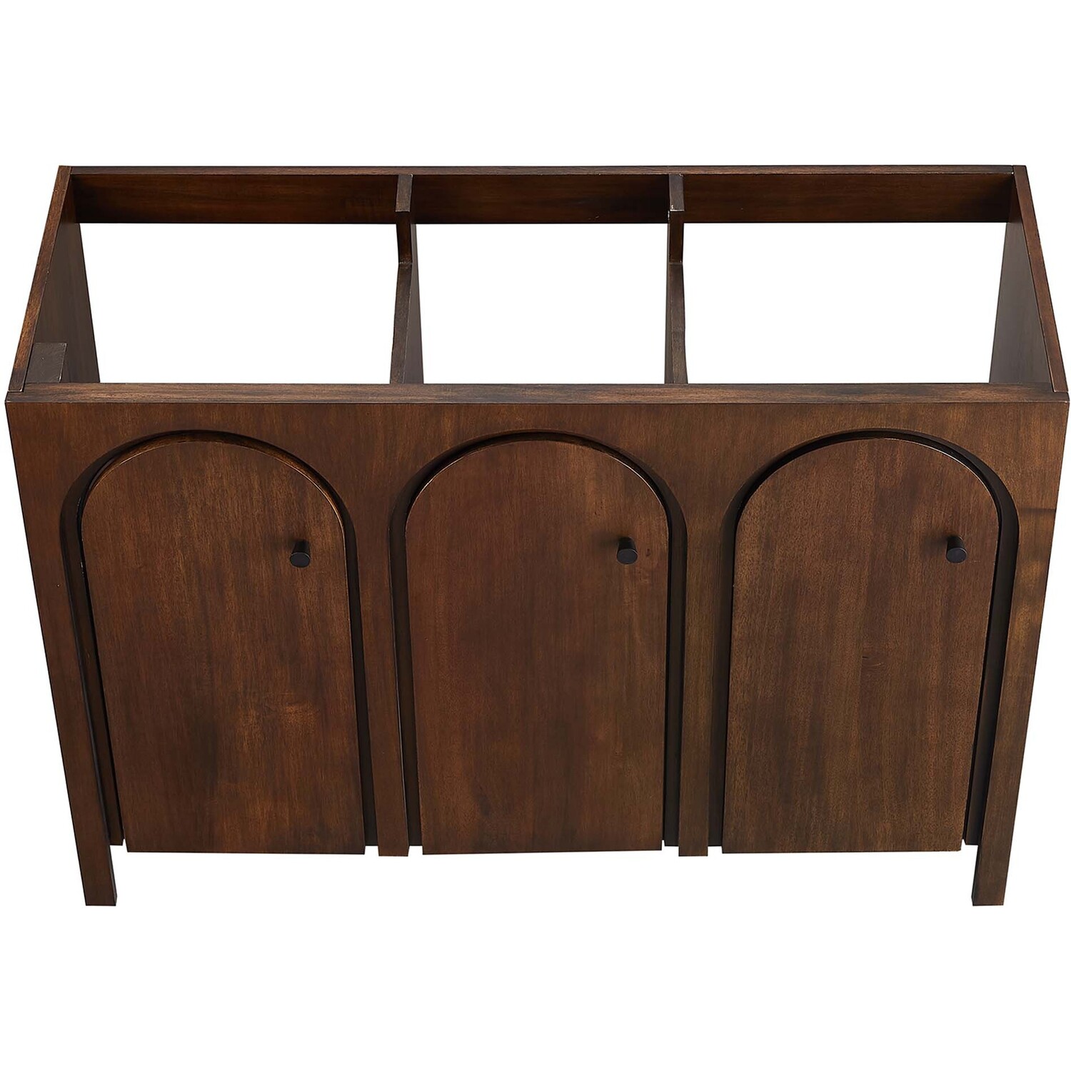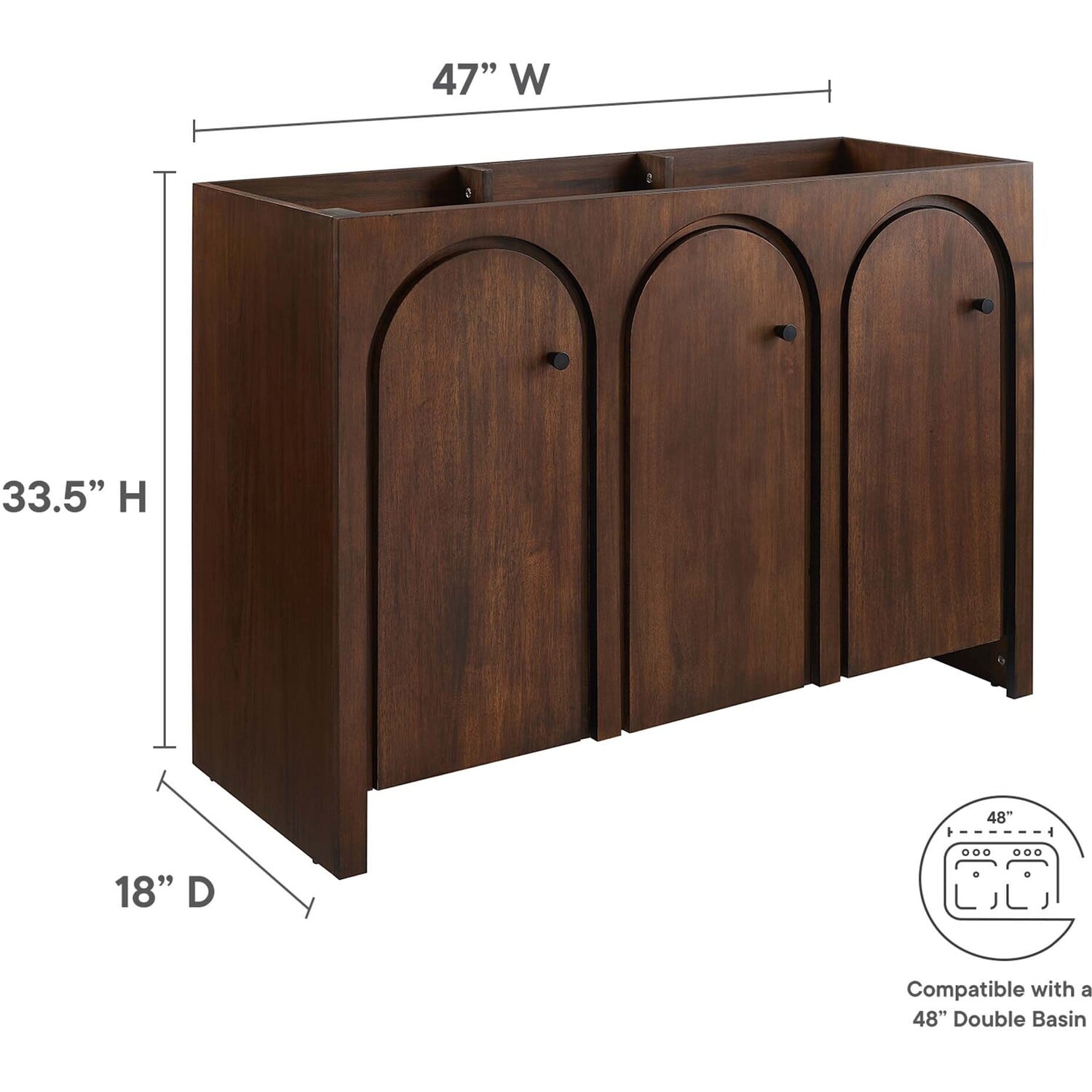 Elevate your bathroom's style with the Appia 48 Bathroom Vanity Cabinet, where retro elegance meets functionality. Expertly crafted from high-quality MDF and adorned with a mango wood veneer, this vanity cabinet brings stunning organic aesthetics to your bathroom. Its three arched doors add beautiful dimension to any primary or guest bathroom. Featuring soft-close hinges, the Appia compact vanity offers a smooth, quiet experience and includes adjustable shelves with convenient plumbing cut-outs for a double sink, providing ample storage for all your vanity bathroom essentials. Assembly is straightforward, ensuring you can enjoy this stylish and modern vanity effortlessly. Sink basin and fixtures are not included with this chic and practical bathroom vanity cabinet. Includes adjustable non-marking foot pads to protect flooring. Top Panel Weight Capacity: 250 lbs.Soft-Close Hinges
