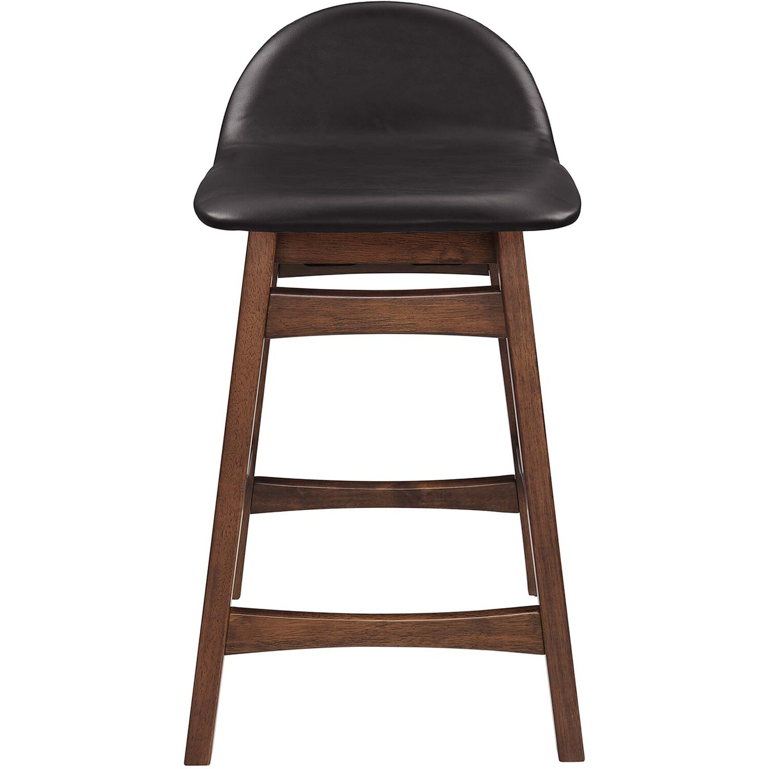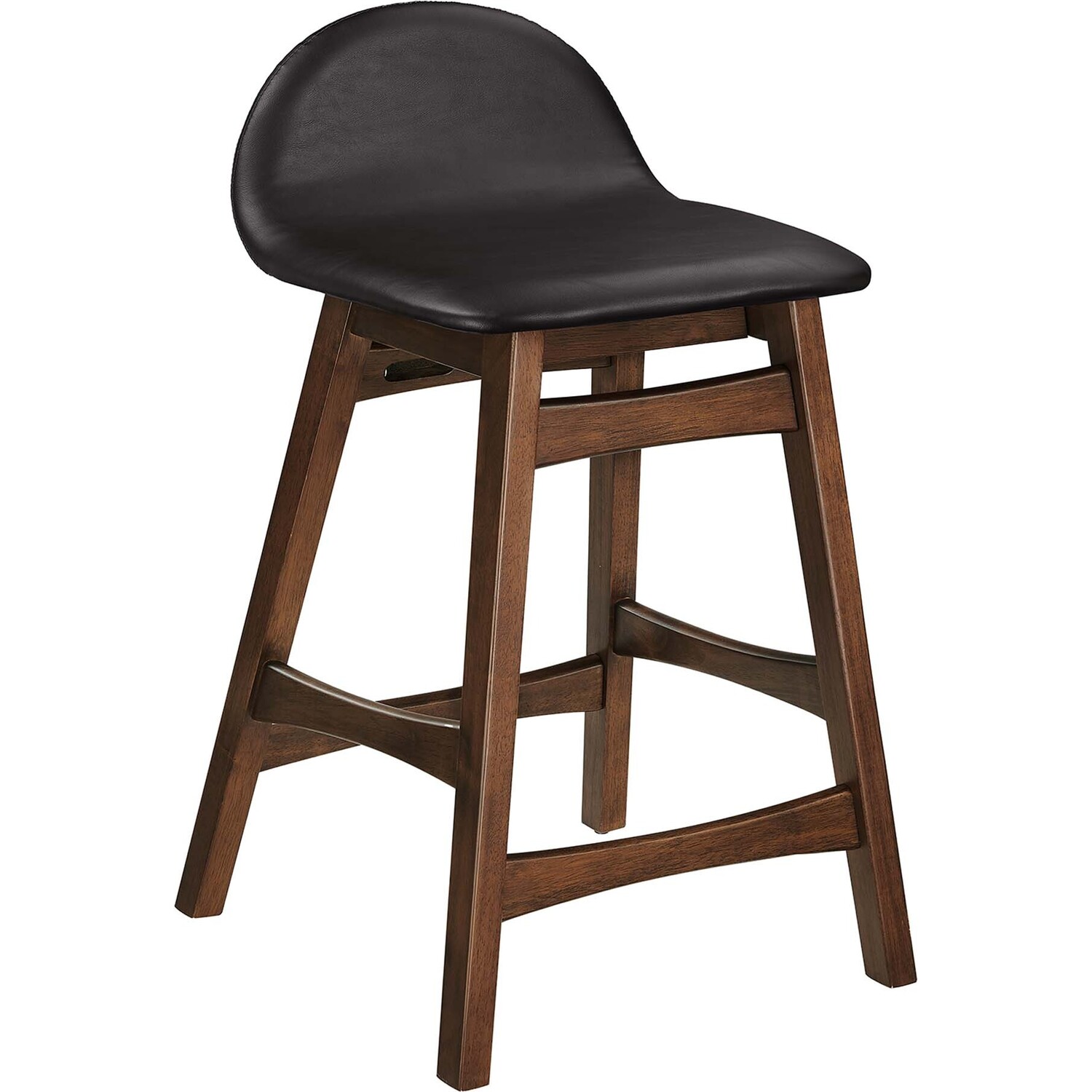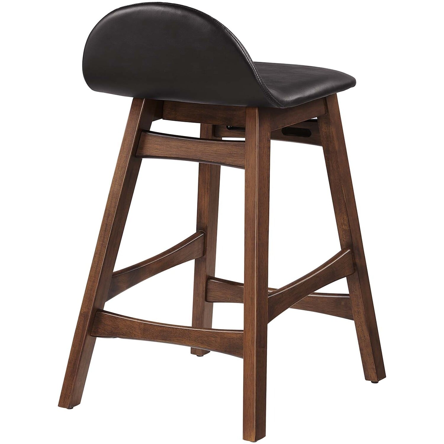 Invite lighthearted banter and deep conversations as you perch on the Juno Counter Stool Set of Two. This set counter stools boasts splayed rubberwood legs and durable plywood seat, upholstered in vegan leather. The unique arched contour of the low backrests, paired with integrated footrests and side supports, ensures optimal comfort for lasting sit-downs. With a mix of vintage-modern style and mid-century appeal, this pair of counter stools is multifaceted, whether used as kitchen stools, pub chairs, or unique dining accents. Ideal for kitchens, bistros, counter nooks, dining islands, and entertainment areas, the Juno Counter Stools effortlessly complement any decor. Assembly required. Weight Capacity: 220 lbs.Mid Century Wood Counter Stool