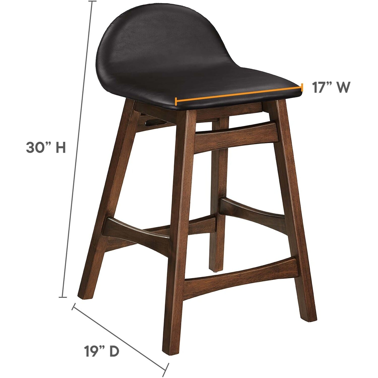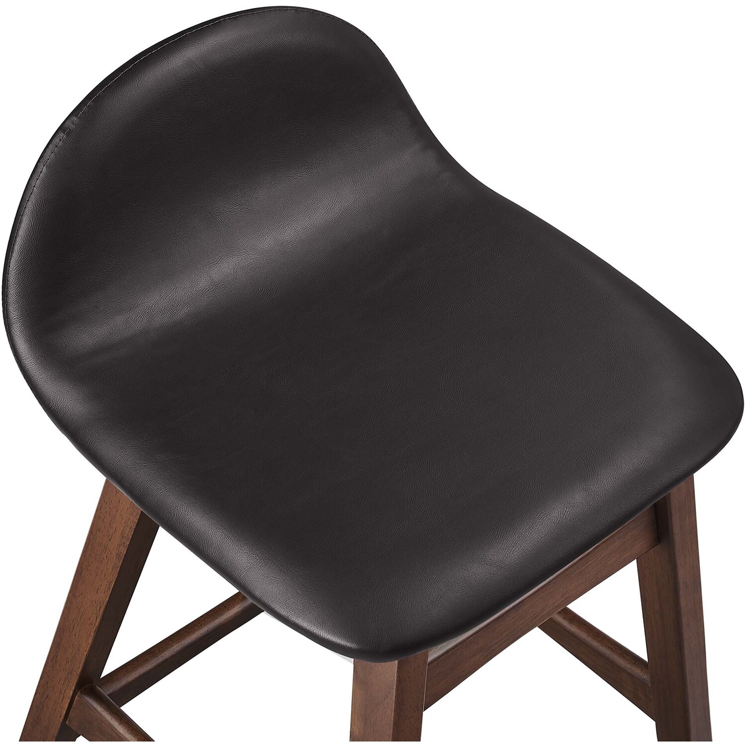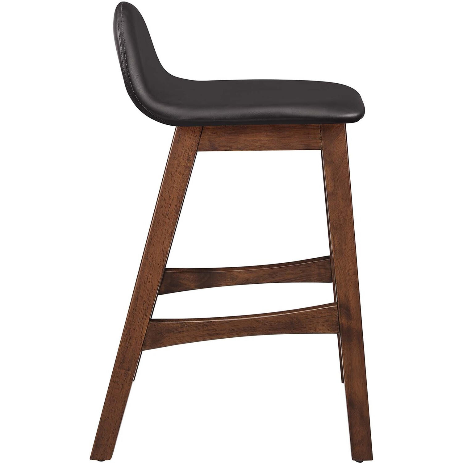Invite lighthearted banter and deep conversations as you perch on the Juno Counter Stool Set of Two. This set counter stools boasts splayed rubberwood legs and durable plywood seat, upholstered in vegan leather. The unique arched contour of the low backrests, paired with integrated footrests and side supports, ensures optimal comfort for lasting sit-downs. With a mix of vintage-modern style and mid-century appeal, this pair of counter stools is multifaceted, whether used as kitchen stools, pub chairs, or unique dining accents. Ideal for kitchens, bistros, counter nooks, dining islands, and entertainment areas, the Juno Counter Stools effortlessly complement any decor. Assembly required. Weight Capacity: 220 lbs.Mid Century Wood Counter Stool