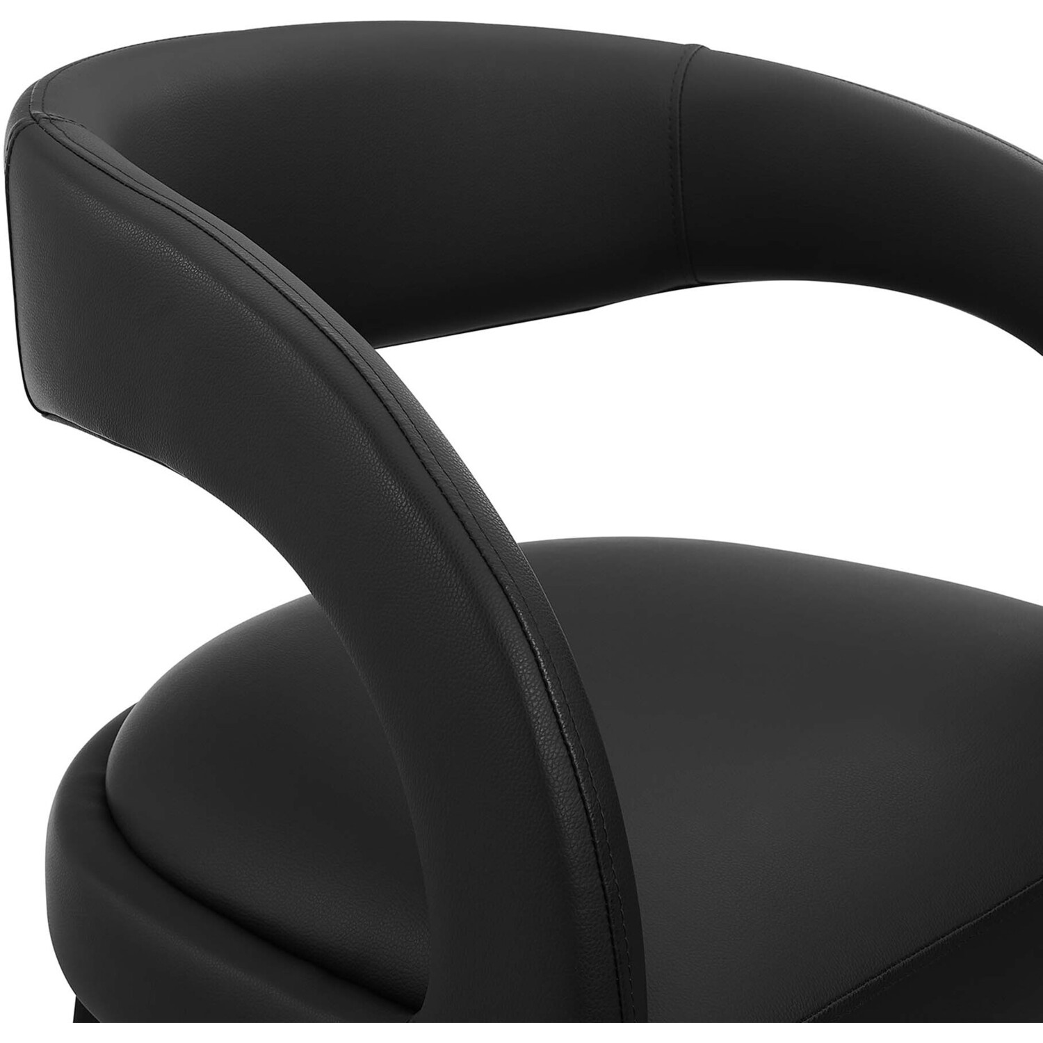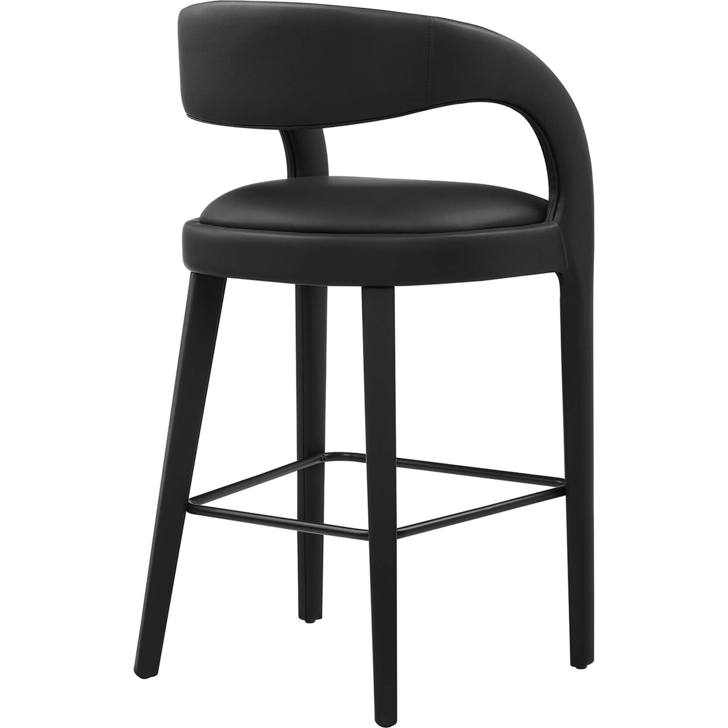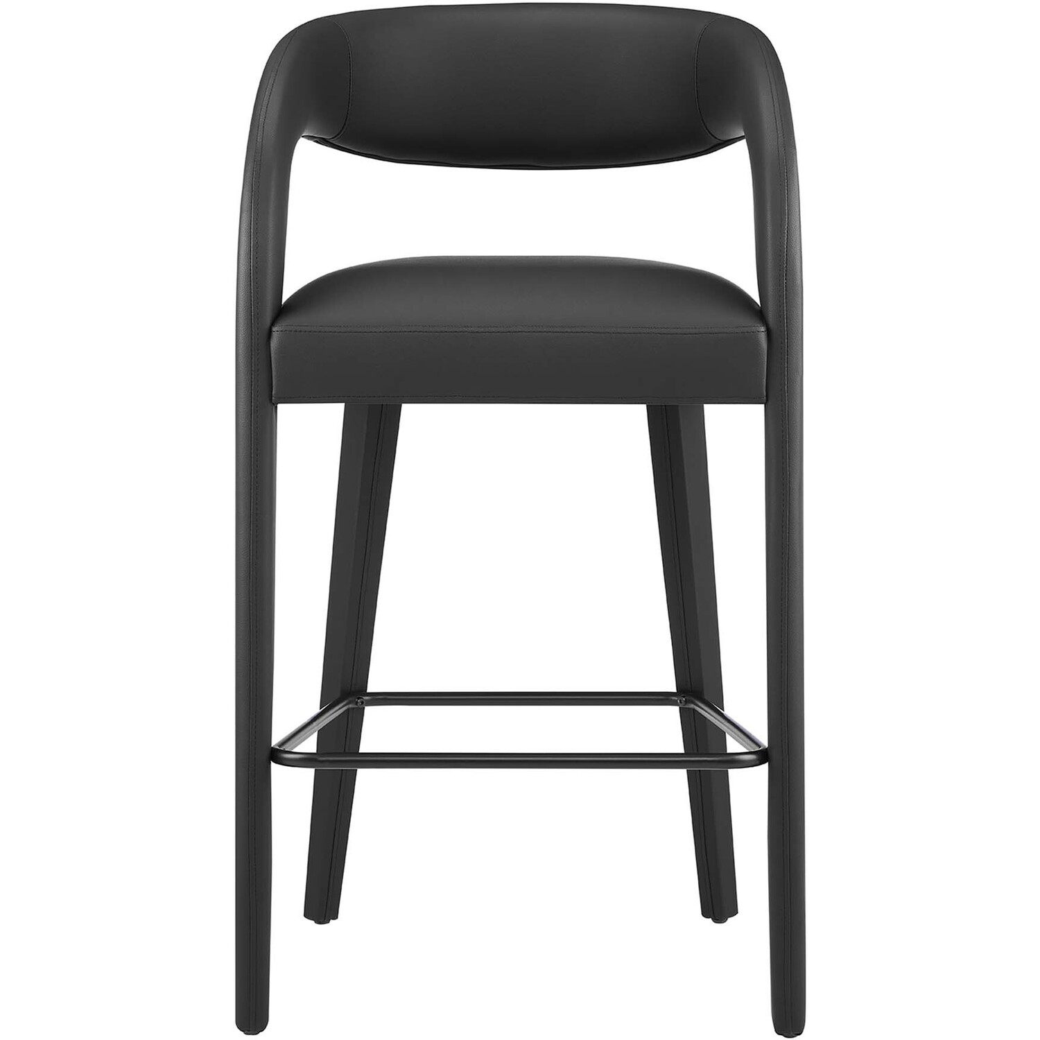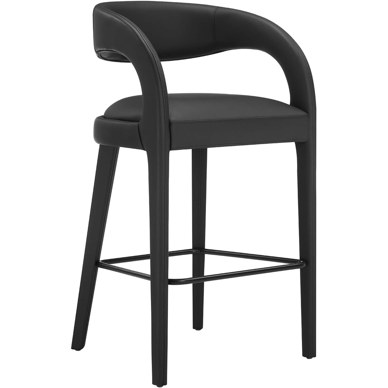 Experience the perfect blend of modern sophistication and luxurious comfort with the Pinnacle Vegan Leather Upholstered Bar Stool Set of Two. The distinct silhouette showcases a curved backrest and an open design that effortlessly enhances your dining space or kitchen area with luxe style. This bar-height stool set indulges your senses with its dense foam padding, upholstered in a smooth, quality vegan leather. Non-marking plastic foot pins ensure your flooring remains free from scuffs and scratches. With minimal assembly needed, this bar stool set not only offers a stylish statement but also a hassle-free setup. Weight Capacity: 330 lbs.Modern Bar Stool Set