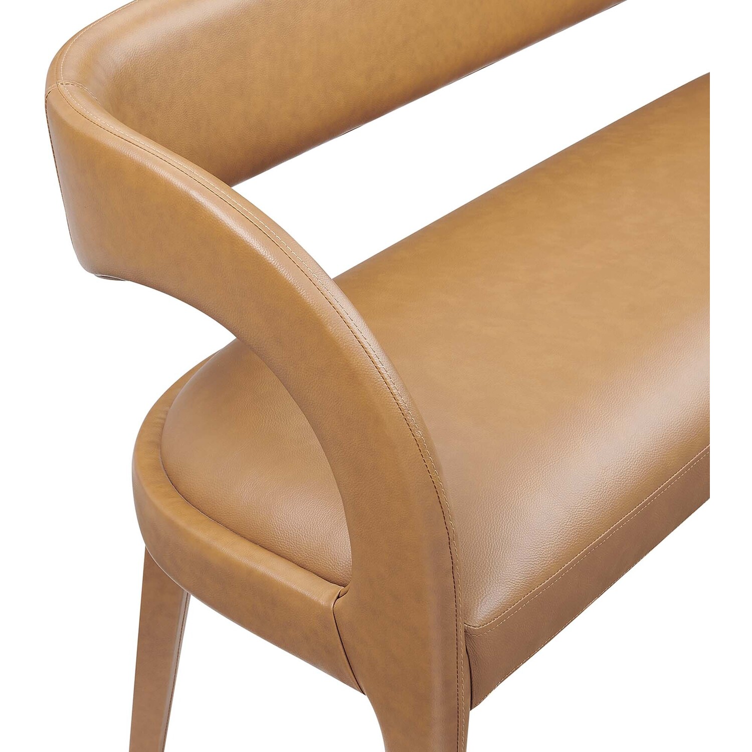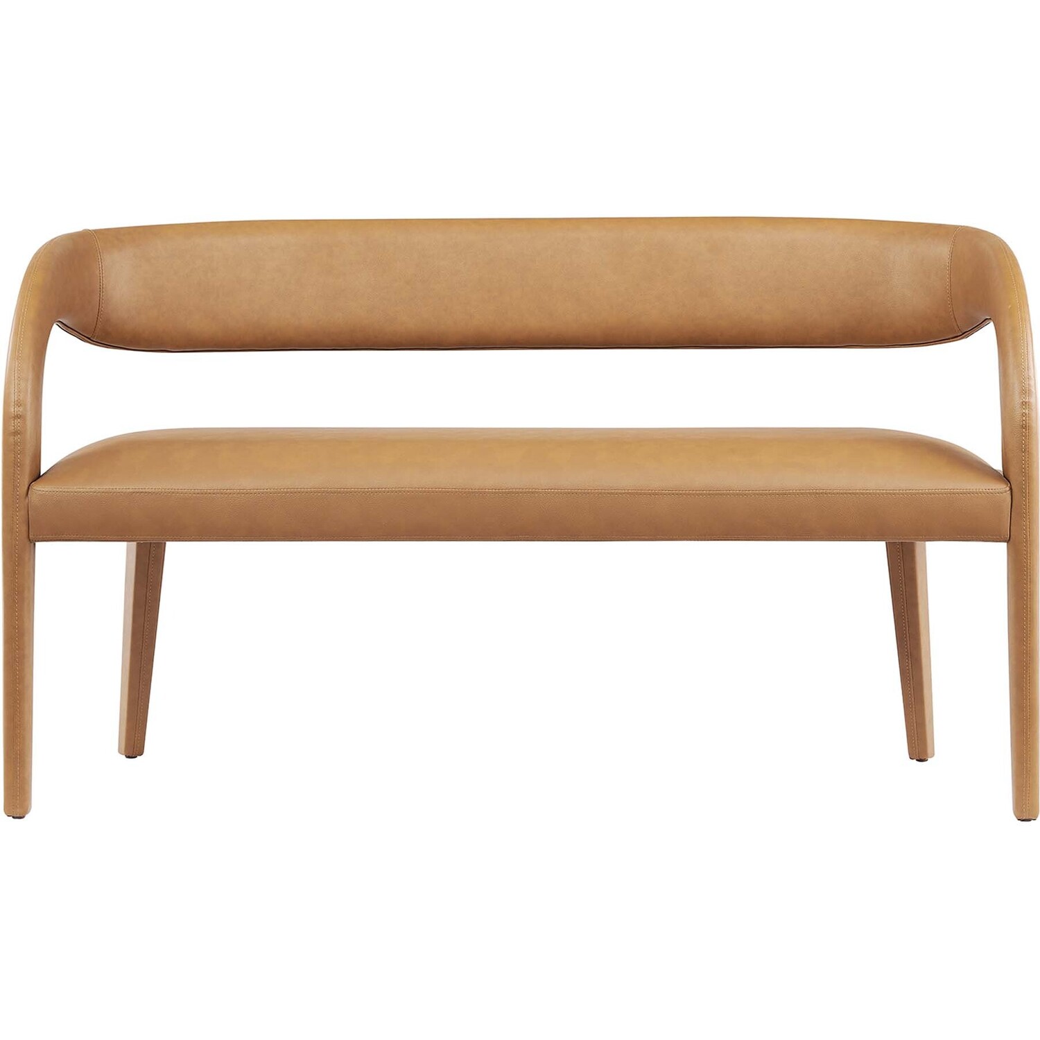 Experience the perfect blend of modern sophistication and luxurious comfort with the Pinnacle Vegan Leather Upholstered Accent Bench. Whether used as a dining bench or accent bench, its distinct silhouette showcases a curved backrest and an open design that effortlessly enhances your dining or living space with luxe style. This modern bench indulges your senses with its dense foam padding, upholstered in a smooth, quality vegan leather. Non-marking plastic foot pins ensure your flooring remains free from scuffs and scratches. With no assembly required, this bench offers a stylish statement instantly. Weight Capacity: 330 lbs.Modern Accent Bench