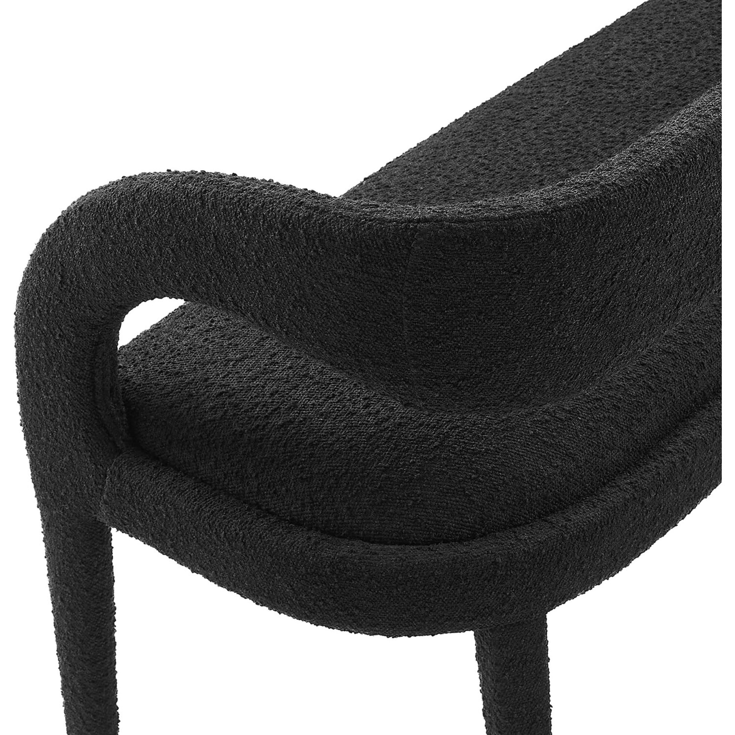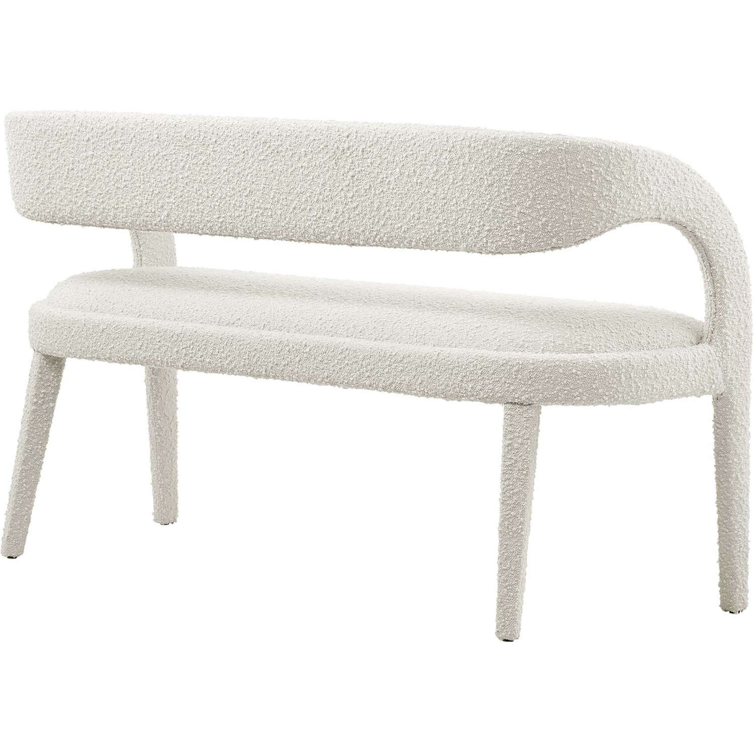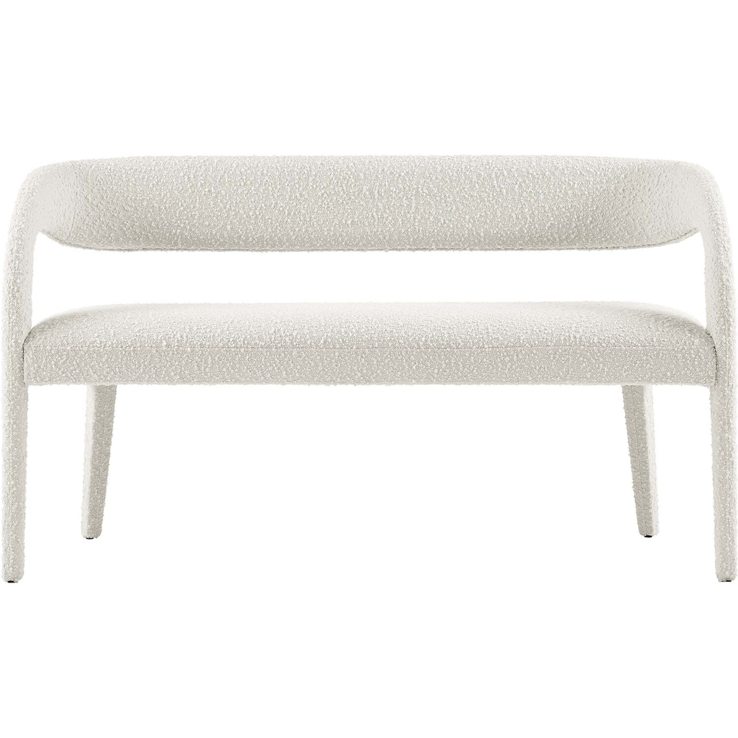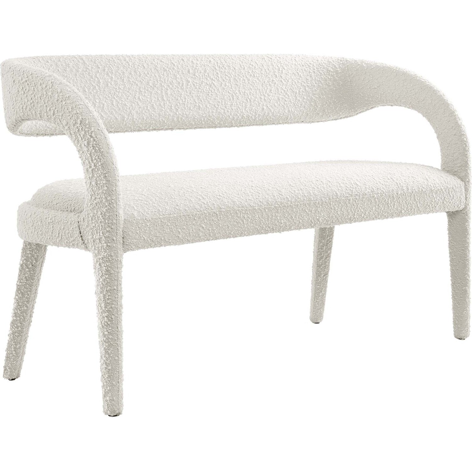Experience the perfect blend of modern sophistication and luxurious comfort with the Pinnacle Boucle Fabric Upholstered Accent Bench. Whether used as a dining bench or accent bench, its distinct silhouette showcases a curved backrest and an open design that effortlessly enhances your dining or living space with luxe style. This modern bench indulges your senses with its dense foam padding, upholstered in a tactile, nubby textured boucle fabric. Non-marking plastic foot pins ensure your flooring remains free from scuffs and scratches. With no assembly required, this bench offers a stylish statement instantly. Weight Capacity: 330 lbs.Modern Accent Bench
