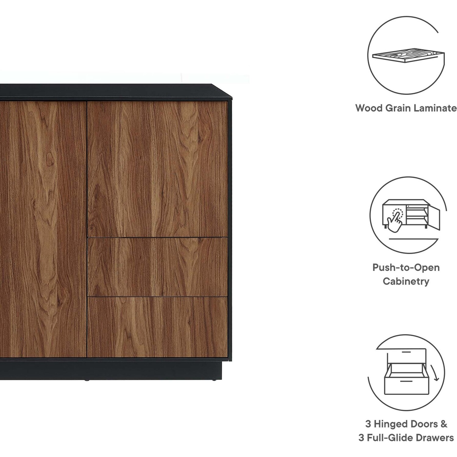 Merge sophistication and utility with the Holden 47” Sideboard. Constructed from MDF and durable particleboard, this sideboard features a wood grain laminate on its cabinets and drawers, bestowing a rustic flair that complements any contemporary setting. Experience modern convenience with push-to-open cabinetry and thoughtfully designed shelving behind three hinged doors. Complete with three full-glide drawers, and resting on a sleek plinth base, the versatile storage solutions of Holden's design allow it to serve as a fashionable buffet table, an urban-chic sideboard, or high TV stand supporting flat screen TVs up to 52". Assembly Required. Weight Capacity: 145 lbs. Please Note: When placing the TV directly on the unit, we recommend anchoring it in place.MDF and Particleboard