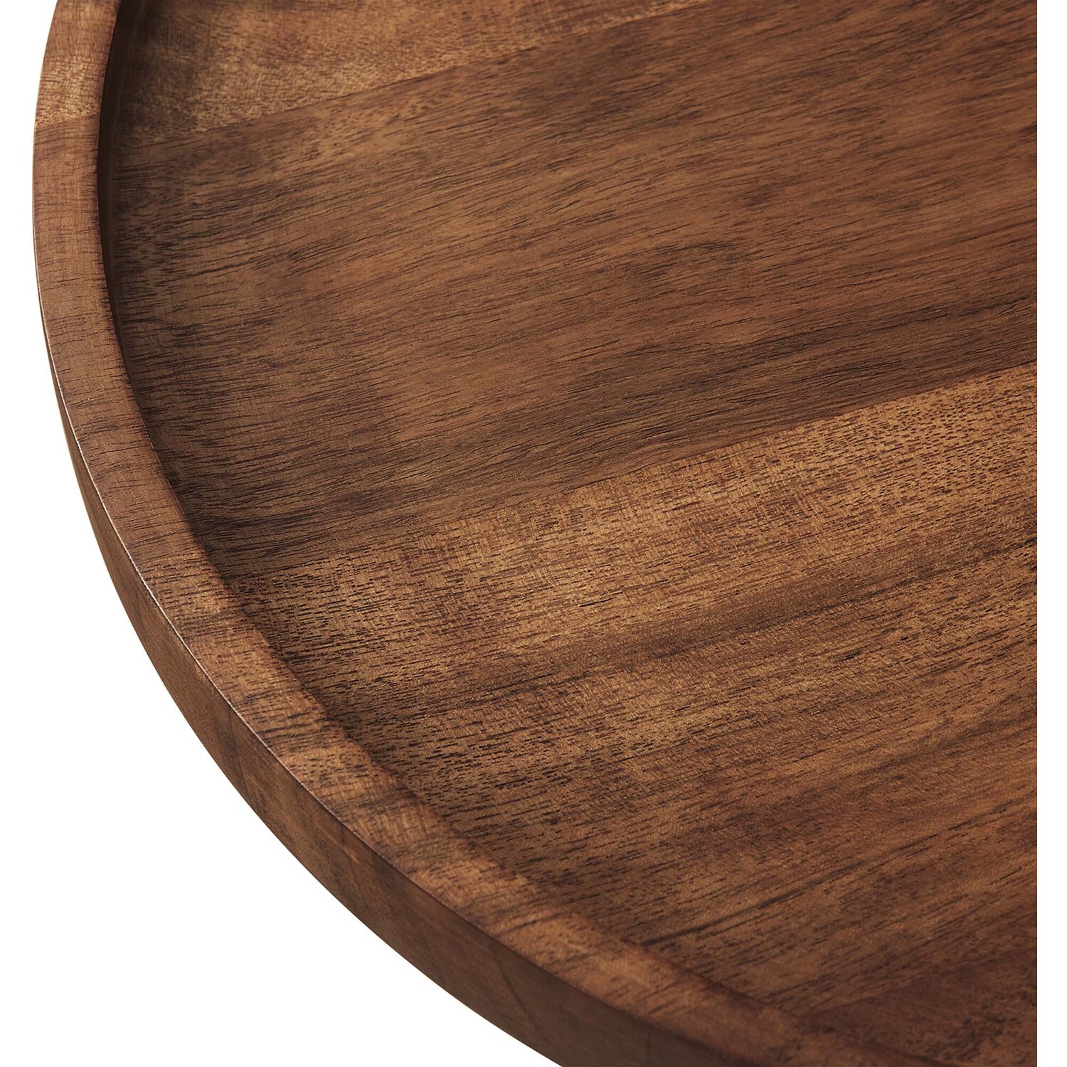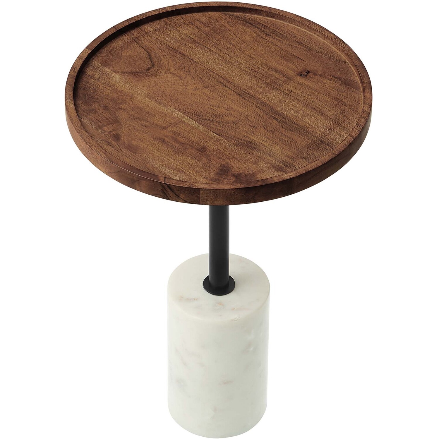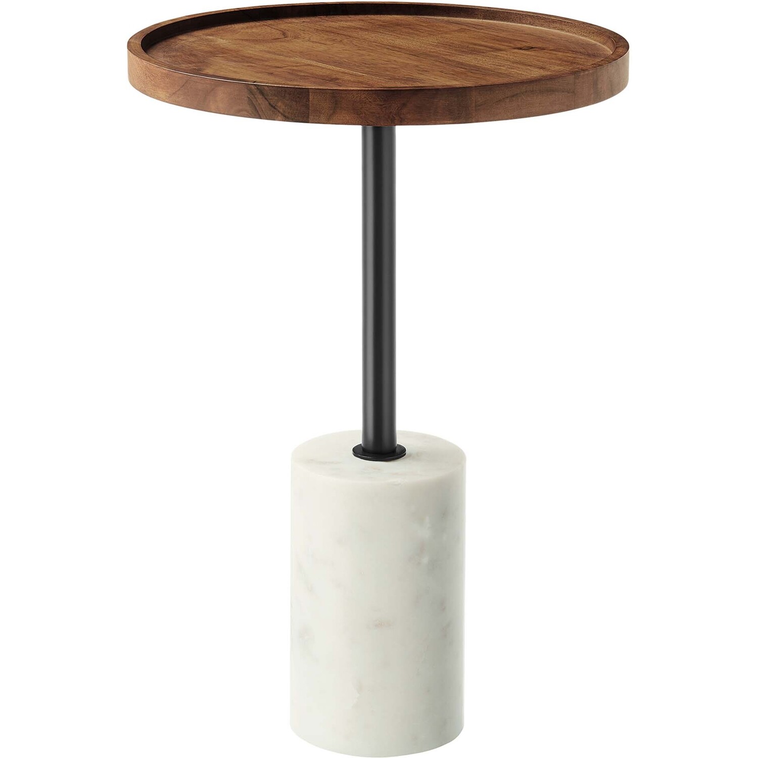 Add a touch of organic beauty to your living room decor courtesy of the Amina Acacia Wood Side Table. This sofa end table features a solid acacia wood tabletop that takes center stage, accented by its distinctive raised edges for a mid-century vibe. Elevating its aesthetic, a sleek iron rod descends from the top to connect with a white marble base, shaped into an 8-inch high cylinder, adding a touch of luxe richness to its design. Whether you're envisioning this end table as a complement to your sofa, an addition to your home office, a stylish touch for a guest bedroom, or an attractive piece for your entryway, its modern yet raw appeal makes it a perfect fit in a variety of decors. With space to hold your keys, magazines, books, candles, or plants, the Amina Side Table serves as a versatile and functional accent table, catering to both practical and aesthetic needs. Equipped with a non-marking pad to protect floors. Assembly required. Weight Capacity: 99 lbs.Solid Acacia Wood Tabletop