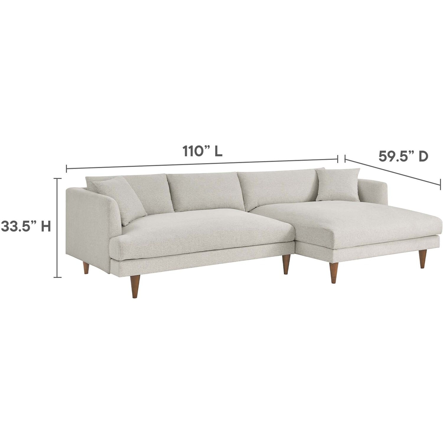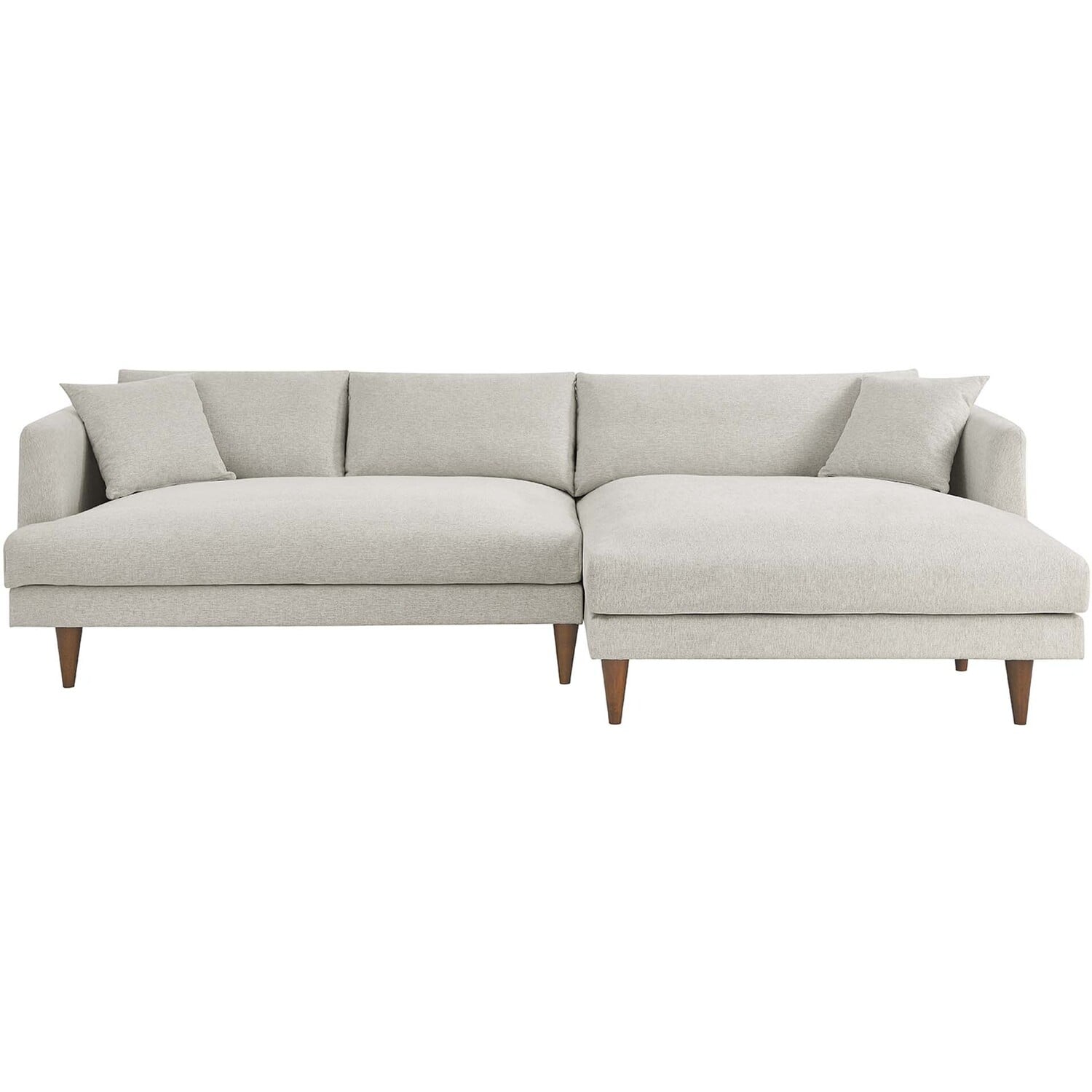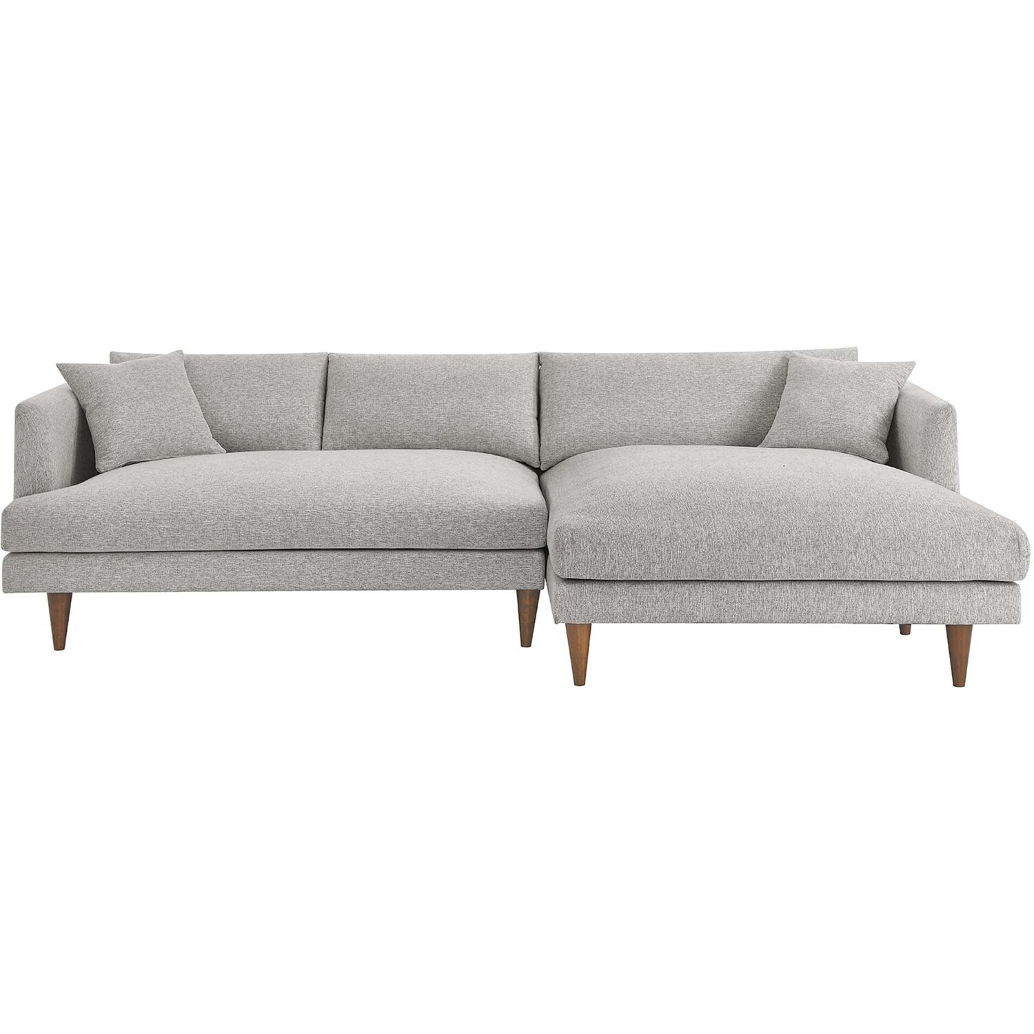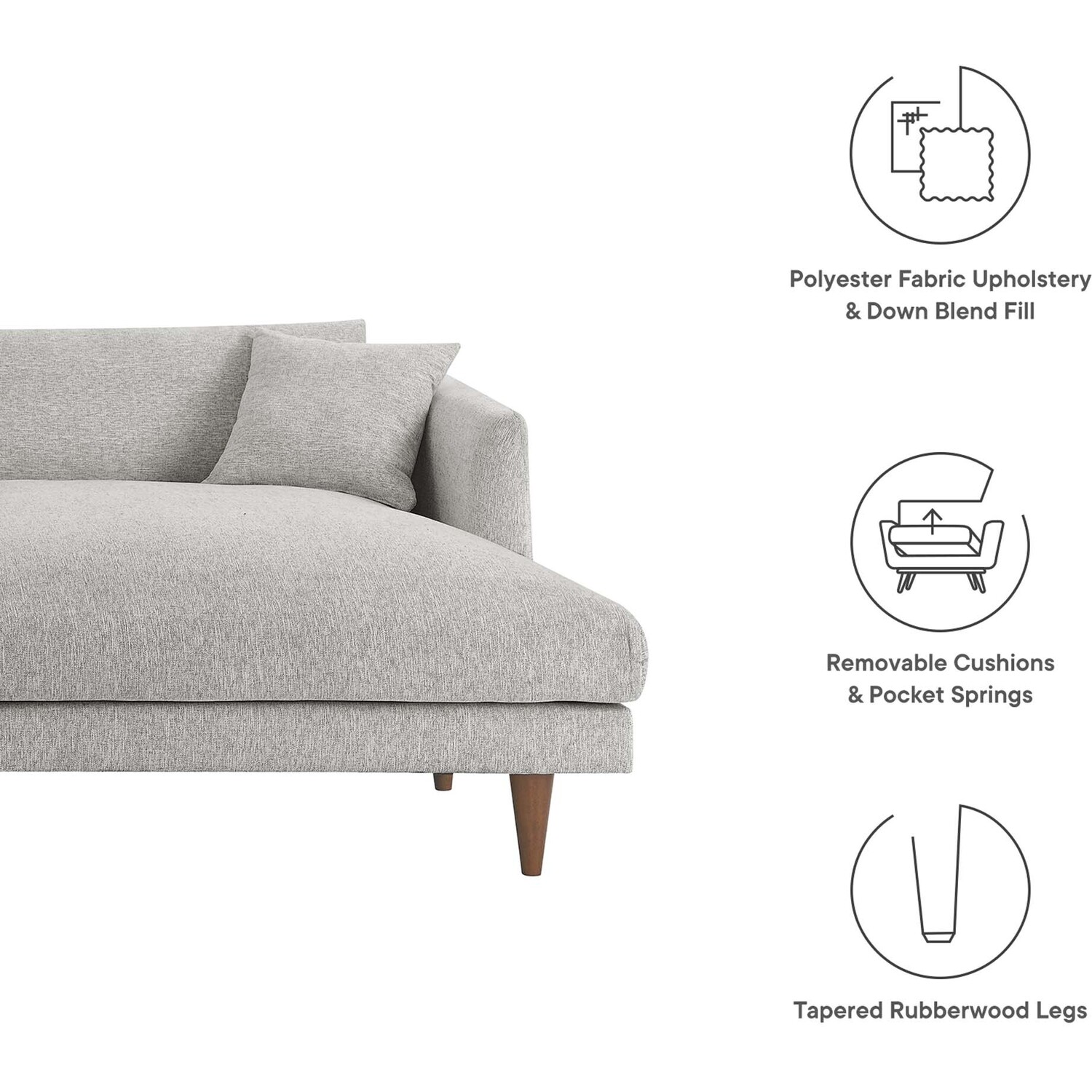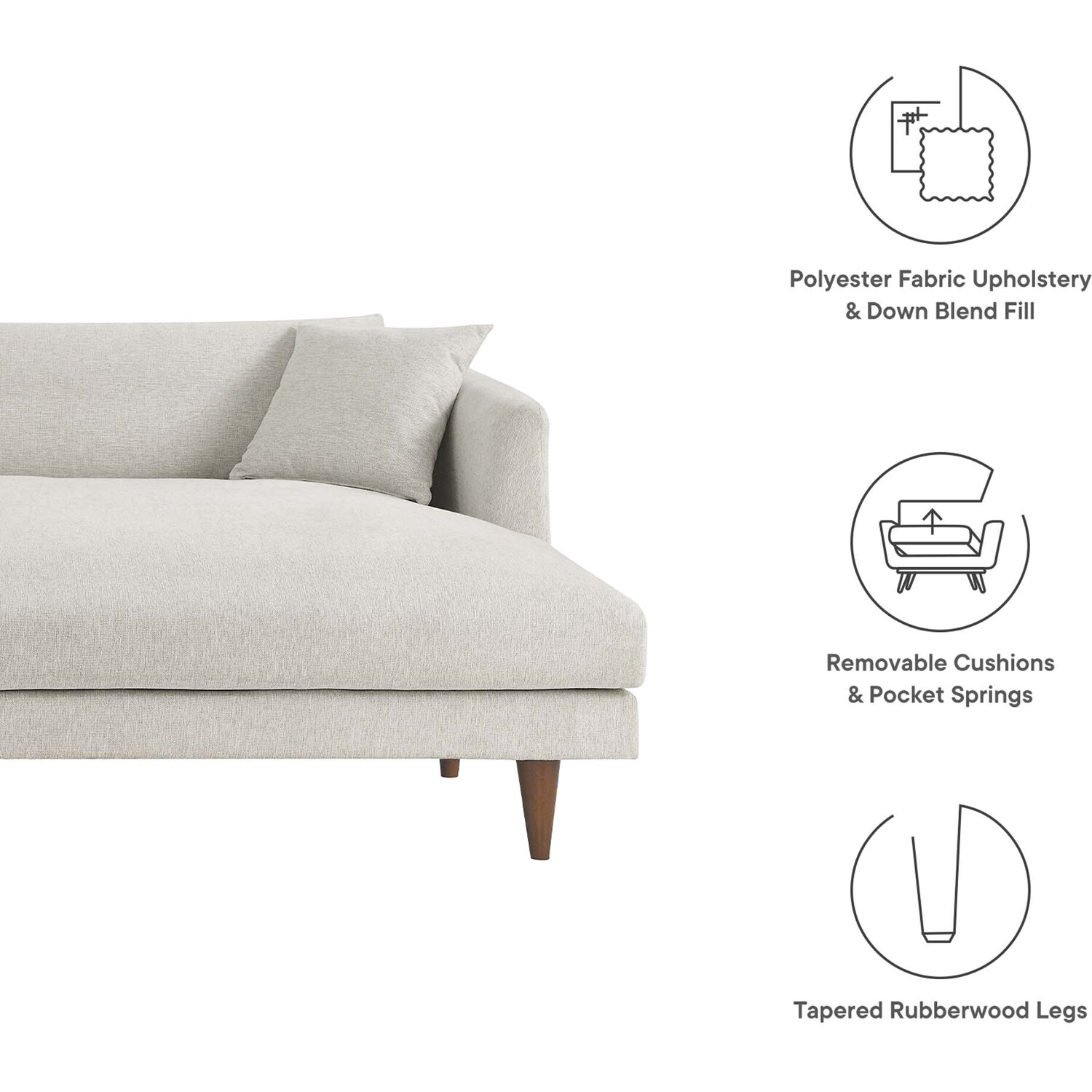 Dive deep into comfort and conversations with the Zoya Upholstered Down-Filled Sectional Sofa. The perfect addition to modern living rooms, family rooms, or game rooms, Zoya's two-piece sectional design, featuring a right-arm chaise, invites you into an immersive lounging experience, with a low, comfortable profile and spacious deep seating. Upholstered in polyester fabric with a down blend and dense foam filling, this living room sofa provides a soft, cloud-like sensation that retains its shape. Accompanied by back cushions and two square throw pillows, this sectional delivers a lounging experience optimized for comfort. The convenience of removable and washable cushions makes maintenance a breeze. Underneath a lavish exterior, Zoya integrates pocket springs, which offer added support, all while perched on sleek tapered rubberwood legs and set on a solid wood frame. Whether you're hosting a movie night or reading your favorite book, the Zoya Fabric Sectional Sofa is your ticket to a luxurious lounge. Comes equipped with non-marking foot caps. Assembly required. Each piece weight capacity: 600 lbs.2-piece Sectional Sofa