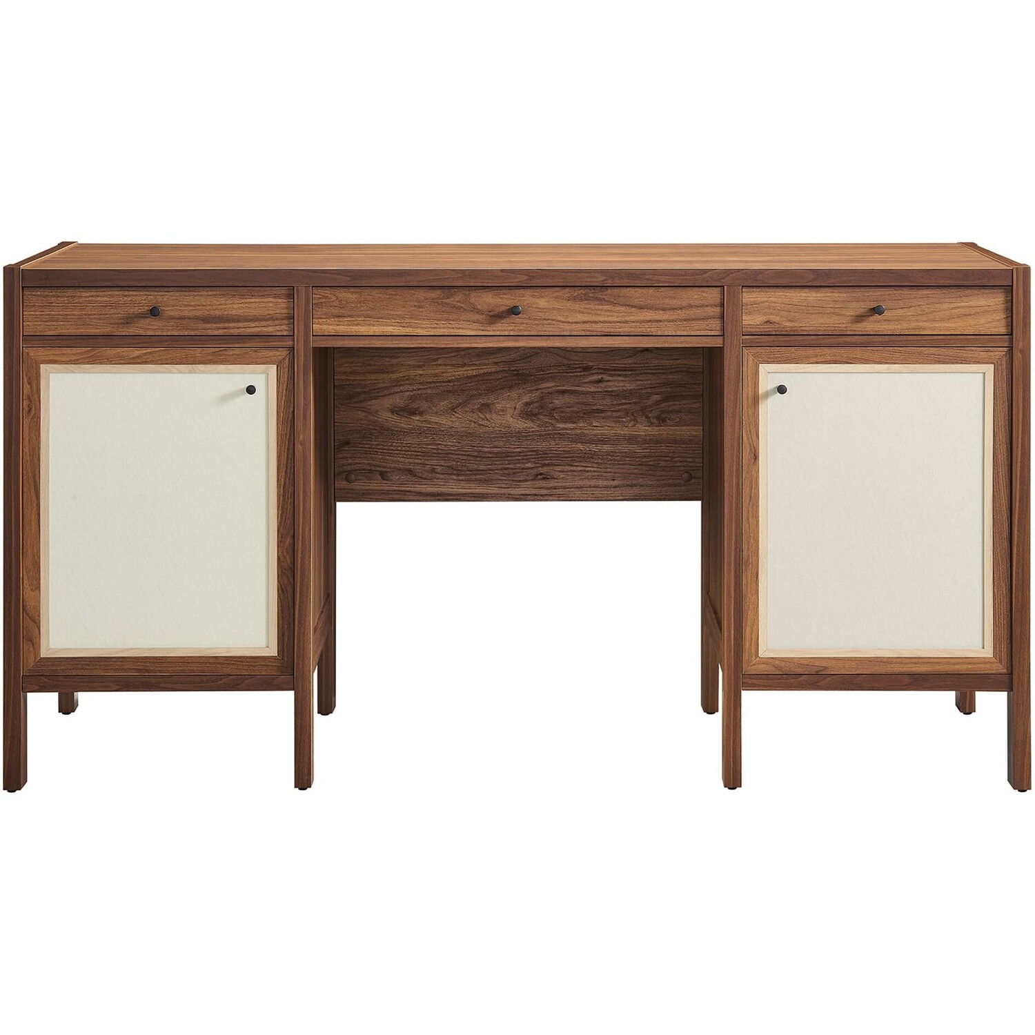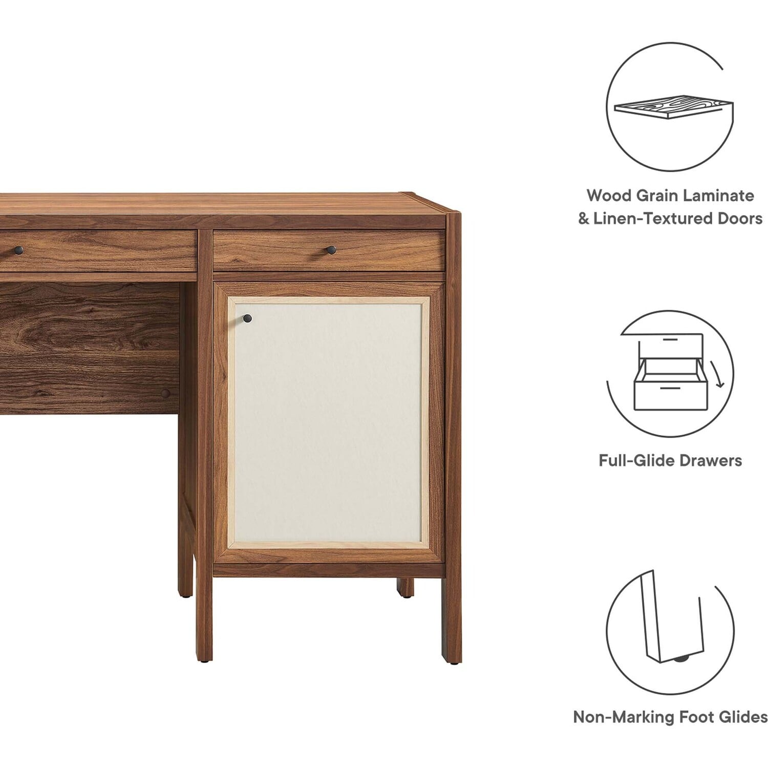 Elevate your home office or study area with the Capri Desk, a sleek and functional workspace solution. This desk features three full glide drawers and two concealed storage cabinets with linen-textured doors with soft-close hinges. Crafted with durable particleboard and MDF, it's finished with a wood grain laminate that adds a touch of organic aesthetics to its modern desk design. It's perfect as a computer desk or writing desk with drawers. Capri also doubles as a versatile vanity desk, providing a chic place to get ready in the morning. Its narrow design makes it an aesthetic desk that fits well in minimalist or mid-century modern interiors. This modern office desk is designed with non-marking glides to protect your flooring, a considerate addition to any room. Whether used in an office or a small space dressing table in your bedroom, the Capri Desk is a testament to modern craftsmanship and design, blending practicality with a clean, modern office desk aesthetic. Weight Capacity: 200 lbs.Wood Grain Laminate