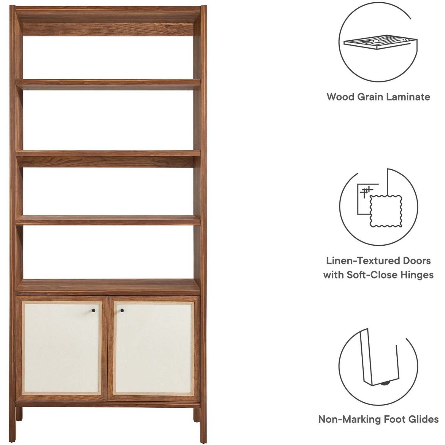 Elevate your space with the Capri Bookcase, a sleek and narrow office bookcase with four sturdy shelves perfect for displaying and organizing your favorite novels, decorative accessories, and more. This tall bookcase with storage boasts an elegant cabinet with two soft-close hinged doors featuring a linen-like texture, offering ample discreet storage. Constructed from durable particleboard and MDF with a wood grain laminate, the bookshelf offers organic aesthetics for any home office, reading nook, or living room. Easy to assemble, this open shelf bookcase with its non-marking glides is perfect as an office bookshelf or a storage cabinet for the living room, blending functionality and style seamlessly. Each Shelf Weight Capacity: 88 lbs.Wood Grain Laminate
