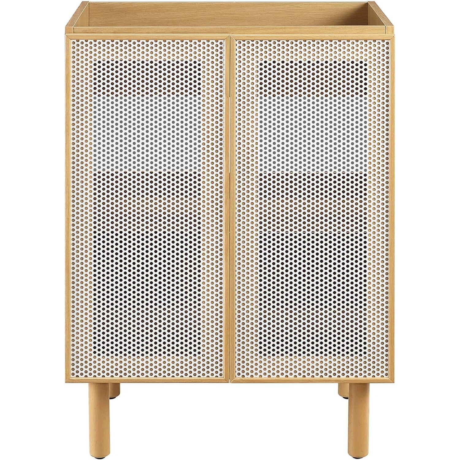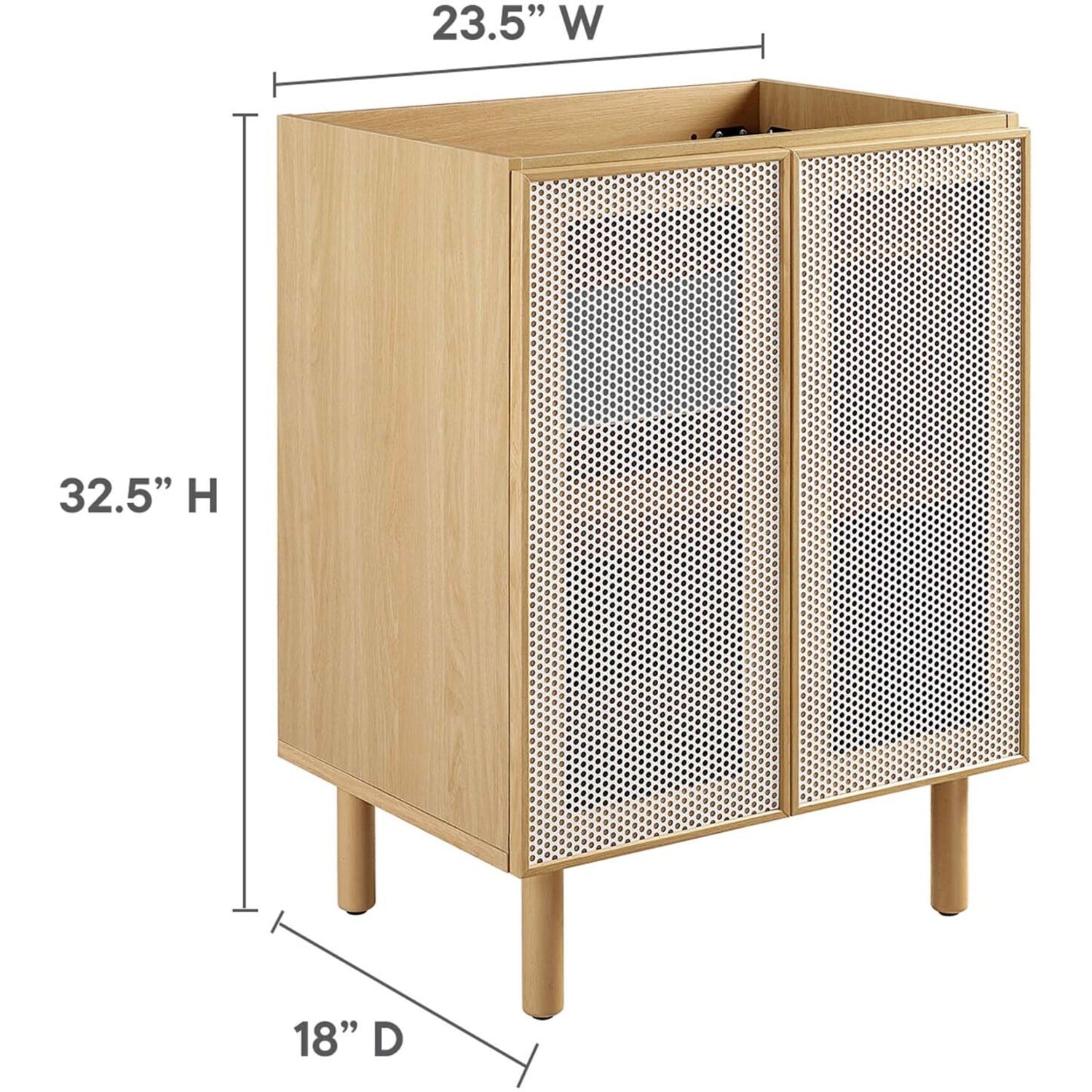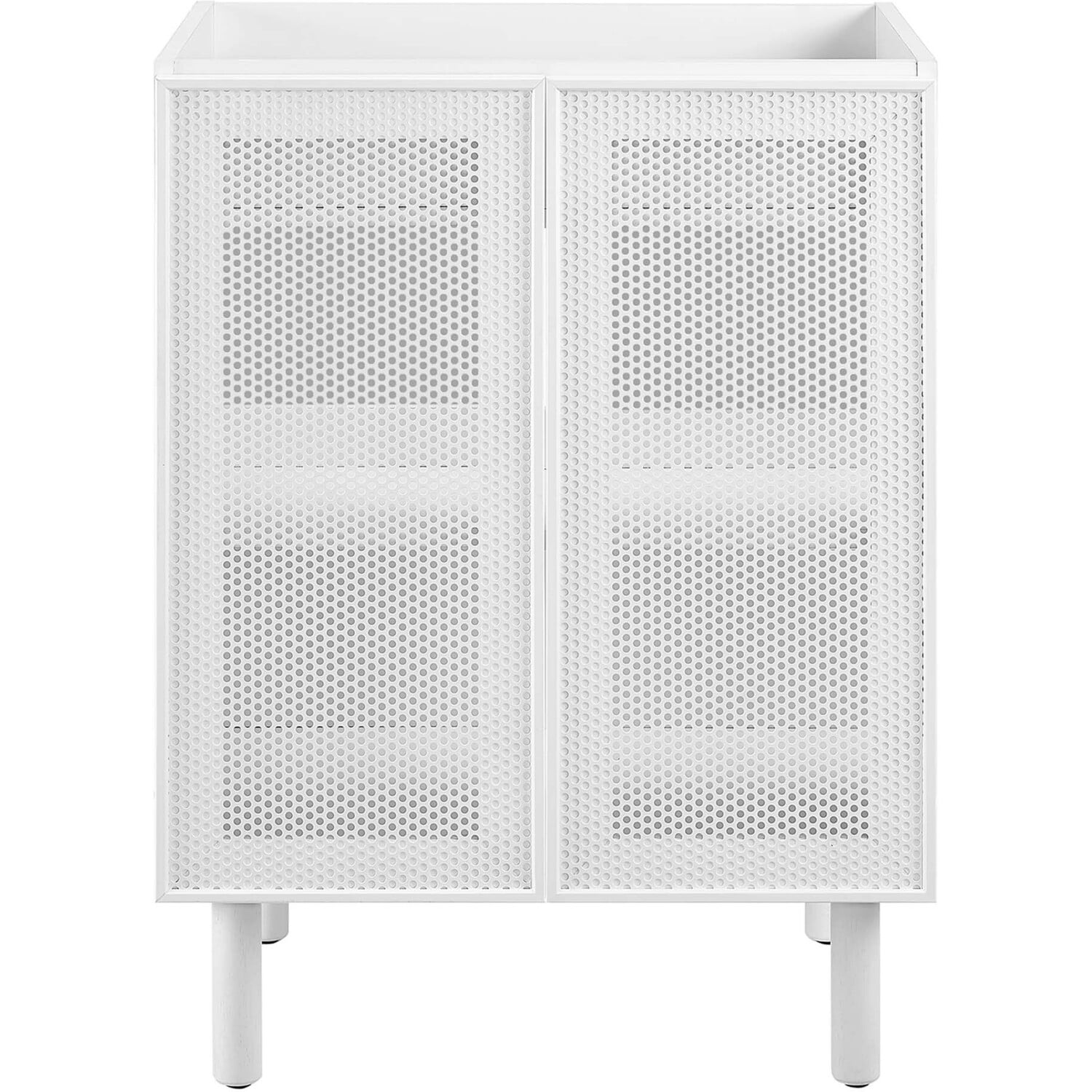 Elevate your bathroom space with the Calla 24" Bathroom Vanity Cabinet, where contemporary design meets everyday practicality. This single bathroom vanity features a durable particleboard construction with a smooth laminate finish that adds a modern touch to your bathroom decor. The unique perforated metal door fronts of this vanity cabinet offer a stylish update while concealing ample storage space for all your bathroom essentials. This small space vanity is customizable with its adjustable shelf, designed to accommodate your plumbing needs with ease. The push-to-open doors and sleek dowel legs highlight its minimalist design, while the bathroom cabinet's non-marking, adjustable foot levelers protect your flooring. The Calla vanity storage cabinet requires simple assembly, with clear instructions to guide you through the setup. Sink basin and fixtures not included.Perforated Metal Doors