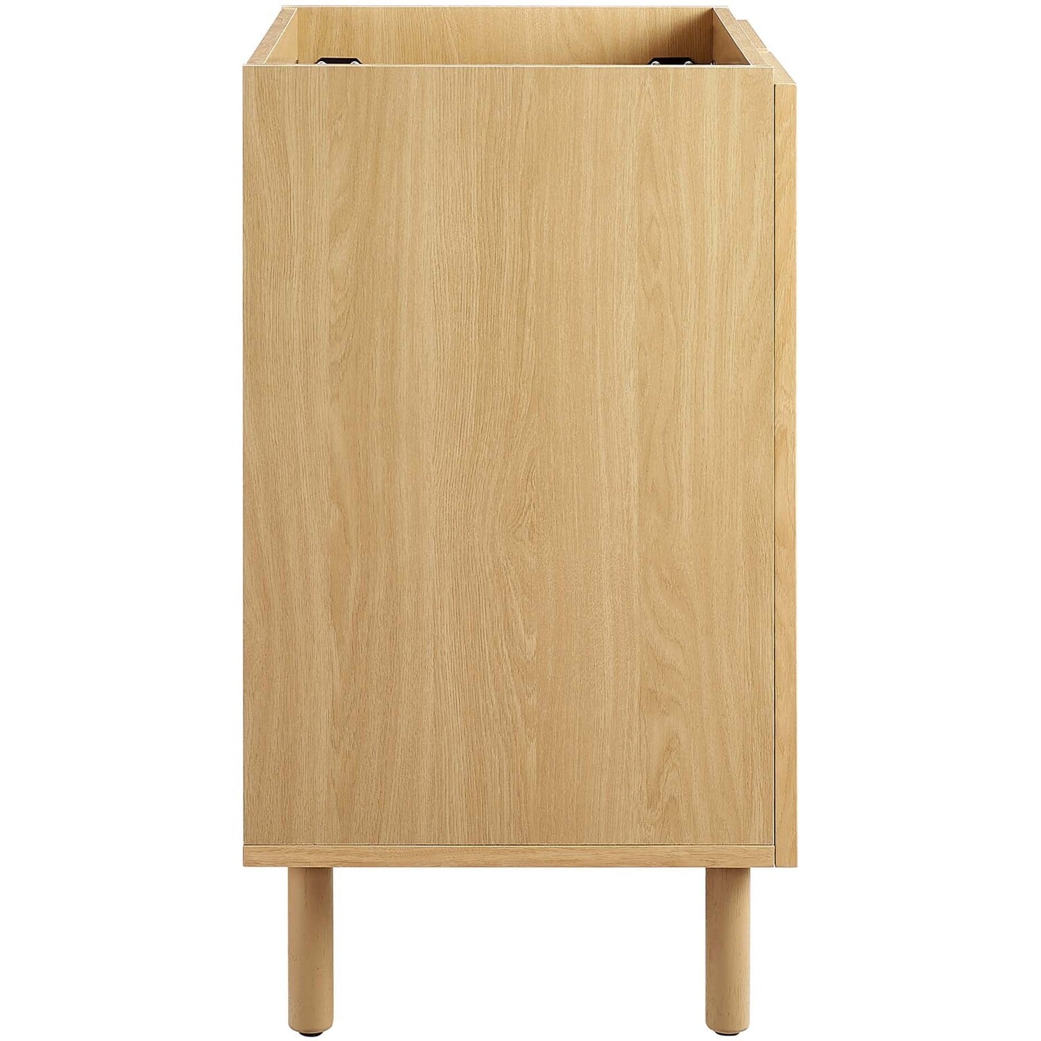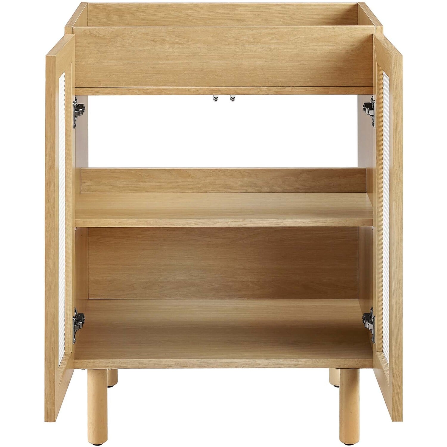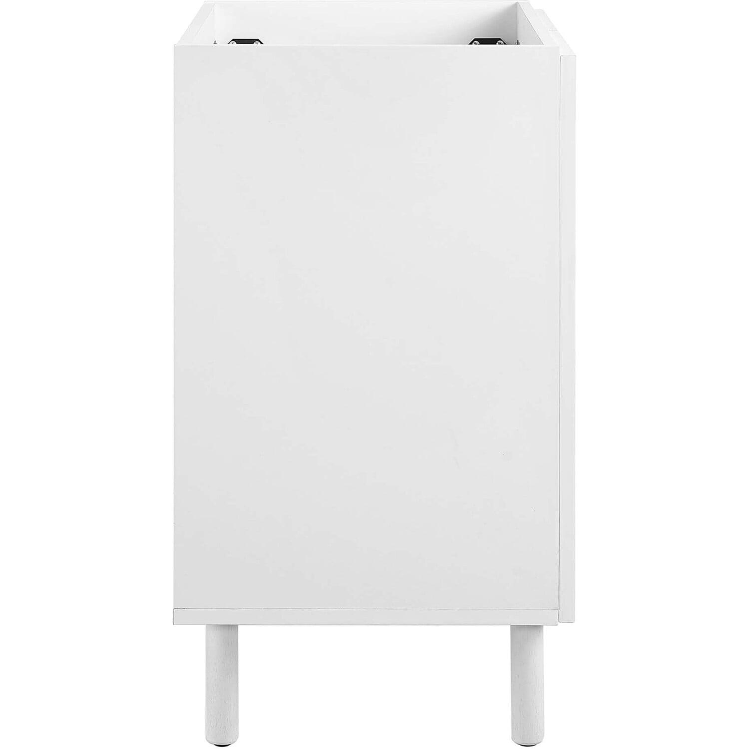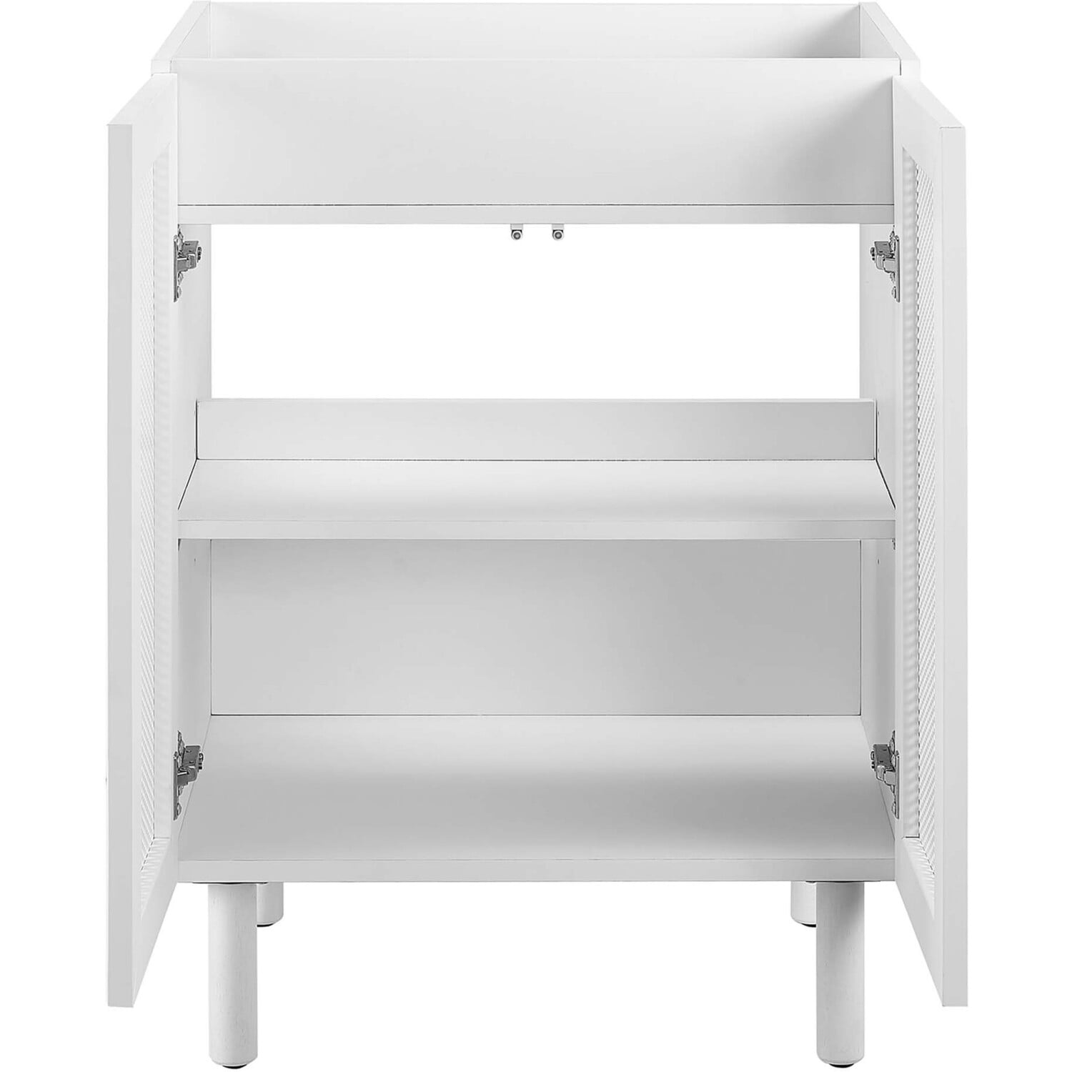 Elevate your bathroom space with the Calla 24" Bathroom Vanity Cabinet, where contemporary design meets everyday practicality. This single bathroom vanity features a durable particleboard construction with a smooth laminate finish that adds a modern touch to your bathroom decor. The unique perforated metal door fronts of this vanity cabinet offer a stylish update while concealing ample storage space for all your bathroom essentials. This small space vanity is customizable with its adjustable shelf, designed to accommodate your plumbing needs with ease. The push-to-open doors and sleek dowel legs highlight its minimalist design, while the bathroom cabinet's non-marking, adjustable foot levelers protect your flooring. The Calla vanity storage cabinet requires simple assembly, with clear instructions to guide you through the setup. Sink basin and fixtures not included.Perforated Metal Doors