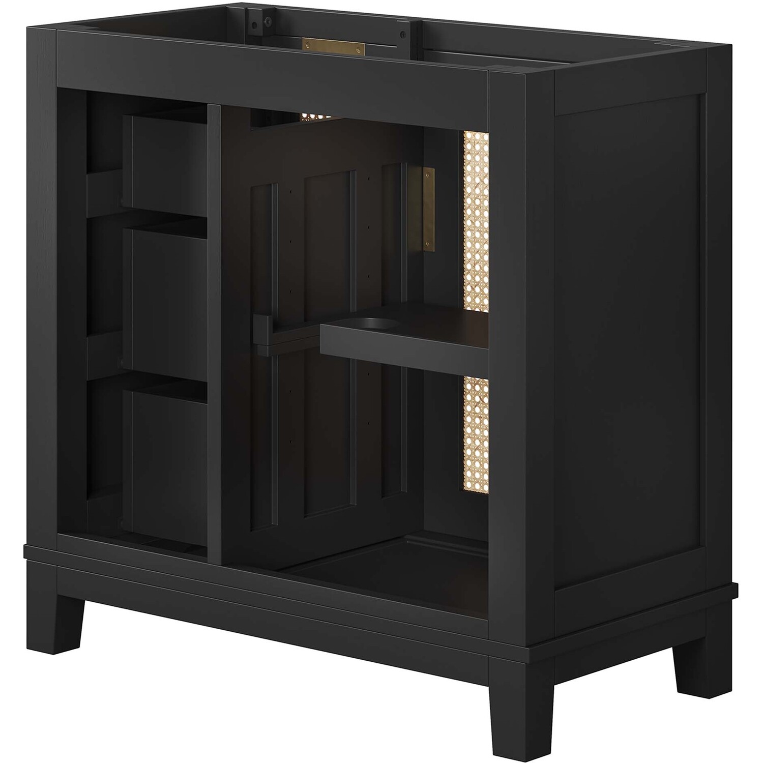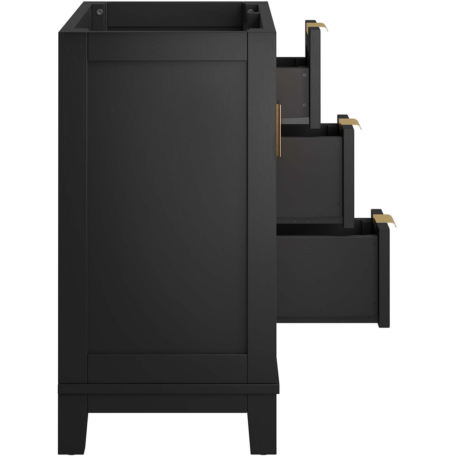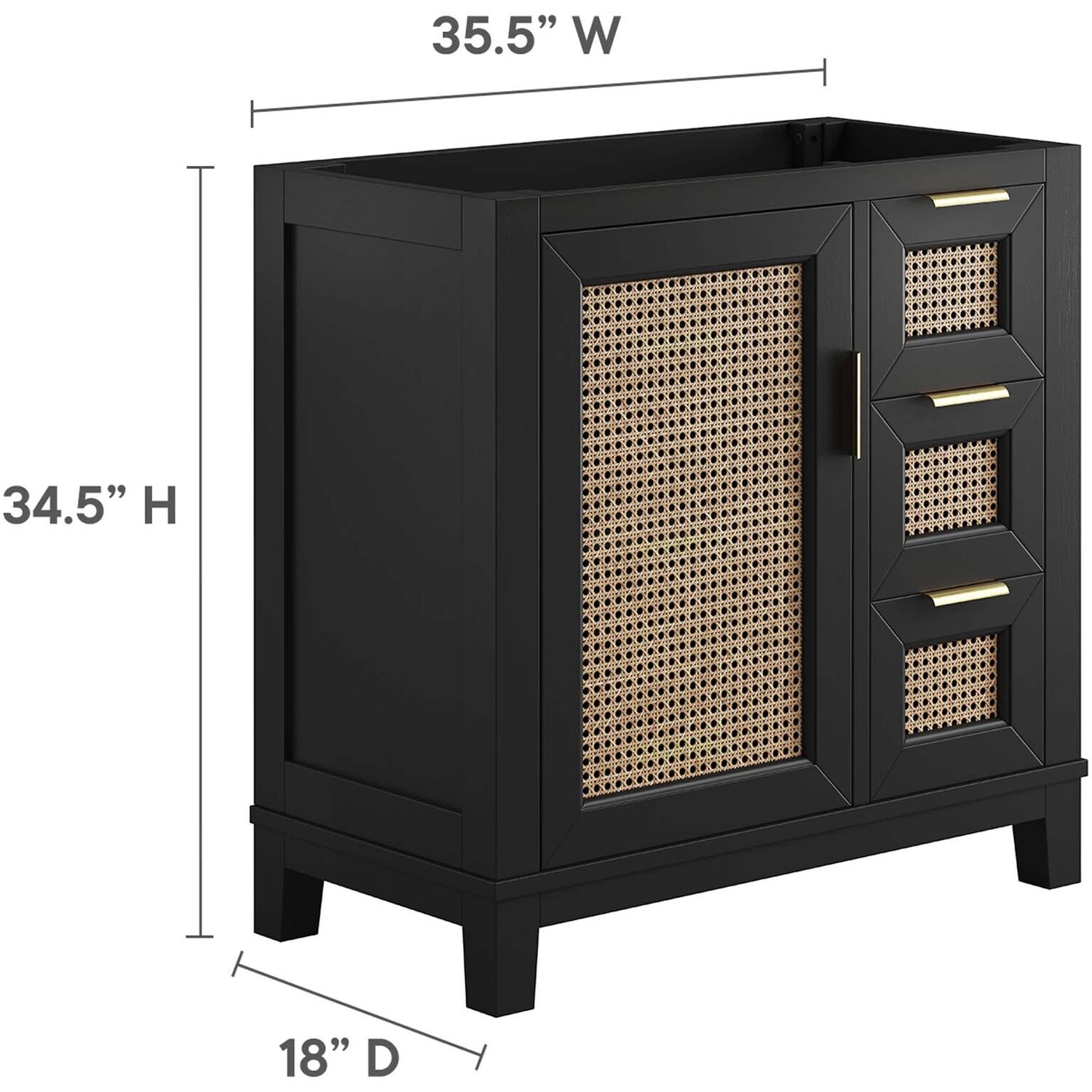 With clean lines, smooth surfaces, and contemporary angles, the Dixie 36” Bathroom Vanity Cabinet introduces a layer of modern sophistication to any bathroom space. Crafted from solid Mahogany wood, it stands firm on tapered legs and is characterized by its bold, edgy lines. This vanity features one cabinet door, concealing a height-adjustable shelf with a cut-out design to accommodate plumbing, and three adjacent drawers, enhancing functionality and storage space. All compartments are tastefully adorned with satin brass handles and equipped with soft close hinges, for a smooth experience. Optimizing storage for a variety of bathroom essentials, from towels to toiletries, the Dixie Bathroom Vanity Cabinet ensures that everything is conveniently at hand. Includes non-marking foot caps to protect flooring. Sink basin and fixtures not included. Assembly required. Weight Capacity: 200 lbsSolid Mahogany Wood