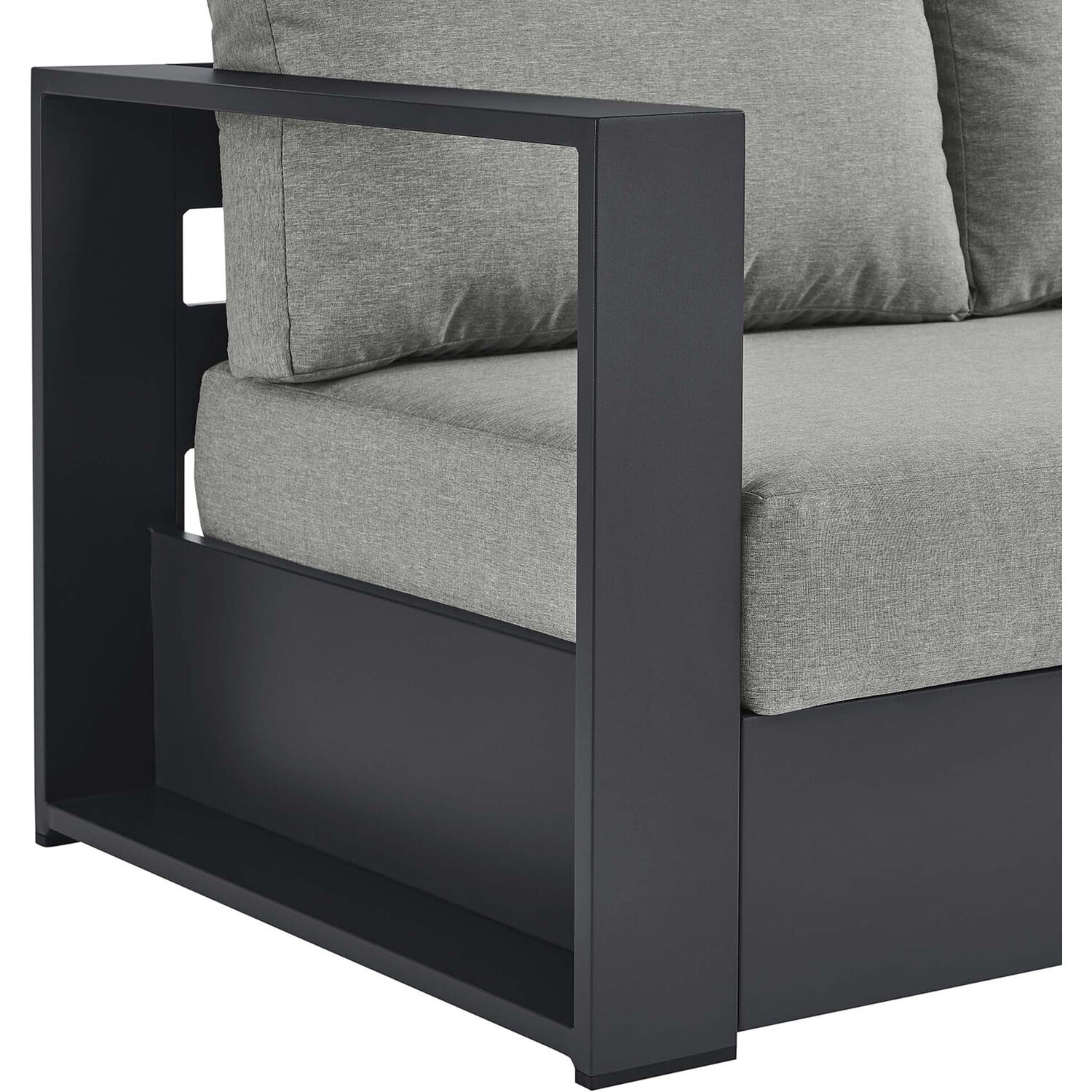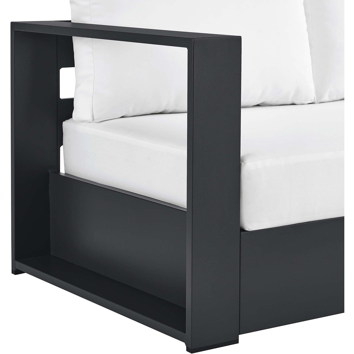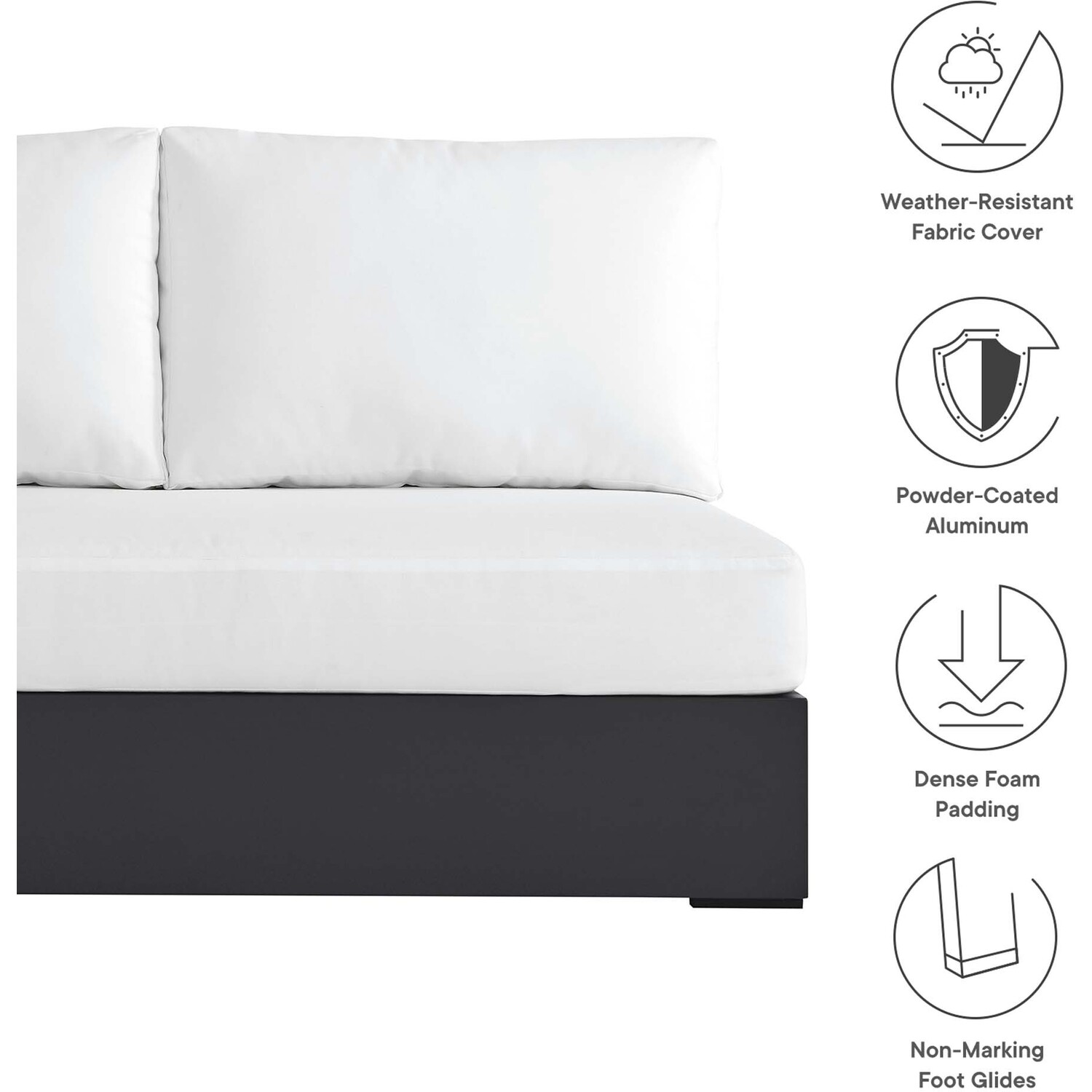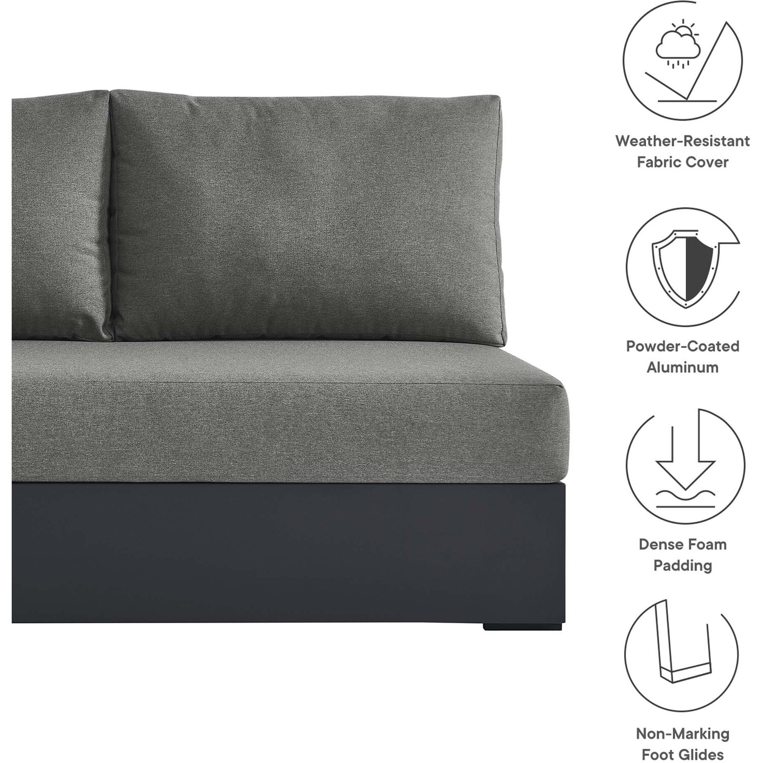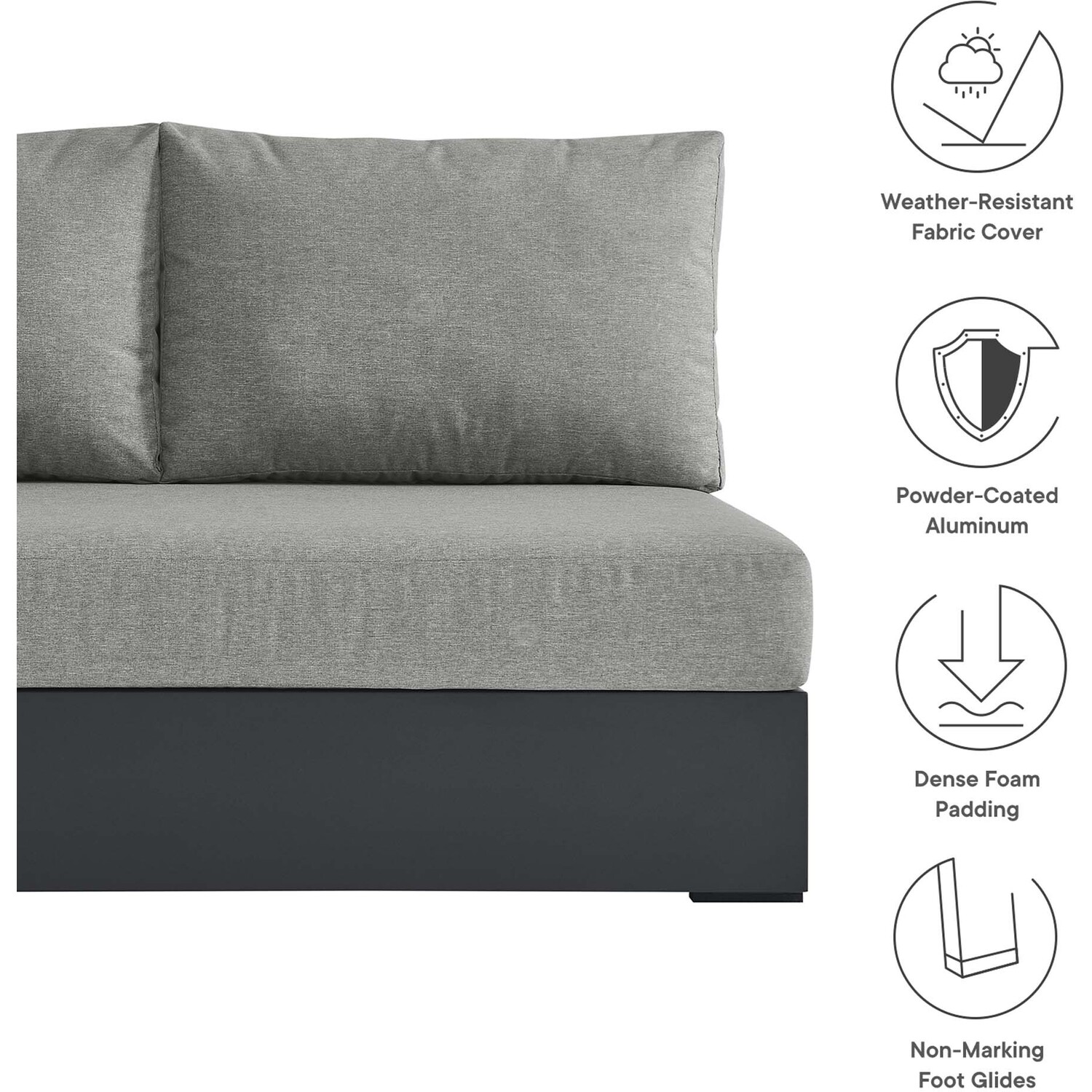 Enliven your alfresco spaces with the Tahoe Left-Facing Outdoor Patio Loveseat. This modern outdoor loveseat is constructed with well-crafted, durable powder-coated aluminum, dispensing contemporary elegance in your outdoor lounge spaces. Its dense foam padding ensures sustained comfort, making it ideal for poolside lounging or as cozy porch seating, complete with a UV and water-resistant fabric-covered seat and backrest pillows. The cushion covers are removable for easy machine washing. Part of a modular outdoor furniture collection, this left-facing patio couch features a sturdy armrest on one side and an open end on the other, making it ideal for pairing with its matching sectional piece or versatile positioning with other outdoor furniture. The entire Tahoe aluminum patio furniture set features non-marking foot glides to protect your deck or patio floor and comes with easy-to-follow assembly instructions. Weight Capacity: 661 lbs.Outdoor Patio Sectional Sofa Piece