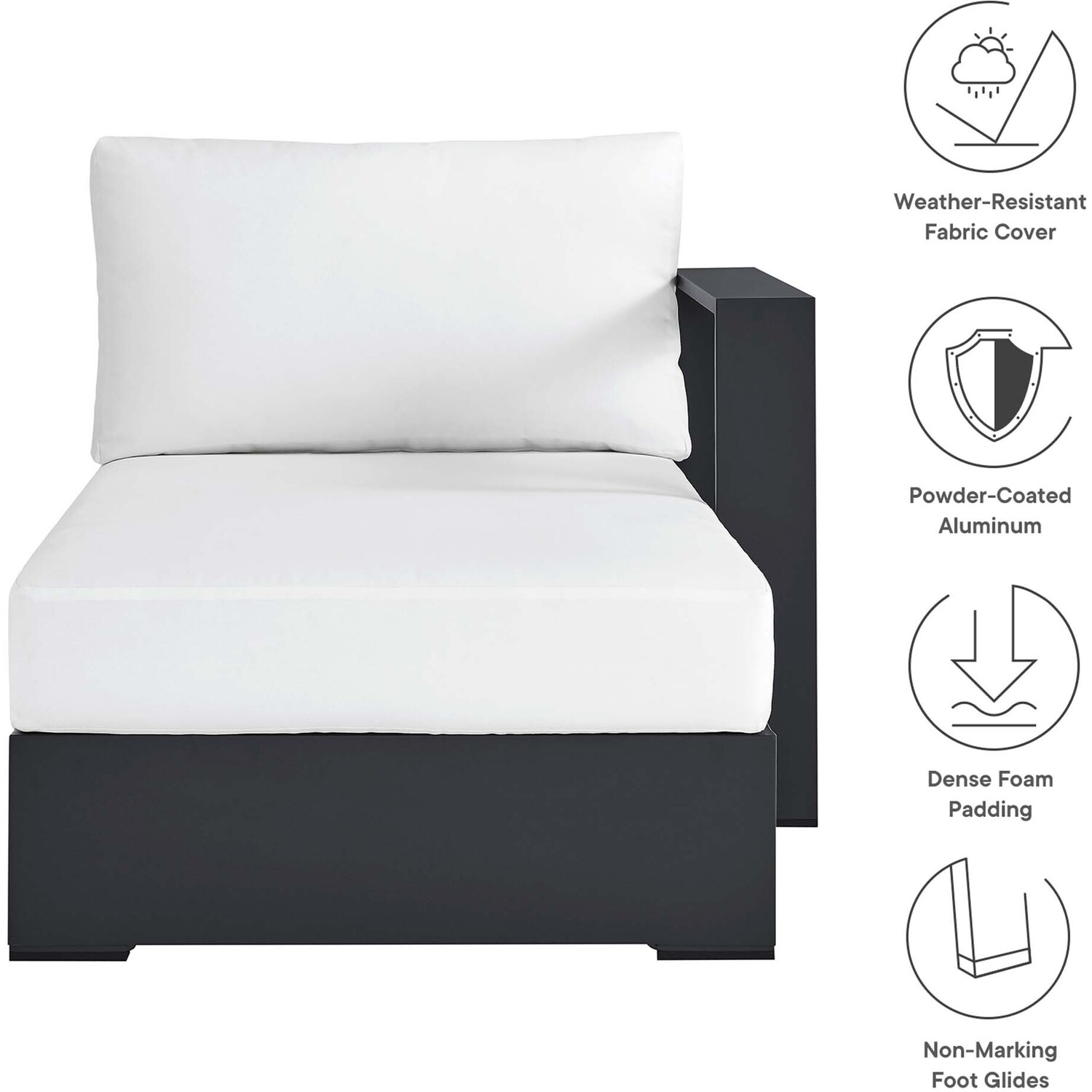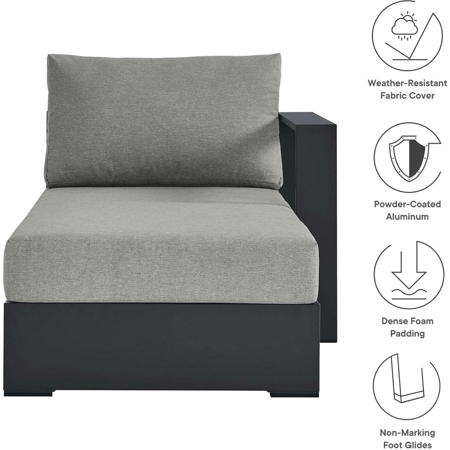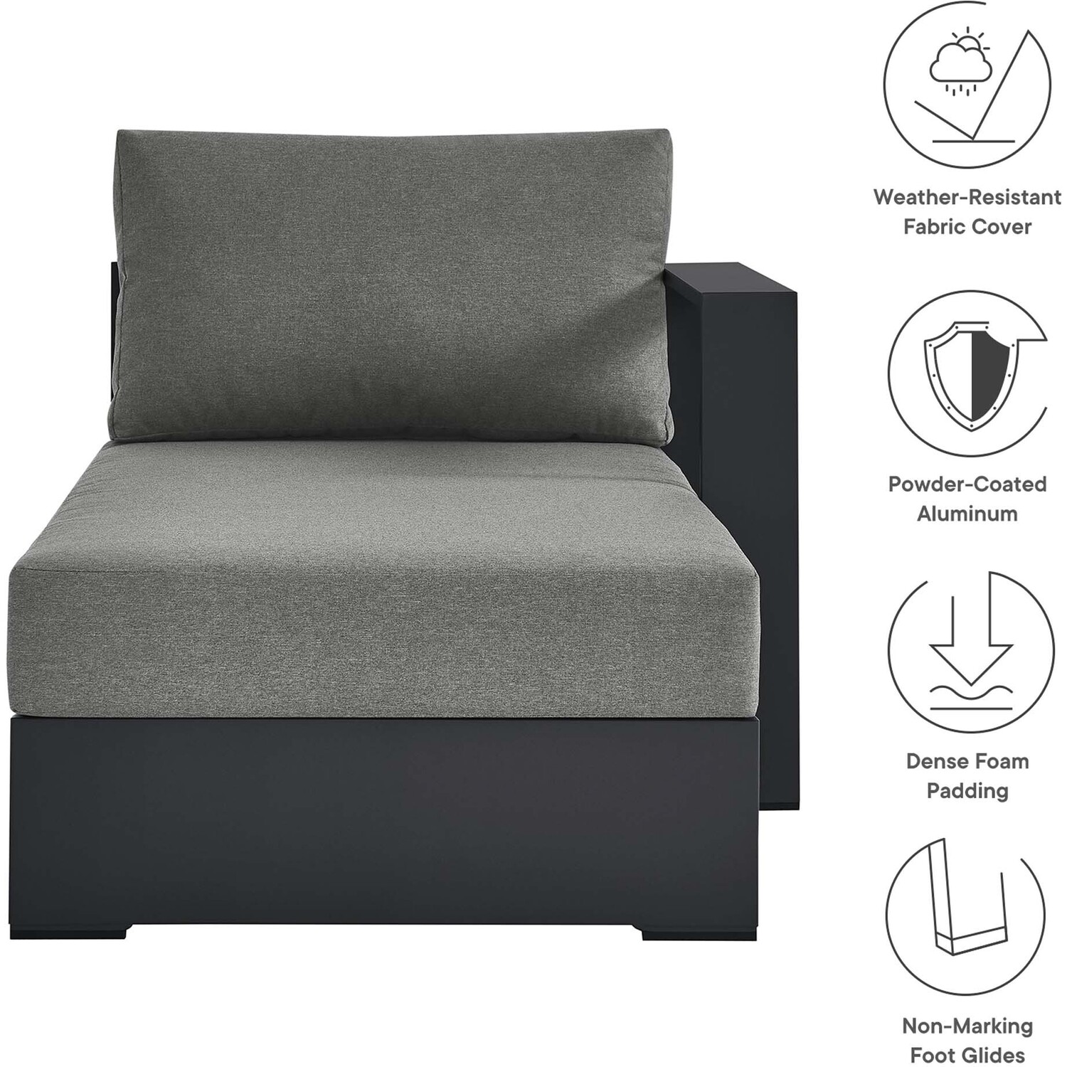 Enliven your alfresco spaces with the Tahoe Aluminum Outdoor Patio Right-Facing Chaise Lounge. This modern lounge chair is constructed with well-crafted, durable powder-coated aluminum, dispensing contemporary elegance in your outdoor lounge spaces. Its dense foam padding ensures sustained comfort, making it ideal for poolside lounging or as an outdoor patio sunbed, complete with a UV and water-resistant fabric-covered seat and backrest. The cushion covers are removable for easy machine washing. Part of a modular outdoor furniture collection, this right-facing sofa chair features a sturdy armrest on one side and an open end on the other, making it ideal for pairing with its matching sectional piece or versatile positioning with other outdoor furniture. The entire Tahoe aluminum patio furniture set features non-marking foot glides to protect your deck or patio floor and comes with easy-to-follow assembly instructions. Weight Capacity: 661 lbs.Outdoor Patio Sectional Sofa Piece