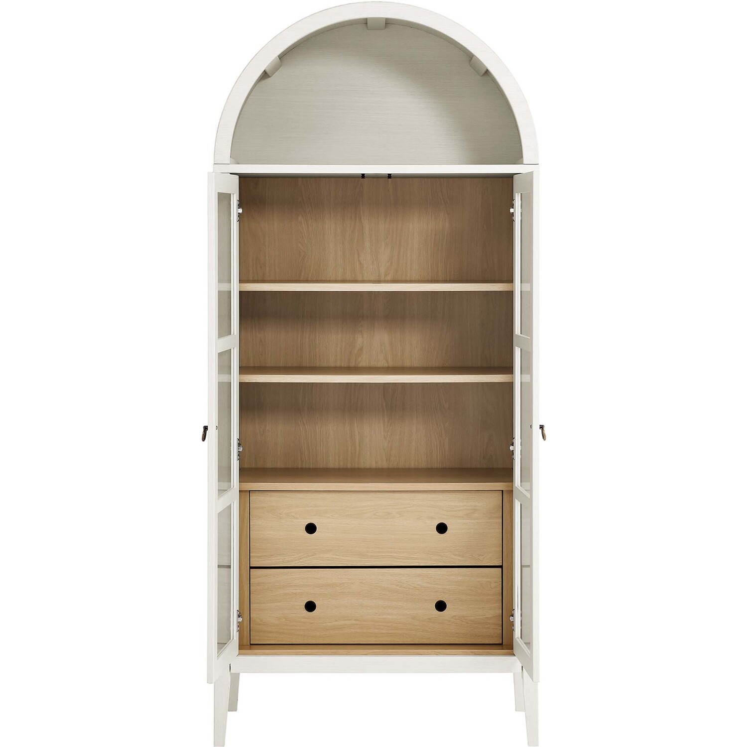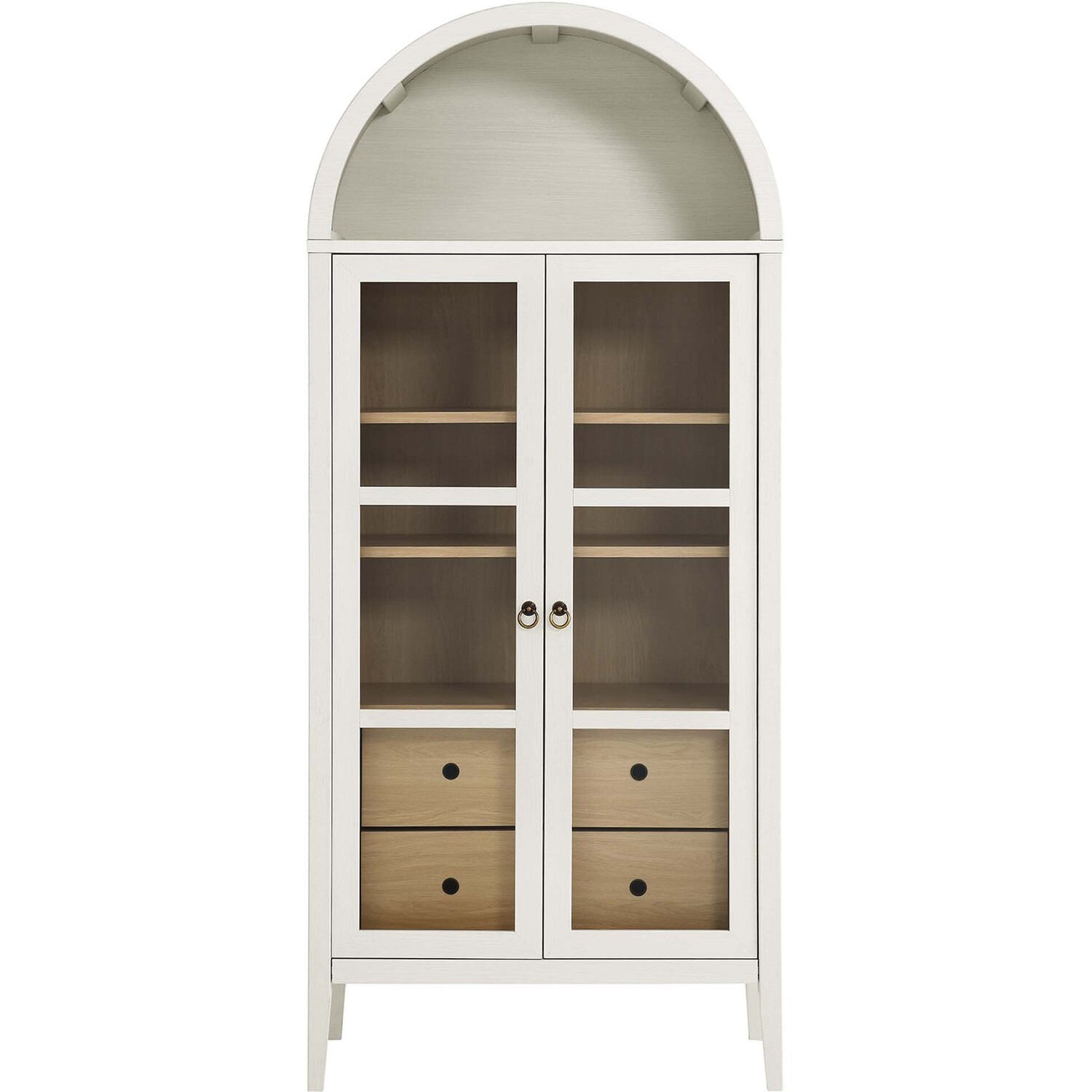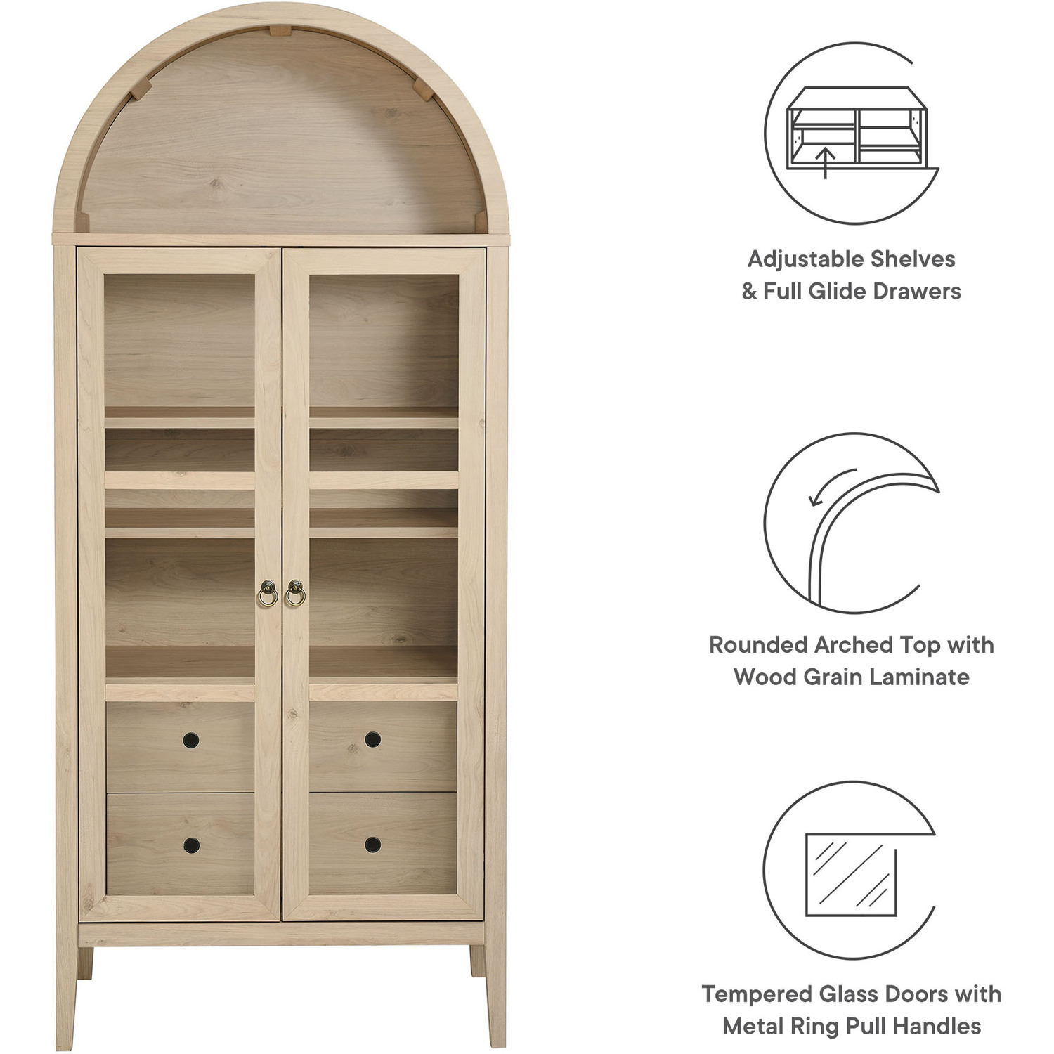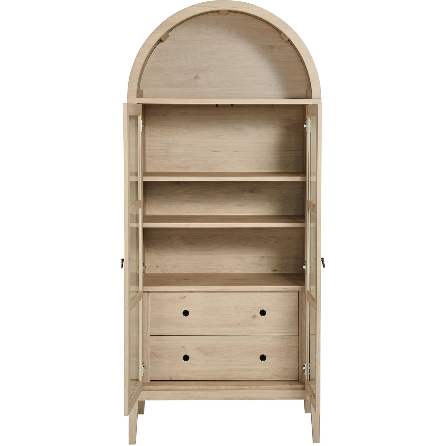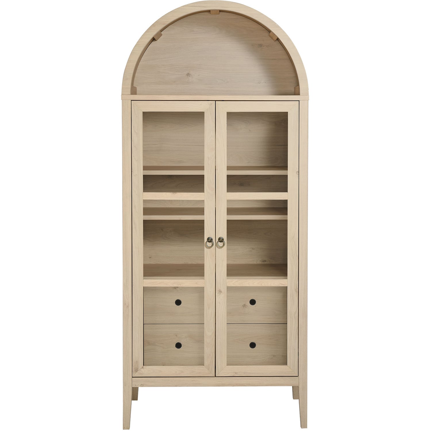The Nolan Display Cabinet combines functional storage versatility with charming modern farmhouse style. Crafted from MDF and particleboard, the chic design flaunts wood grain laminate, edge trimming, and an elegantly rounded arched top shelf. Supported by tapered wood legs, the Nolan tall storage cabinet boasts two doors with tempered glass windows that provide an open view to its interior. Inside the arched cabinet you’ll find two adjustable shelves, a fixed shelf, and two roomy full-glide drawers, offering plenty of storage space for displaying decorative items or for tucking away odds and ends. Complete with soft-close hinges and metal ring pull handles with a brushed gold finish, this wood storage cabinet is as stylish as it is practical. Perfect for your living room, hallway, or dining area, this arched bookcase effortlessly adds an air of sophistication and vintage allure to your home. To protect your flooring, this tall storage cabinet with doors comes equipped with non-marking foot pads. Assembly required. Weight Capacity: Arched Shelf: 88 lbs, Adjustable Shelves: 70 lbs, Fixed Shelf: 62 lbs, Drawers: 22 lbsMDF and Particleboard