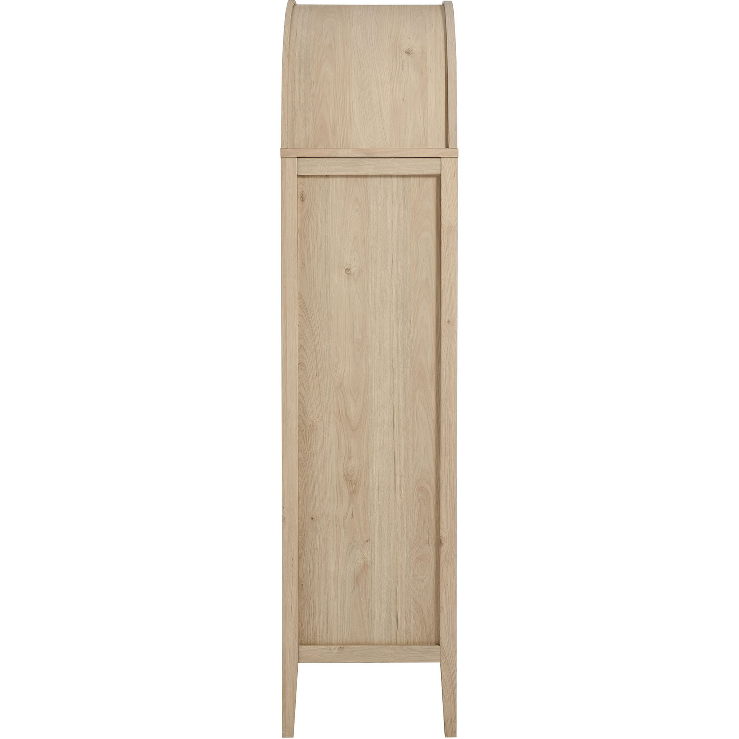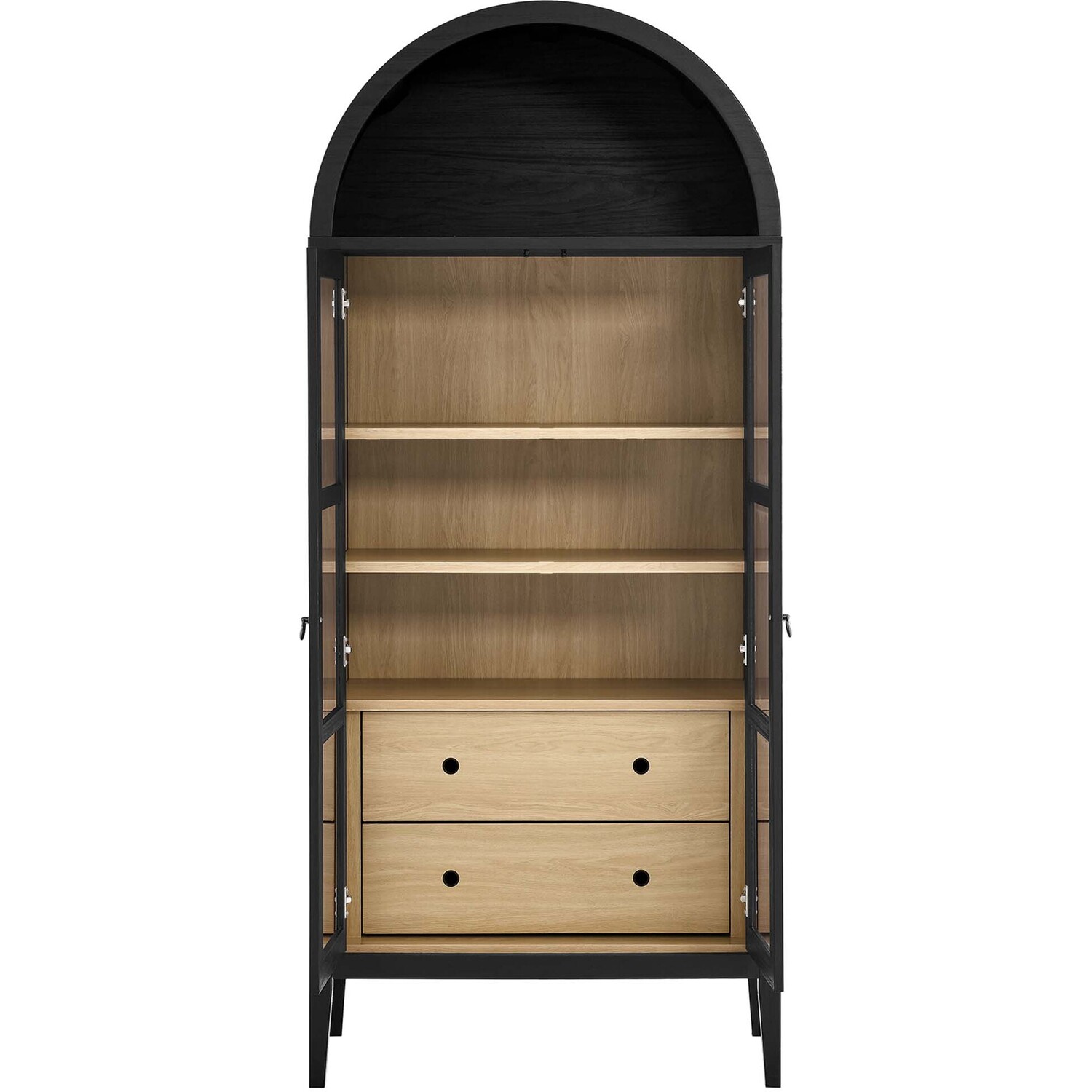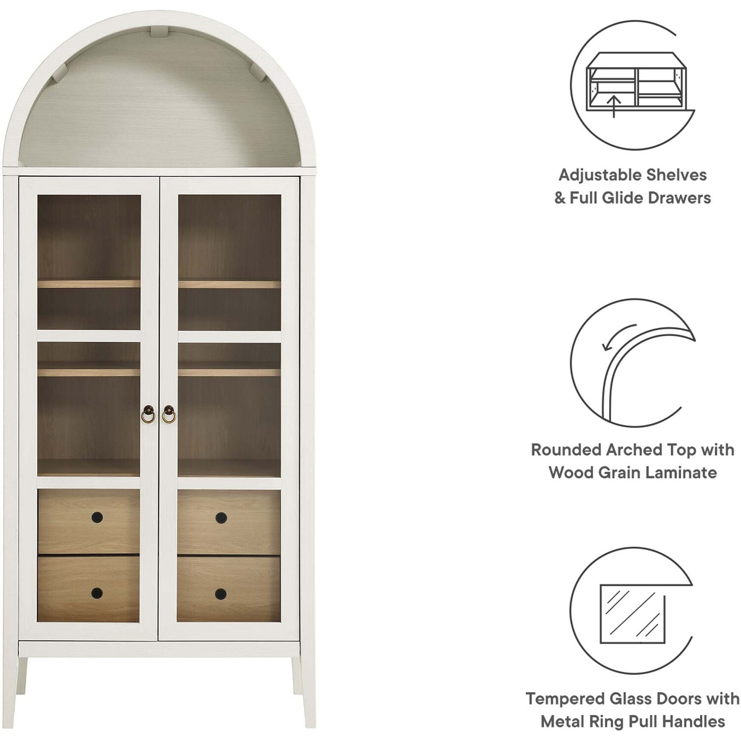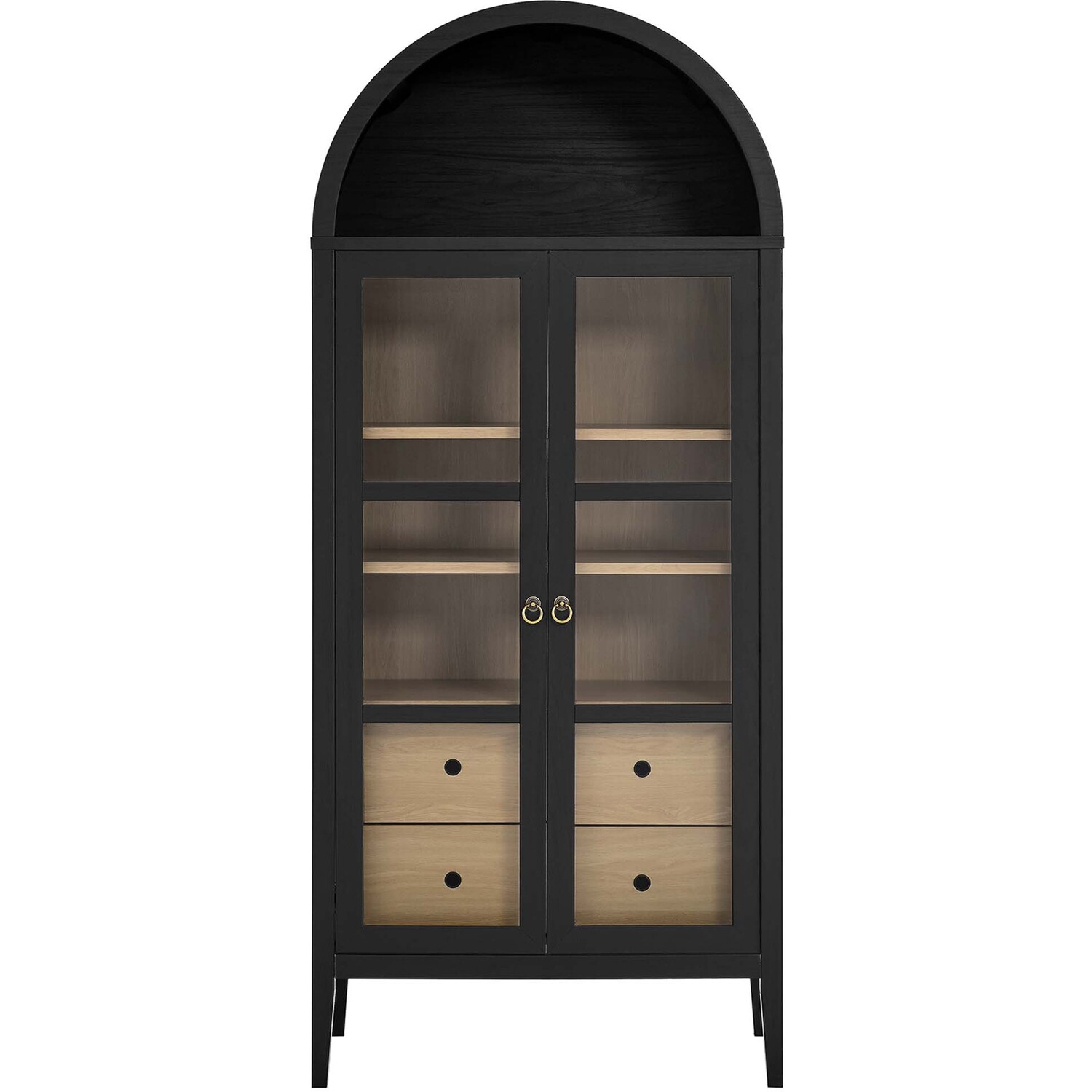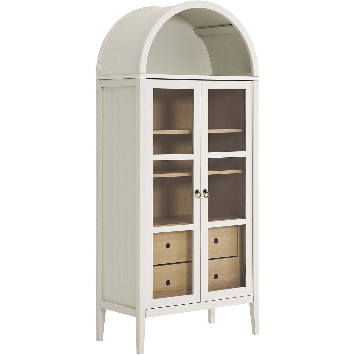 The Nolan Display Cabinet combines functional storage versatility with charming modern farmhouse style. Crafted from MDF and particleboard, the chic design flaunts wood grain laminate, edge trimming, and an elegantly rounded arched top shelf. Supported by tapered wood legs, the Nolan tall storage cabinet boasts two doors with tempered glass windows that provide an open view to its interior. Inside the arched cabinet you’ll find two adjustable shelves, a fixed shelf, and two roomy full-glide drawers, offering plenty of storage space for displaying decorative items or for tucking away odds and ends. Complete with soft-close hinges and metal ring pull handles with a brushed gold finish, this wood storage cabinet is as stylish as it is practical. Perfect for your living room, hallway, or dining area, this arched bookcase effortlessly adds an air of sophistication and vintage allure to your home. To protect your flooring, this tall storage cabinet with doors comes equipped with non-marking foot pads. Assembly required. Weight Capacity: Arched Shelf: 88 lbs, Adjustable Shelves: 70 lbs, Fixed Shelf: 62 lbs, Drawers: 22 lbsMDF and Particleboard