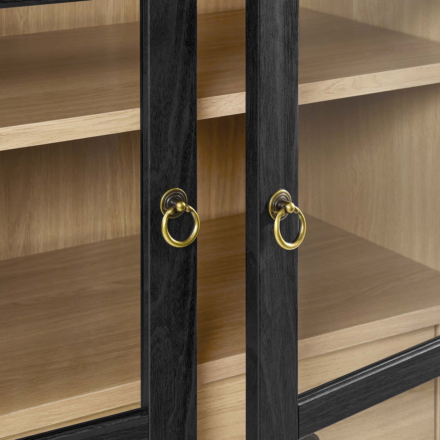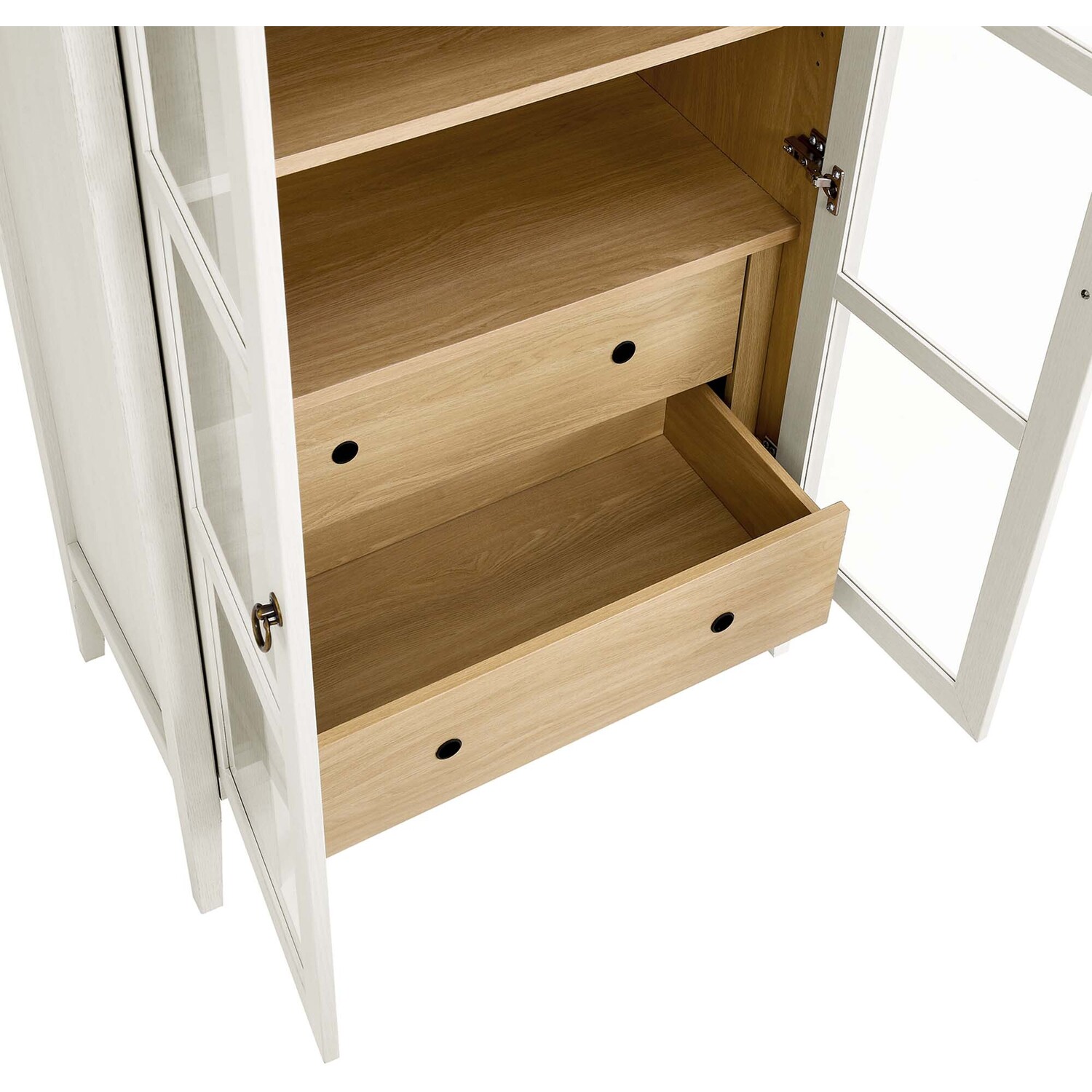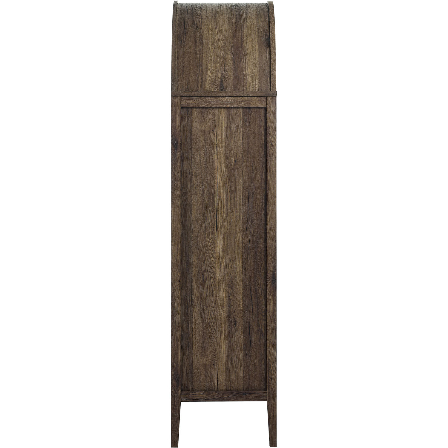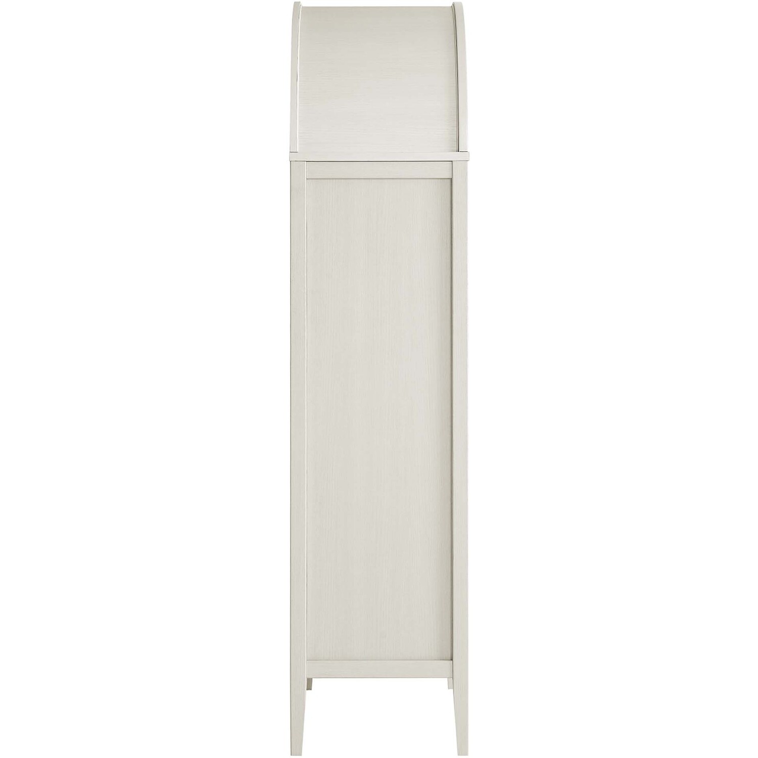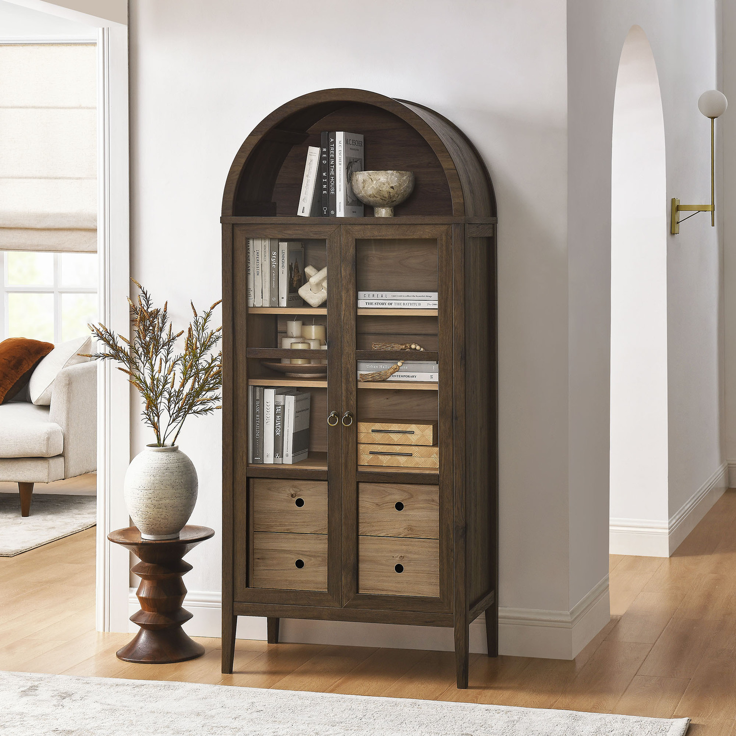 The Nolan Display Cabinet combines functional storage versatility with charming modern farmhouse style. Crafted from MDF and particleboard, the chic design flaunts wood grain laminate, edge trimming, and an elegantly rounded arched top shelf. Supported by tapered wood legs, the Nolan tall storage cabinet boasts two doors with tempered glass windows that provide an open view to its interior. Inside the arched cabinet you’ll find two adjustable shelves, a fixed shelf, and two roomy full-glide drawers, offering plenty of storage space for displaying decorative items or for tucking away odds and ends. Complete with soft-close hinges and metal ring pull handles with a brushed gold finish, this wood storage cabinet is as stylish as it is practical. Perfect for your living room, hallway, or dining area, this arched bookcase effortlessly adds an air of sophistication and vintage allure to your home. To protect your flooring, this tall storage cabinet with doors comes equipped with non-marking foot pads. Assembly required. Weight Capacity: Arched Shelf: 88 lbs, Adjustable Shelves: 70 lbs, Fixed Shelf: 62 lbs, Drawers: 22 lbsMDF and Particleboard