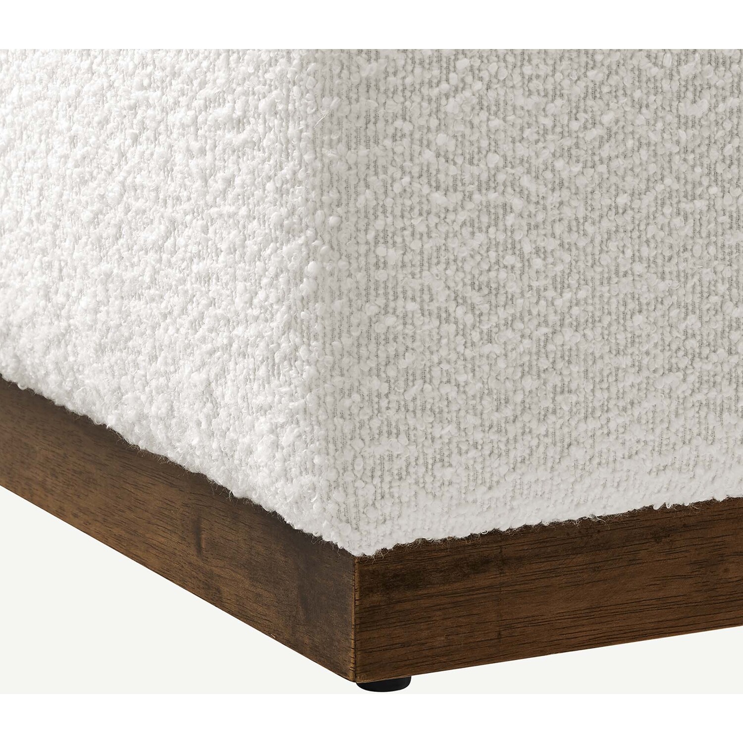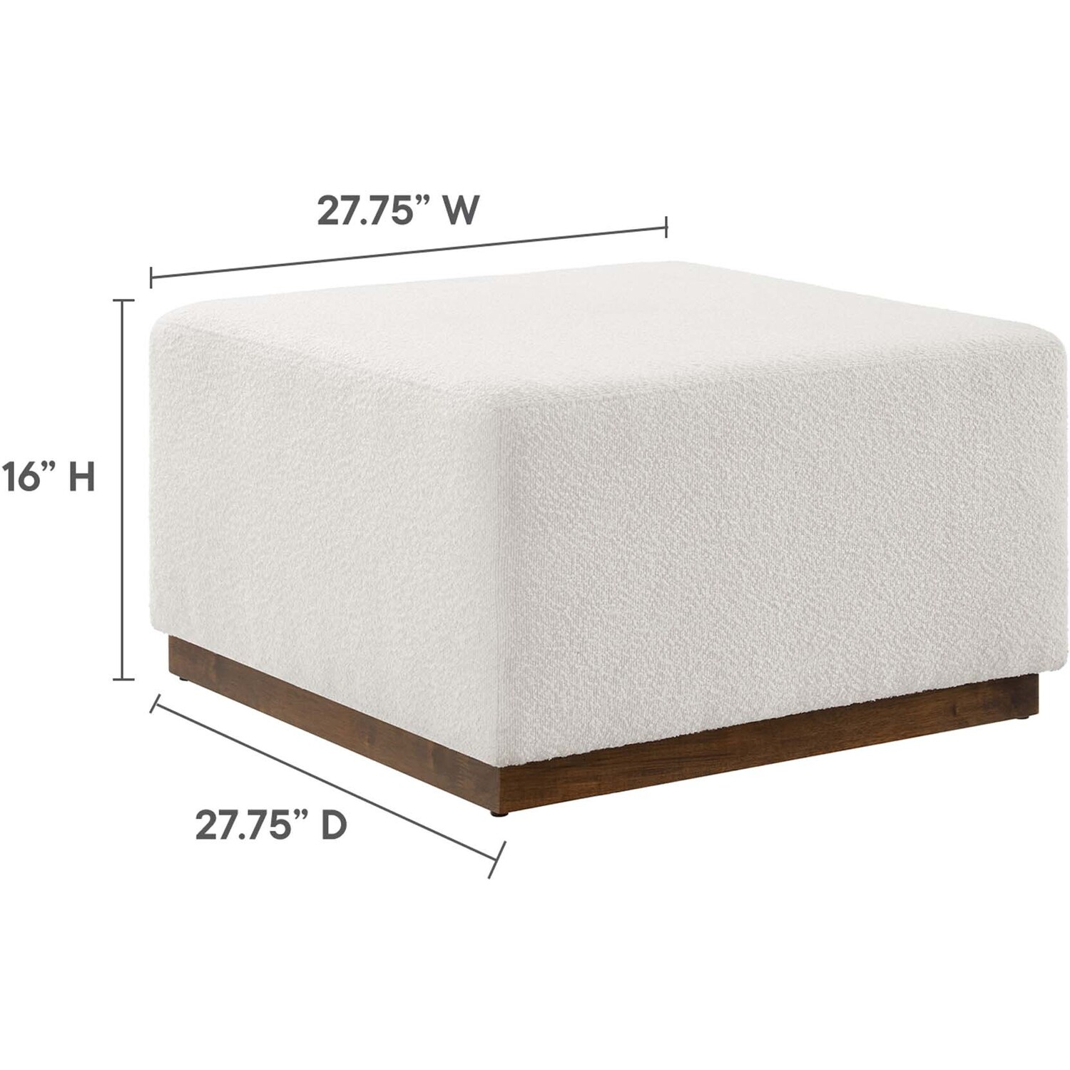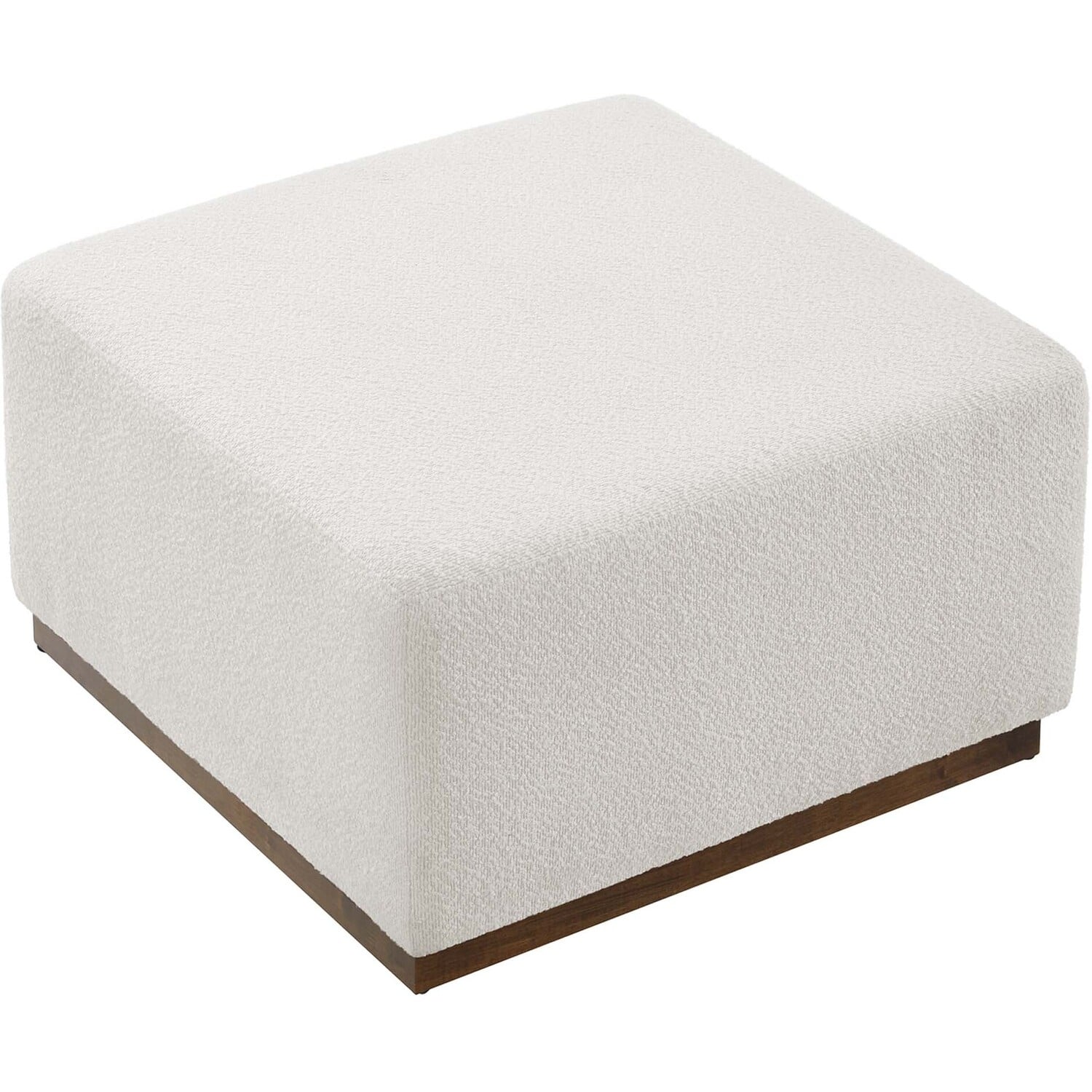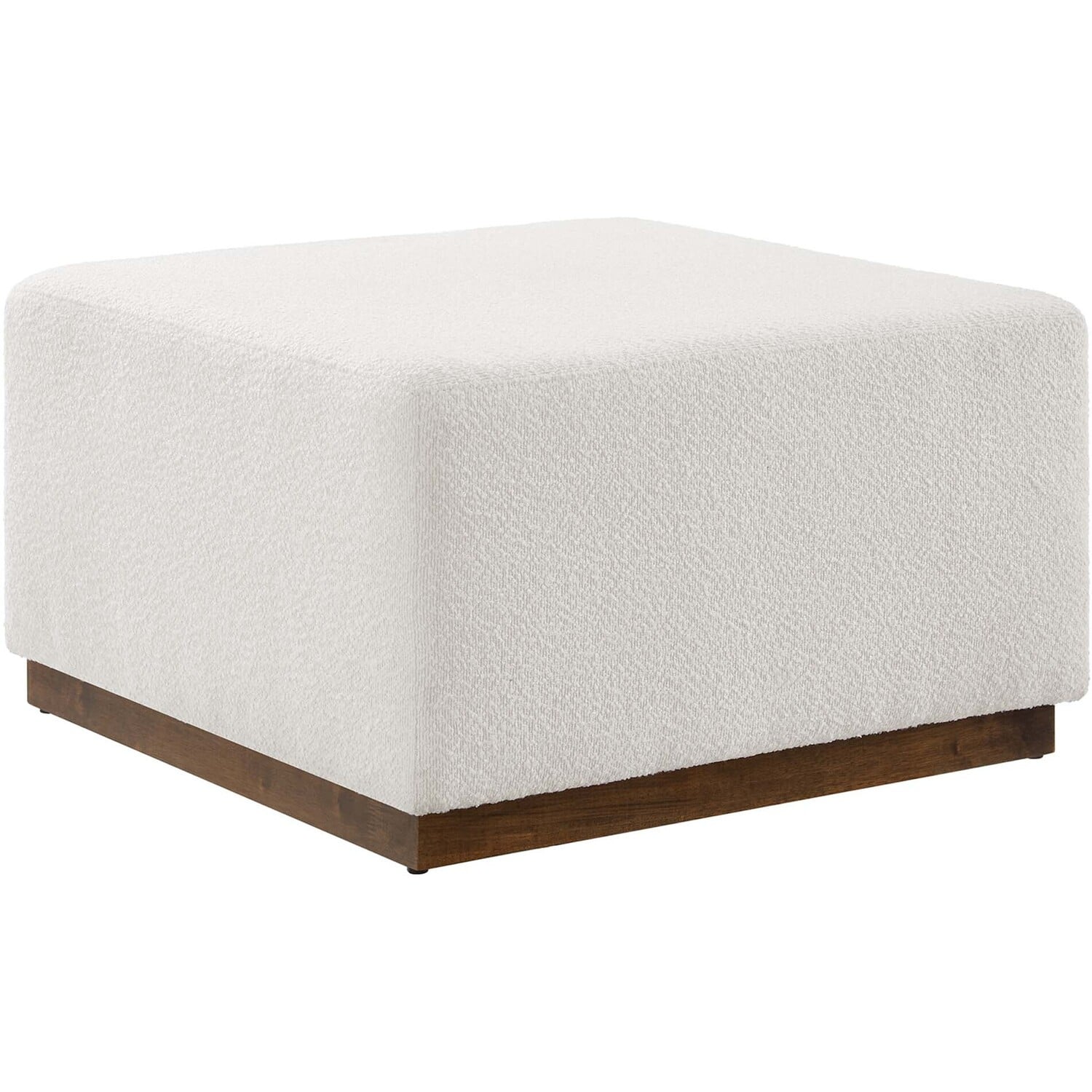 Delight in the elegance of the Tilden 28" Square Upholstered Ottoman, an ideal accent ottoman for modern homes, offices, or cozy apartments. Upholstered in boucle fabric with a nubby texture and French piping trim, this large ottoman footstool offers both luxury and durability. Its tailored silhouette complements contemporary decor, while the dense foam padding provides versatile use as a comfortable ottoman seat, large footrest, or living room ottoman coffee table. Resting on a rubberwood plinth base with non-marking glides, this ottoman table protects your floors from damage. Arriving fully assembled, the Tilden fabric ottoman combines chic style and functionality. Weight Capacity: 506 lbs.Boucle Fabric Upholstery