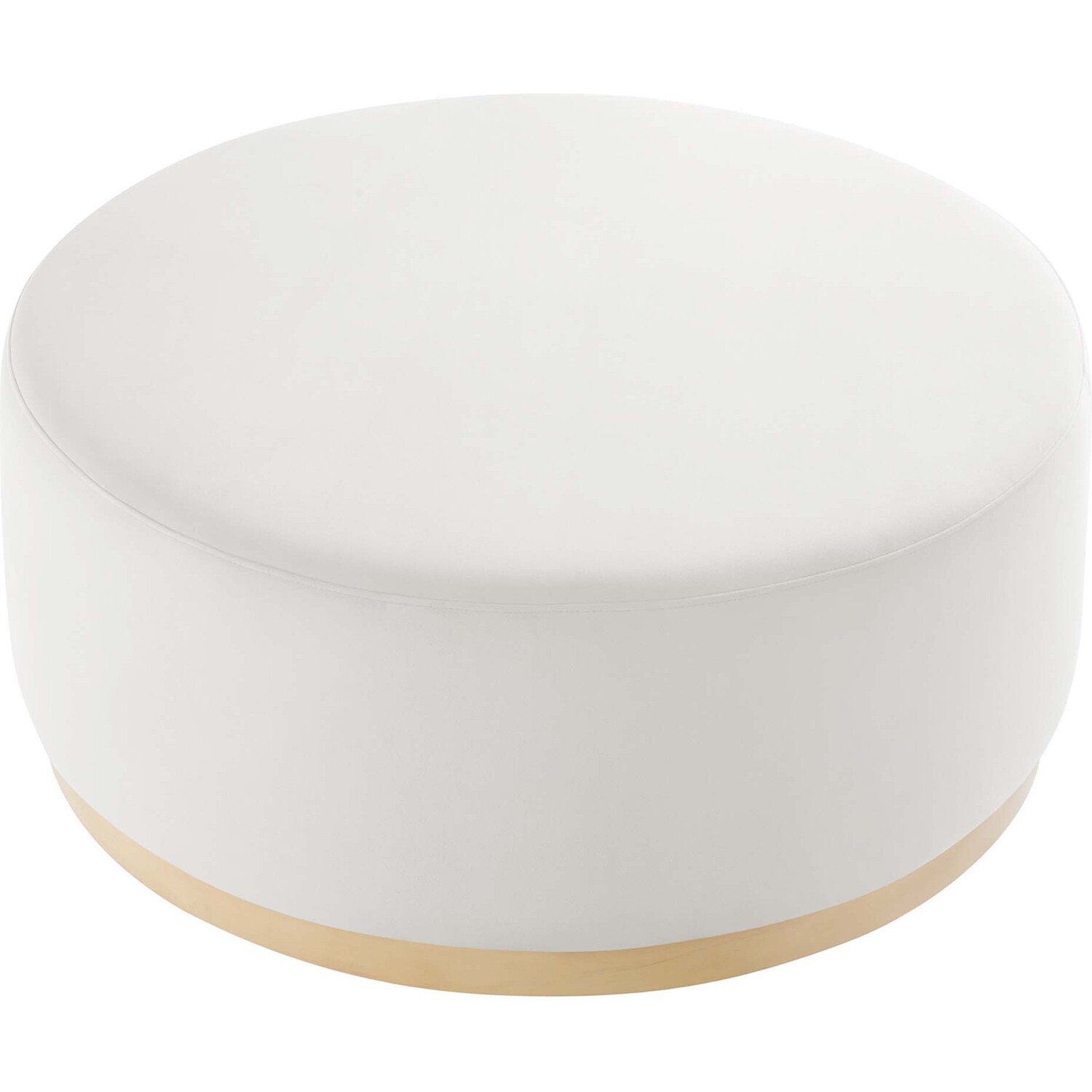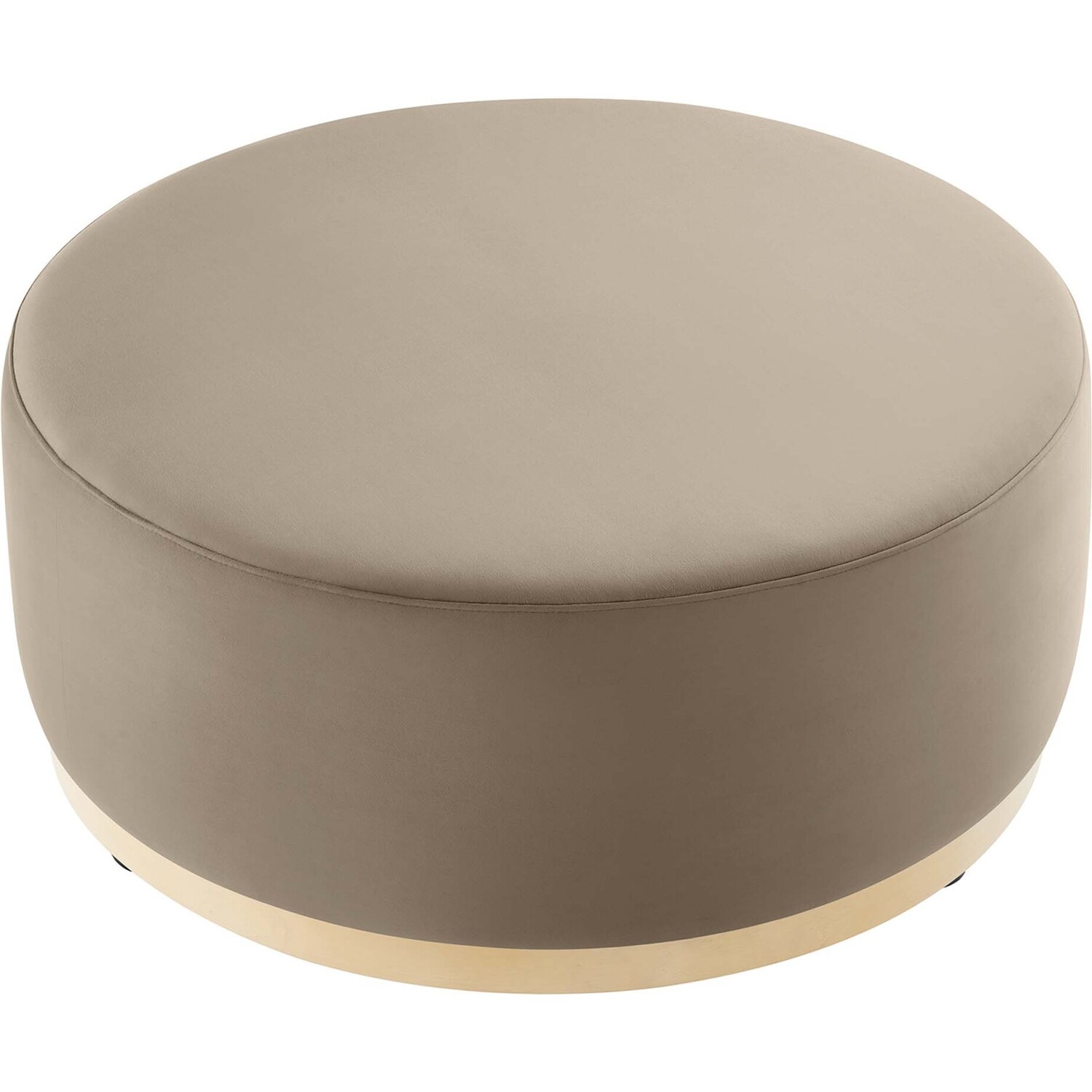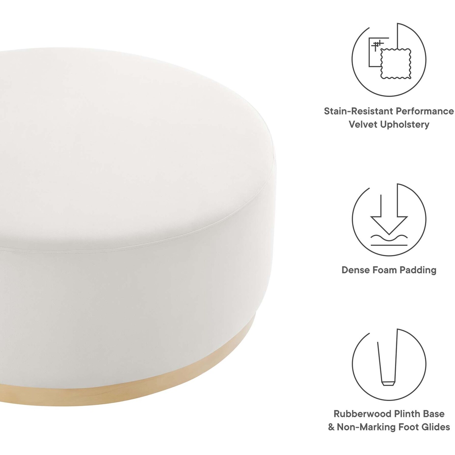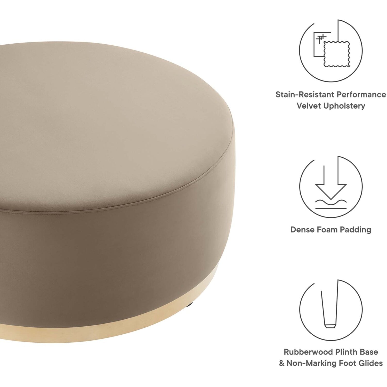 Delight in the elegance of the Tilden 38" Round Upholstered Ottoman, an ideal accent ottoman for modern homes, offices, or cozy apartments. Upholstered in stain-resistant performance velvet with French piping trim, this large ottoman footstool offers both luxury and durability. Its tailored silhouette complements contemporary décor, while the dense foam padding provides versatile use as a comfortable ottoman seat, large footrest, or living room ottoman coffee table. Resting on a rubberwood plinth base with non-marking glides, this ottoman table protects your floors from damage. Arriving fully assembled, the Tilden performance velvet ottoman combines chic style and functionality. Weight Capacity: 506 lbs.Performance Velvet Upholstery