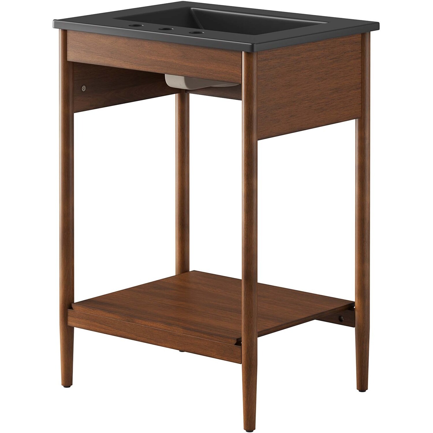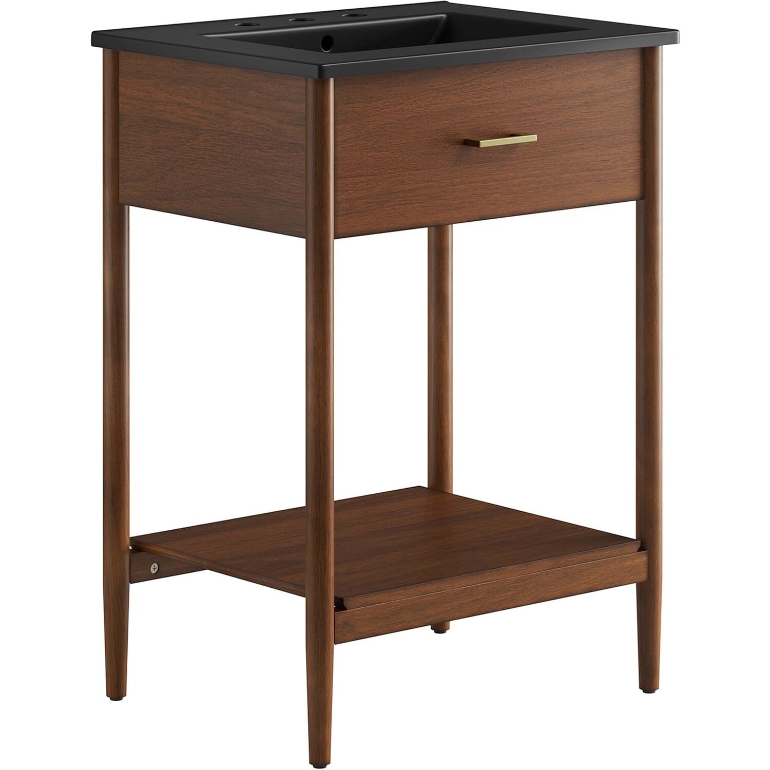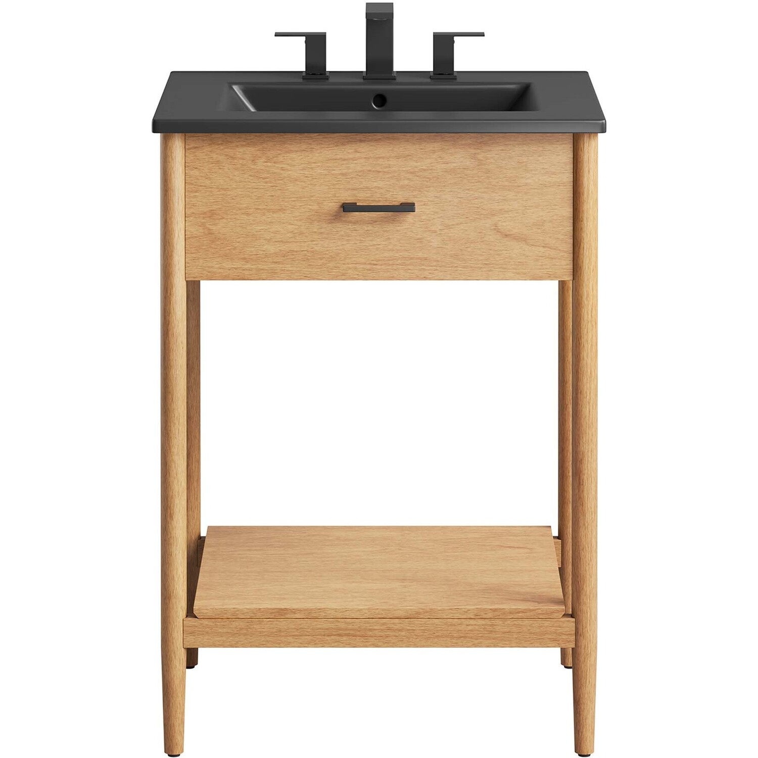 Infuse your bathroom decor with the subtle charm and simplicity of the Zaire 24” Bathroom Vanity. This exquisite washstand combines sleek, contemporary lines with the natural beauty of wood in an organic minimalist design. Crafted from MDF and solid rubberwood and topped with a wood grain veneer, this vanity’s design is emphasized by a metal handle pull on its fixed drawer, giving it a touch of urban chic. Below this, you'll find an open shelf, ideal for holding towels or showcasing your favorite decorative pieces. Featuring a sleek ceramic basin with 8" centerset holes and an integrated countertop, this vanity easily becomes a functional centerpiece in your bathroom. This vanity’s tapered wood legs are a modest and understated design choice that completes the overall simple mid-century aesthetic. Includes adjustable, non-marking feet for added stability and floor protection. Assembly required. Fixtures not included. Weight Capacity: 275 lbs.MDF and Rubberwood