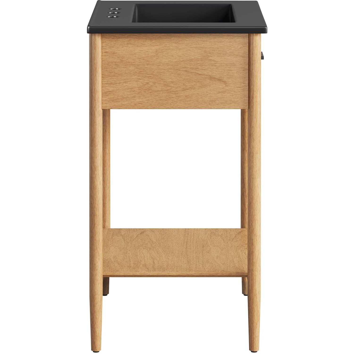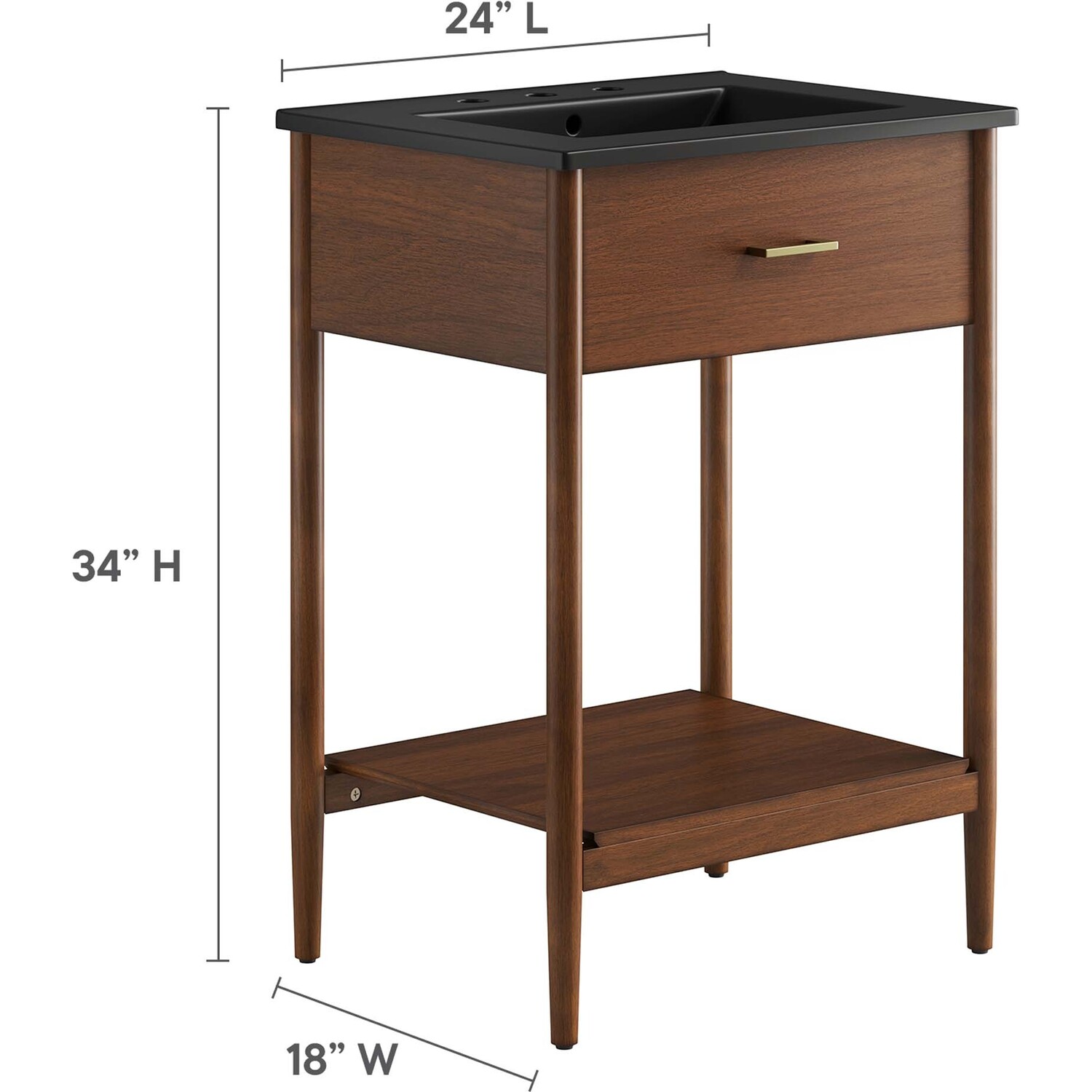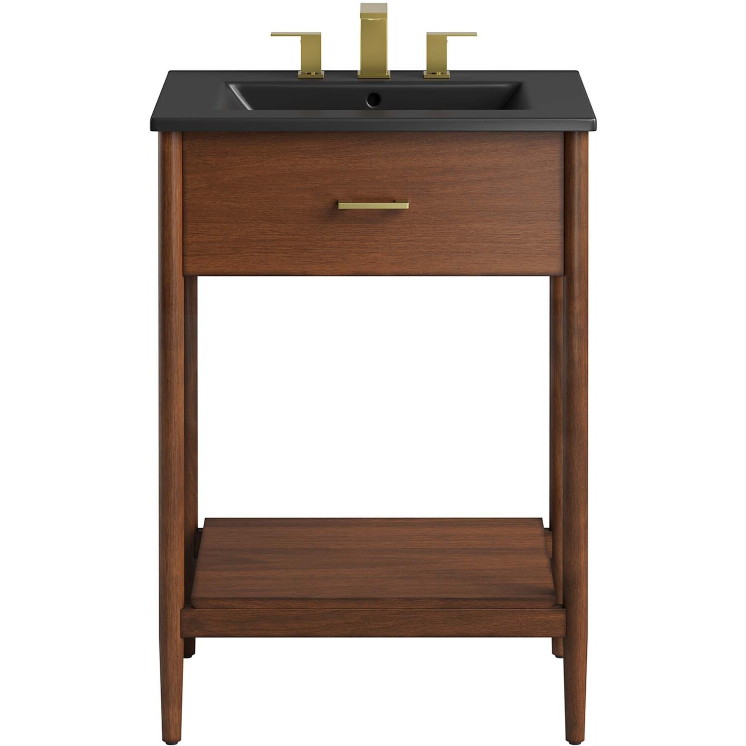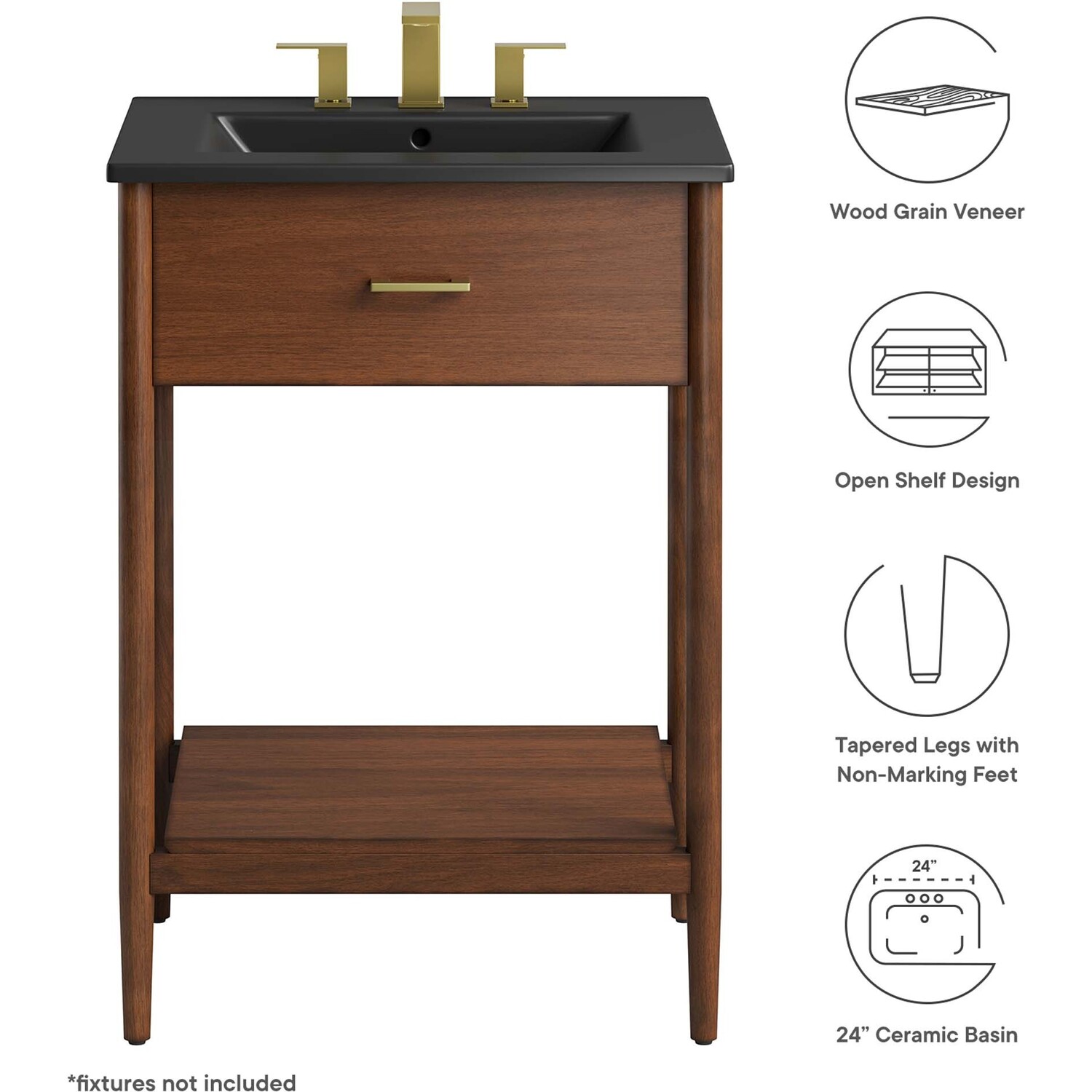 Infuse your bathroom decor with the subtle charm and simplicity of the Zaire 24” Bathroom Vanity. This exquisite washstand combines sleek, contemporary lines with the natural beauty of wood in an organic minimalist design. Crafted from MDF and solid rubberwood and topped with a wood grain veneer, this vanity’s design is emphasized by a metal handle pull on its fixed drawer, giving it a touch of urban chic. Below this, you'll find an open shelf, ideal for holding towels or showcasing your favorite decorative pieces. Featuring a sleek ceramic basin with 8" centerset holes and an integrated countertop, this vanity easily becomes a functional centerpiece in your bathroom. This vanity’s tapered wood legs are a modest and understated design choice that completes the overall simple mid-century aesthetic. Includes adjustable, non-marking feet for added stability and floor protection. Assembly required. Fixtures not included. Weight Capacity: 275 lbs.MDF and Rubberwood