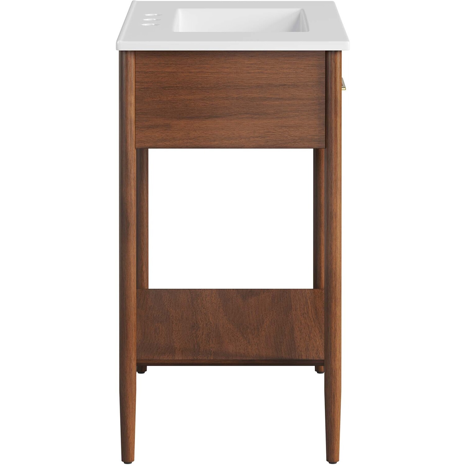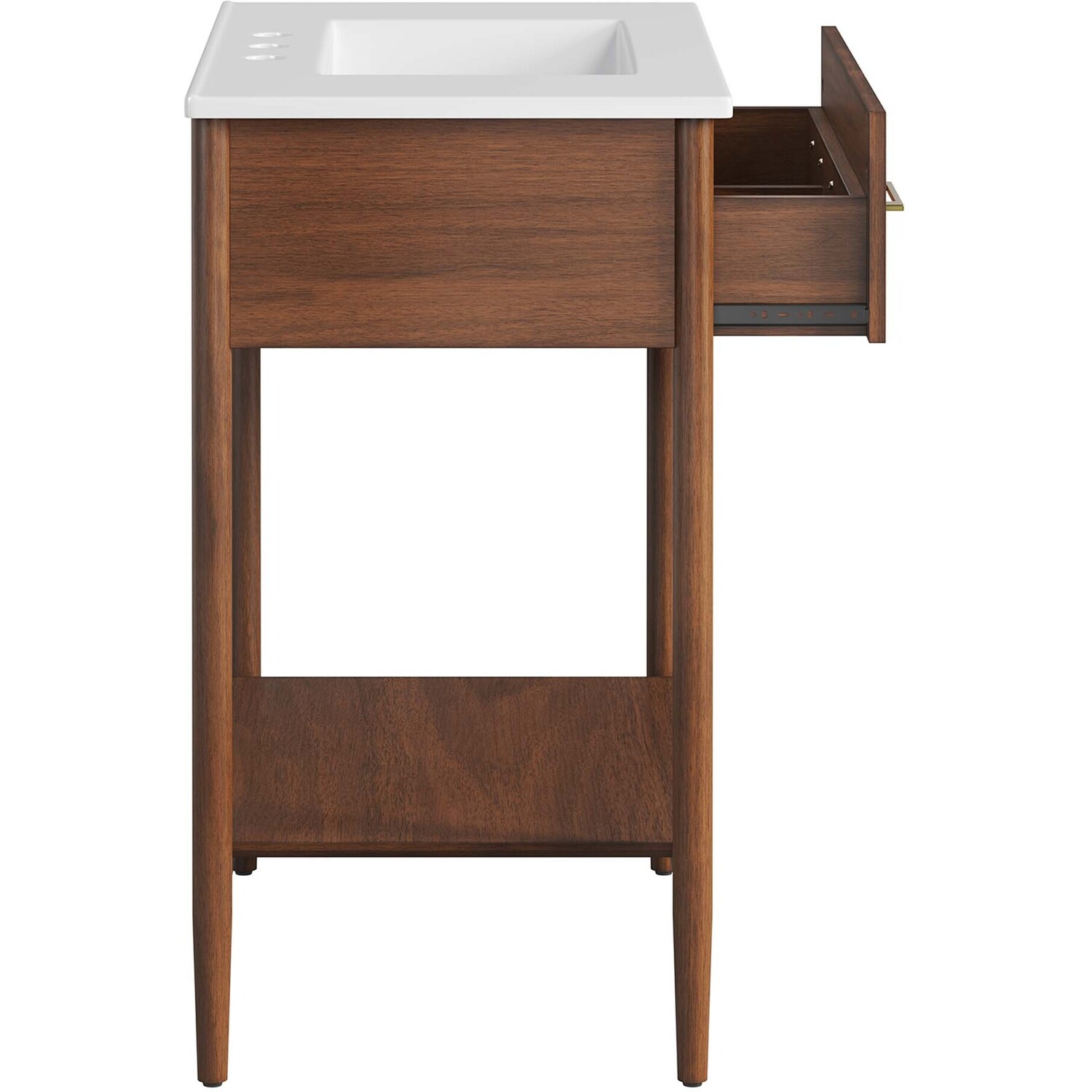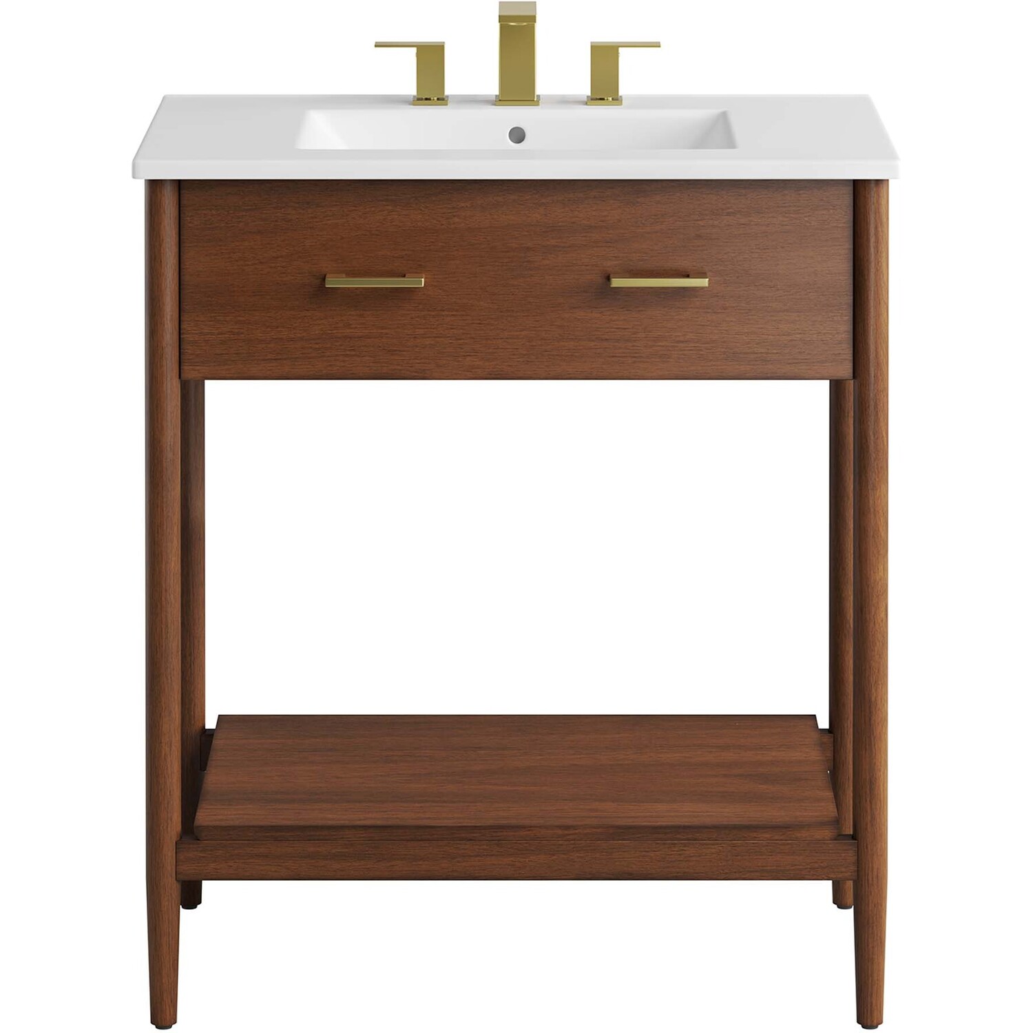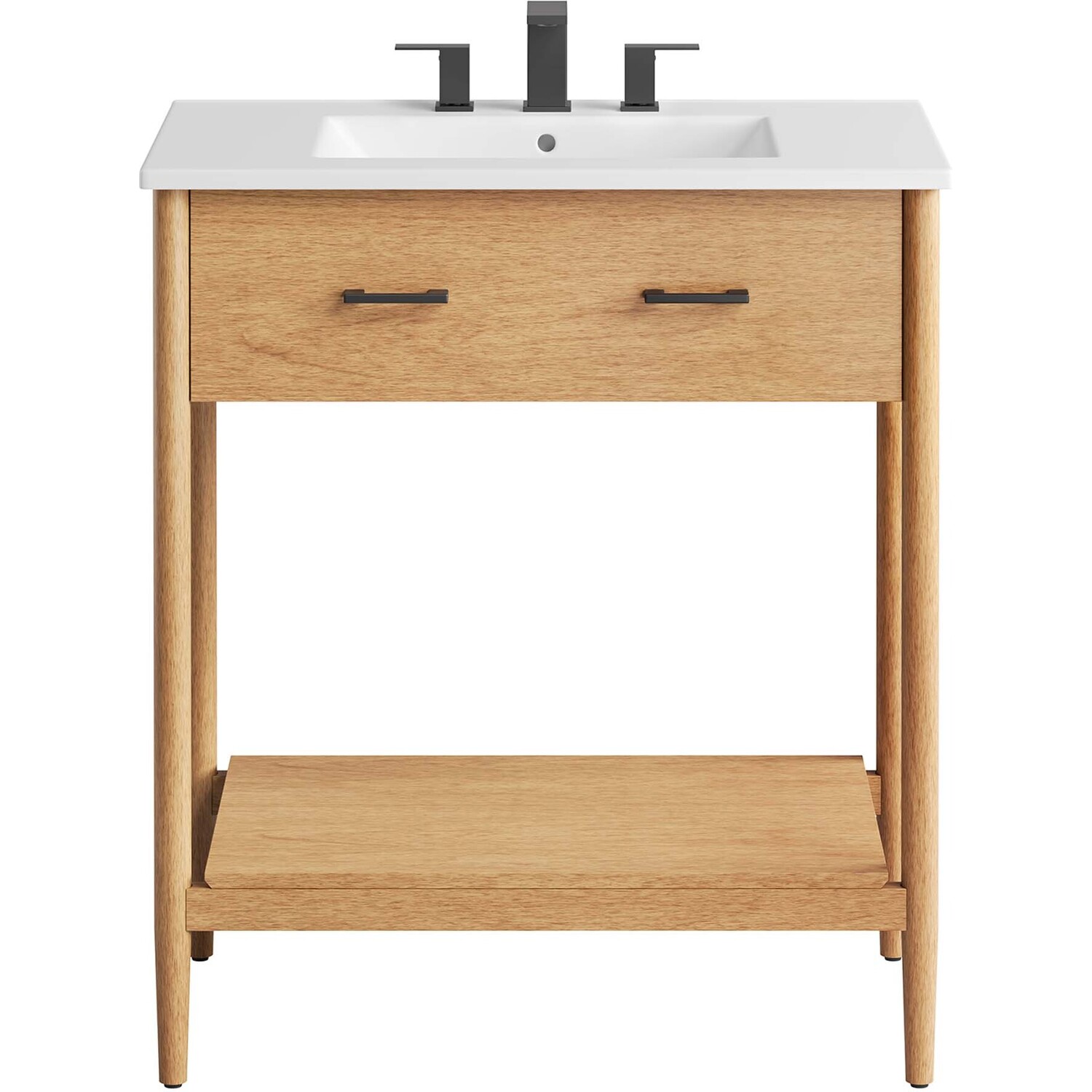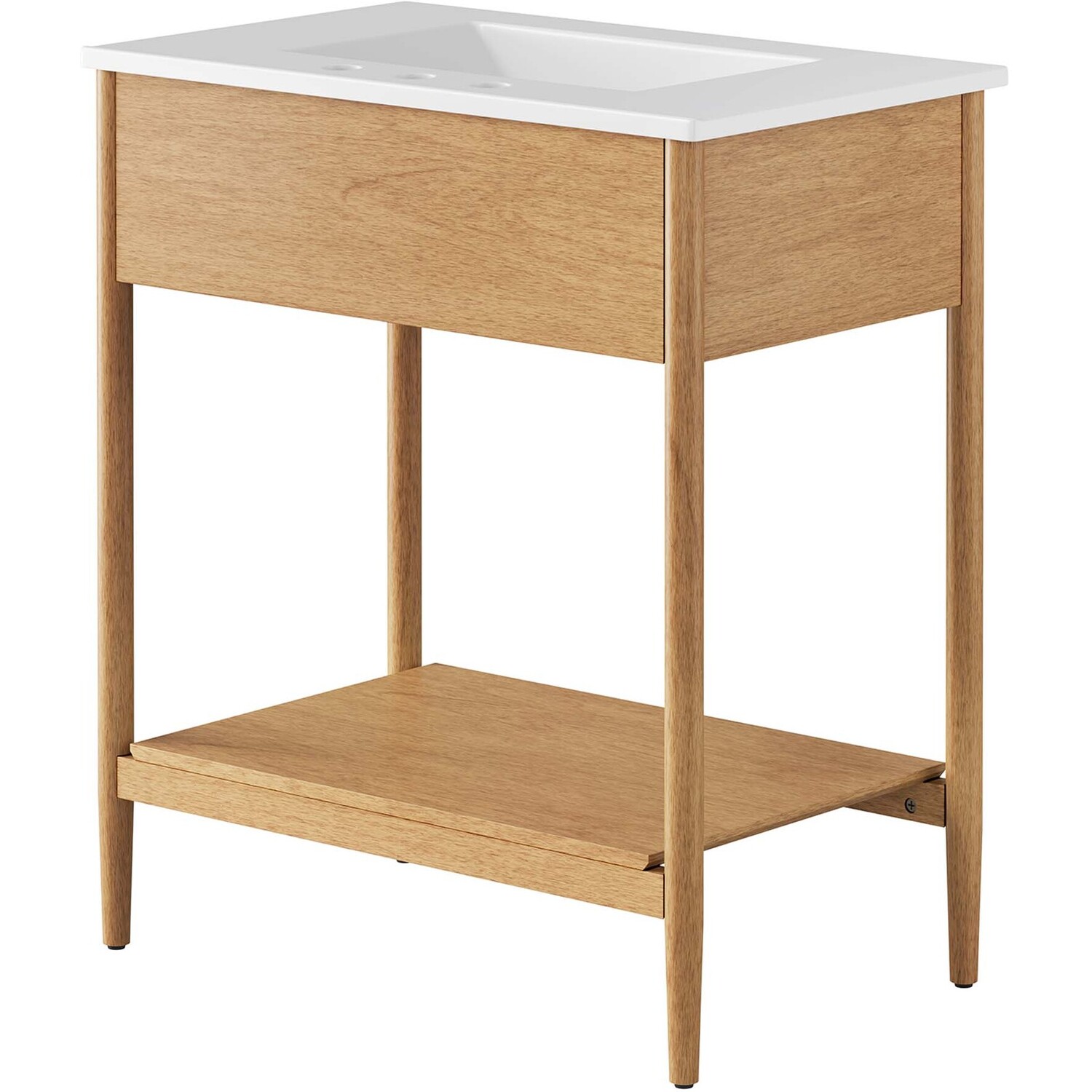 Infuse your bathroom decor with the subtle charm and simplicity of the Zaire 30” Bathroom Vanity. This exquisite washstand combines sleek, contemporary lines with the natural beauty of wood in an organic minimalist design. Crafted from MDF and solid rubberwood and topped with a wood grain veneer, this vanity’s design is emphasized by two metal handle pulls on its drawer, giving it a touch of urban chic. Below this, you'll find an open shelf, ideal for holding towels or showcasing your favorite decorative pieces. Featuring a sleek ceramic basin with 8" centerset holes and an integrated countertop, this vanity easily becomes a functional centerpiece in your bathroom. This vanity’s tapered wood legs are a modest and understated design choice that completes the overall simple mid-century aesthetic. Includes adjustable, non-marking feet for added stability and floor protection. Assembly required. Fixtures not included. Weight Capacity: 375 lbs.MDF and Rubberwood