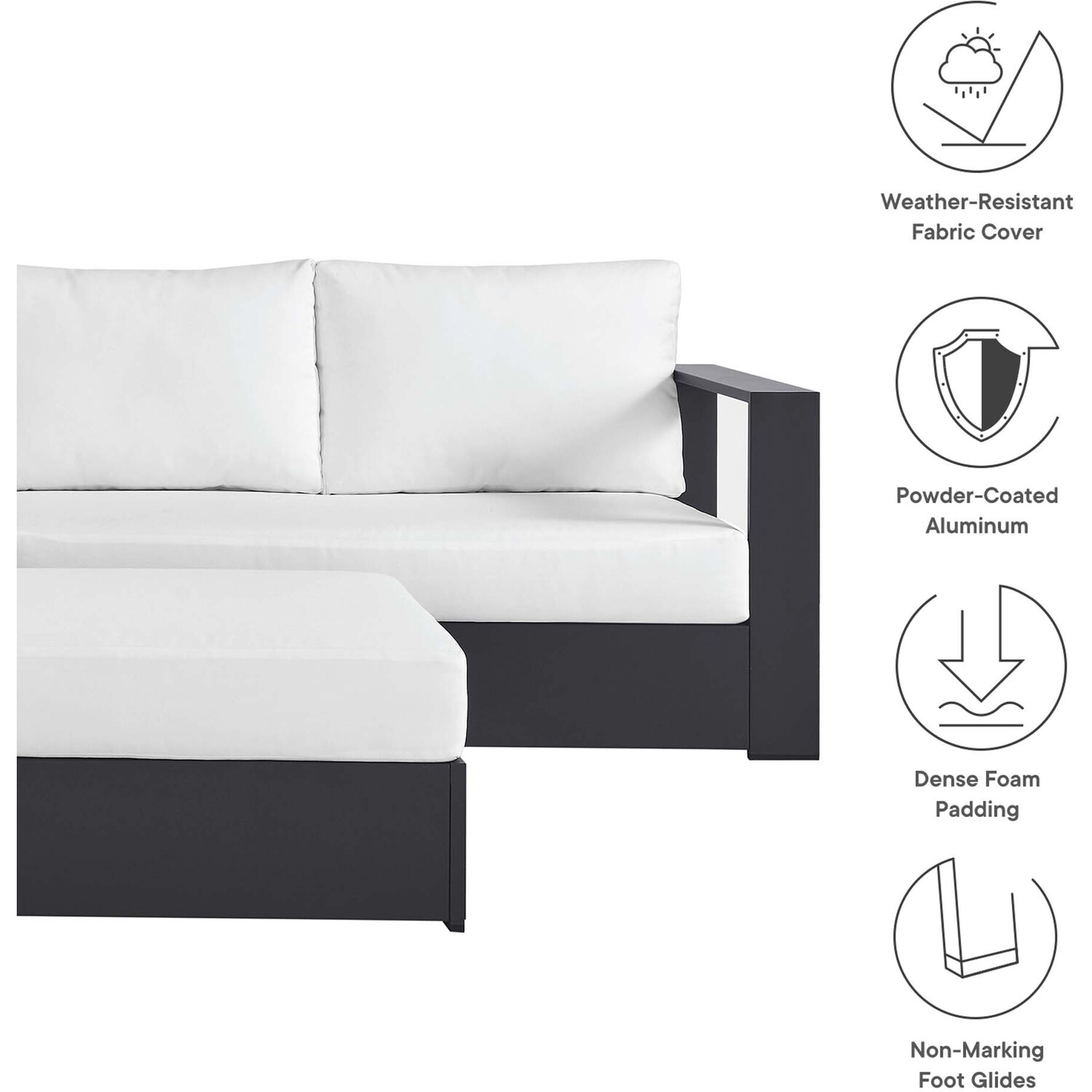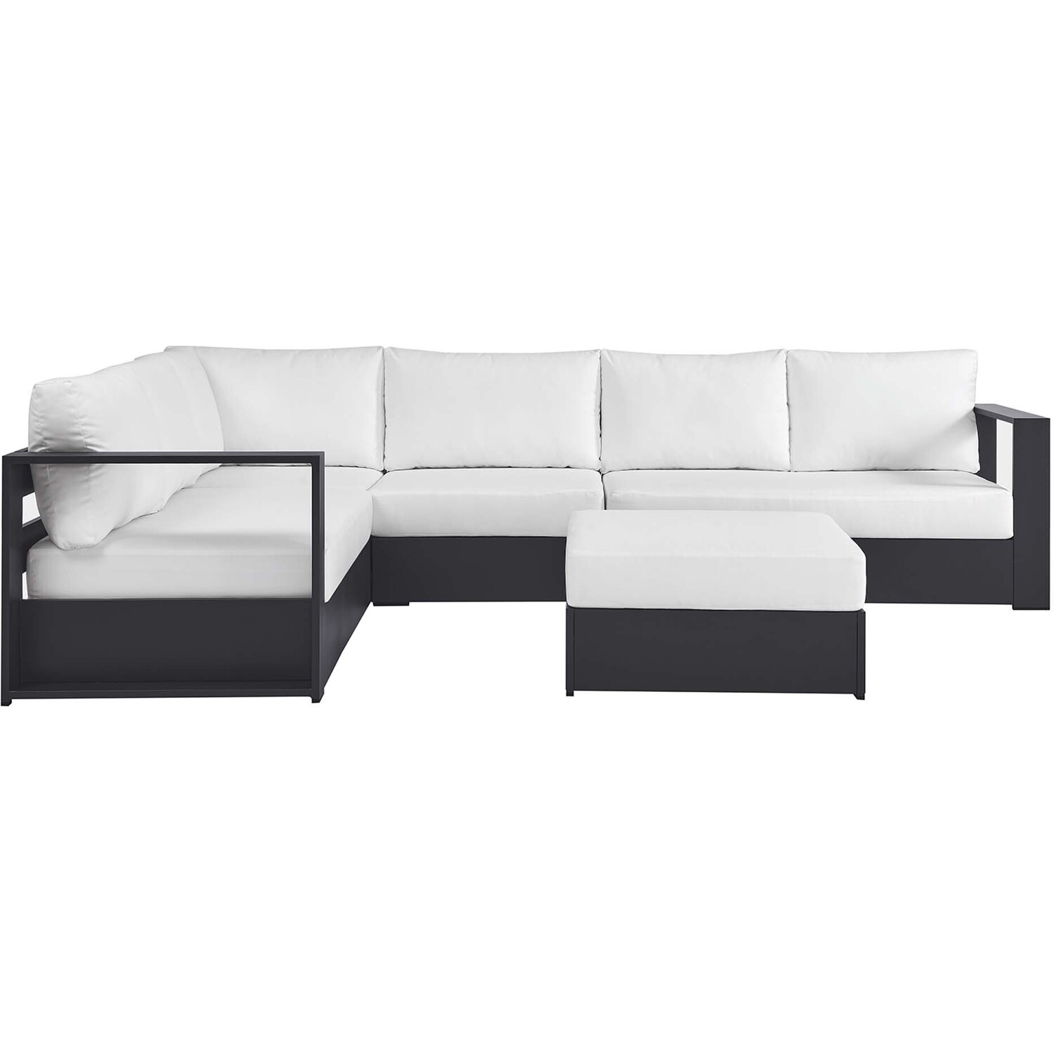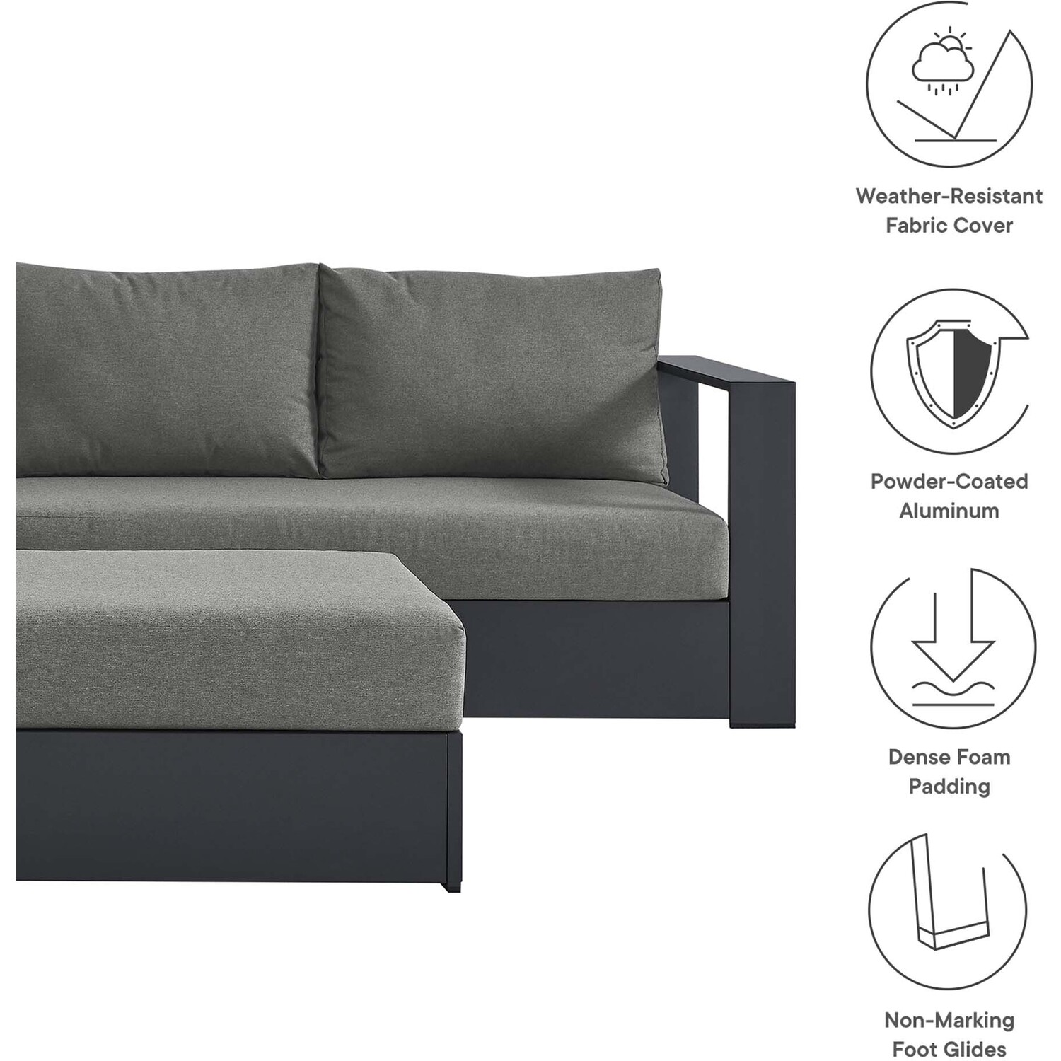 Enliven your alfresco spaces with the Tahoe Aluminum Outdoor Patio 5-Piece Sectional Sofa. This modern sectional sofa is constructed with well-crafted, durable powder-coated aluminum, dispensing contemporary elegance in your outdoor lounge spaces. Its dense foam padding ensures sustained comfort, making it ideal for poolside lounging or as outdoor deck furniture, complete with UV and water-resistant fabric-covered seats and backrests. The cushion covers are removable for easy machine washing. Part of a modular outdoor furniture collection, this sectional sofa offers adaptability and style while entertaining or relaxing. The entire Tahoe aluminum patio furniture set features non-marking foot glides to protect your deck or patio floor and comes with easy-to-follow assembly instructions. Set Includes: 1 Ottoman, (Weight Capacity: 331 lbs.), 1 Armless Patio Chair (Weight Capacity: 331 lbs,), 1 Left-Facing and 1 Right-Facing Loveseat (Weight Capacity: 331 lbs,), 1 Corner Chair (Weight Capacity: 331 lbs.)Outdoor Patio Sectional Sofa