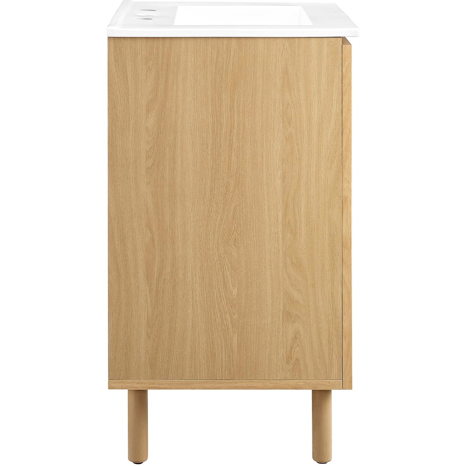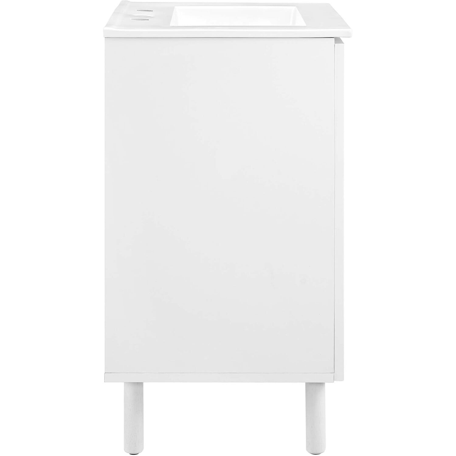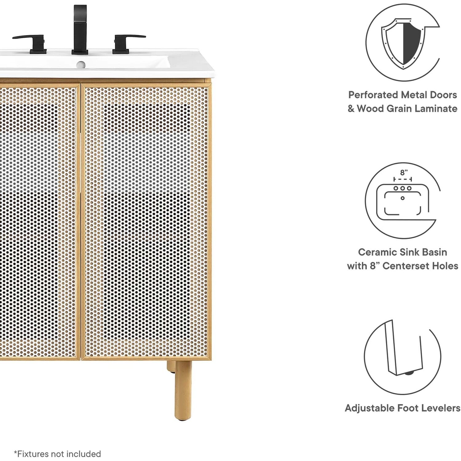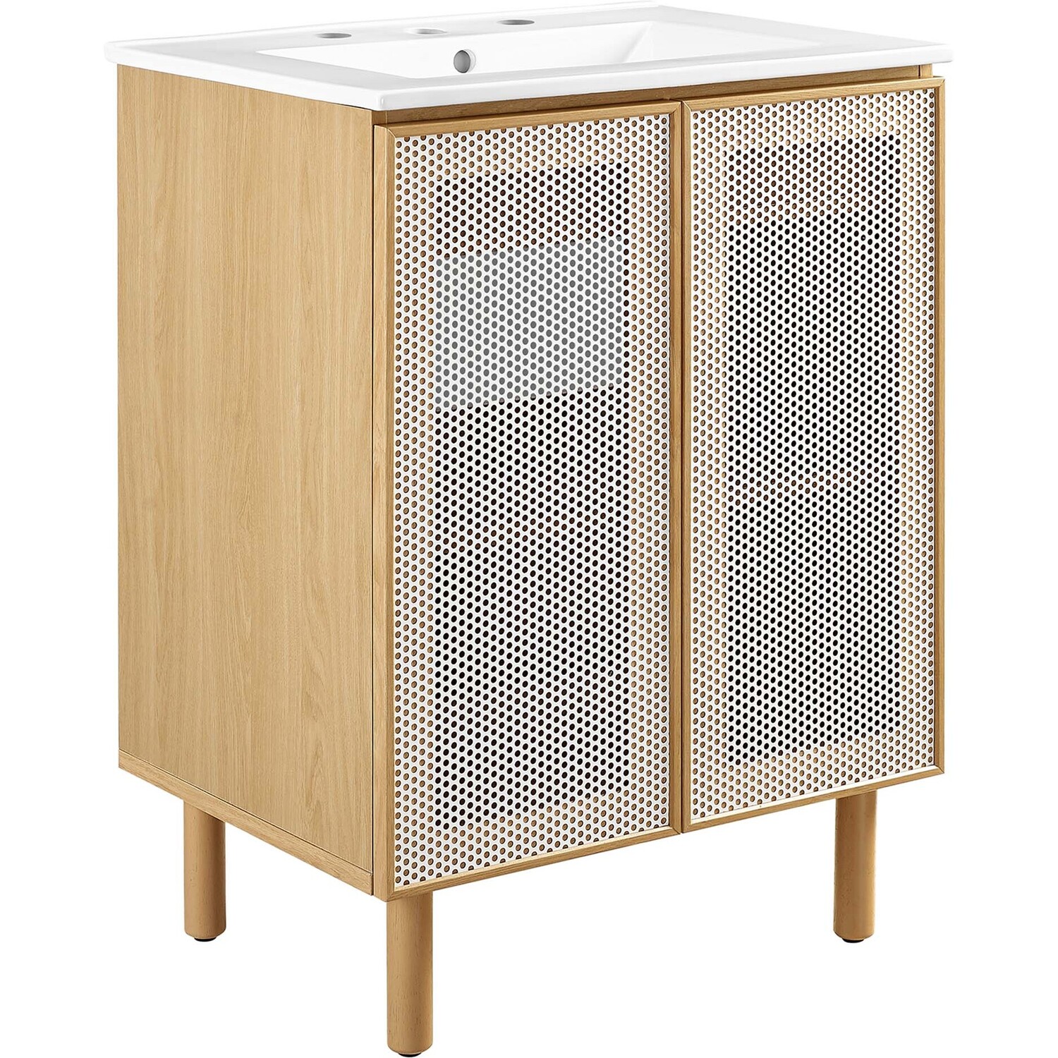 Elevate your bathroom space with the Calla 24" Bathroom Vanity, where contemporary design meets everyday practicality. This single bathroom vanity features a durable particleboard construction with a smooth laminate finish that adds a modern touch to your bathroom decor. The unique perforated metal door fronts of this bathroom sink cabinet offer a stylish update while concealing ample storage space for all your bathroom essentials. This small space vanity is customizable with its adjustable shelf, designed to accommodate your plumbing needs with ease. The push-to-open doors and sleek dowel legs highlight its minimalist design, while the bathroom cabinet's non-marking, adjustable foot levelers protect your flooring. A high-quality ceramic sink basin with 8" centerset holes completes the look, ready for faucet installation (not included). The Calla vanity sink requires simple assembly, with clear instructions to guide you through the setup. Fixtures not included.Perforated Metal Doors