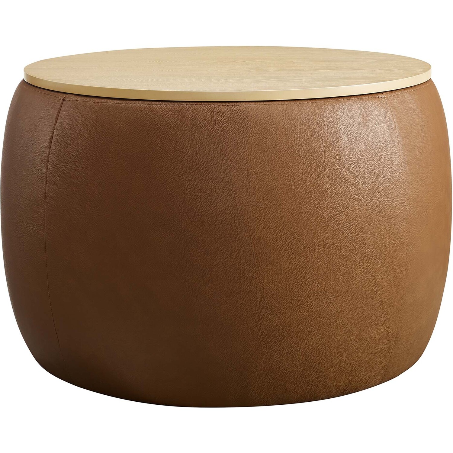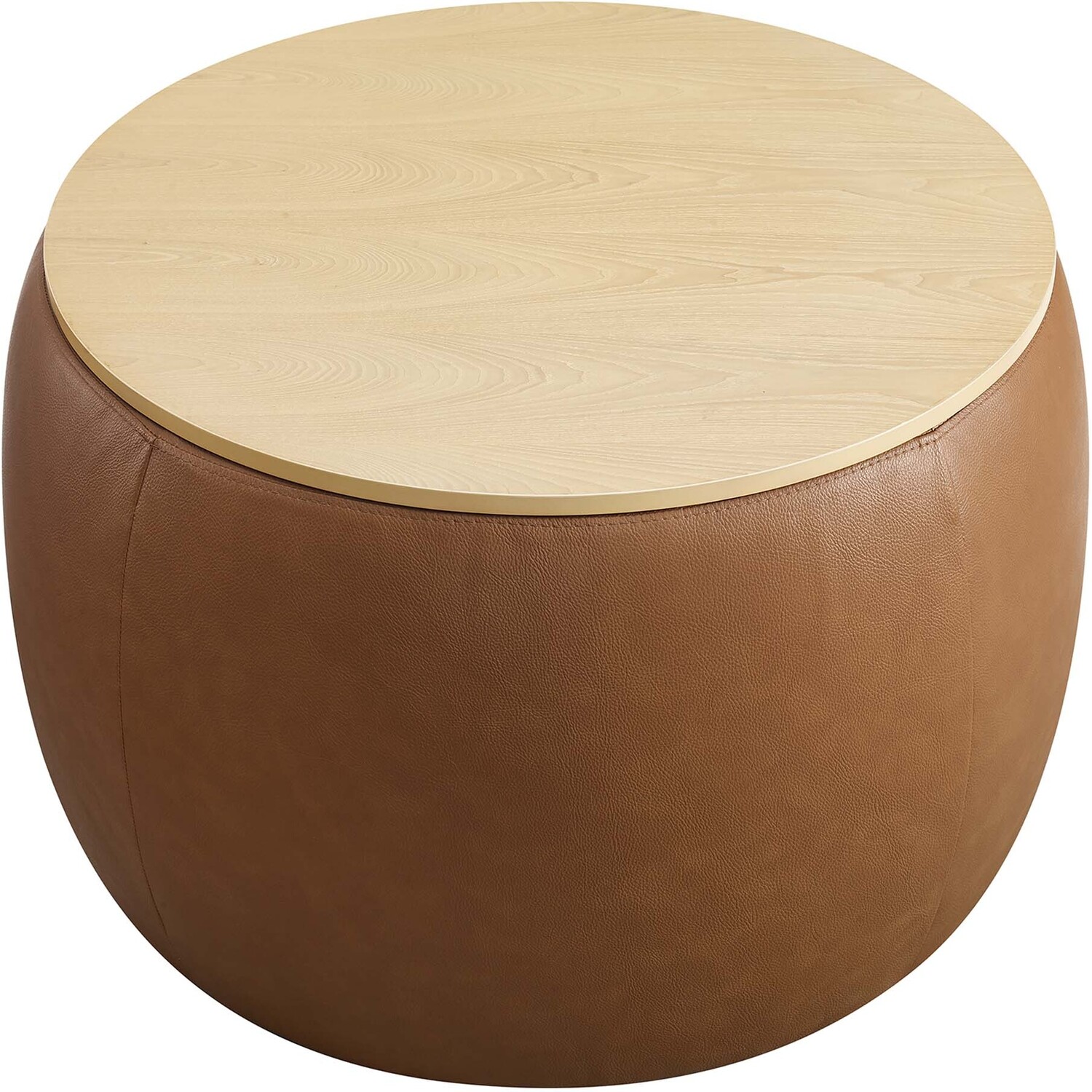 Refine your decor with the Perla Vegan Leather Storage Ottoman. Its sturdy plywood frame is wrapped in cushioning foam and upholstered in durable faux leather, while a sleek wood grain veneer lid adds clean functionality and aesthetic appeal. The Perla storage ottoman stands out with its polished silhouette, serving both as a chic round coffee table and a storage table. Its hidden concealed compartment is a discreet haven for your essentials, easily accessible beneath its tray-like lid. Whether you're stashing away linens or keeping your reading materials at hand, the Perla ottoman with storage makes organization look good. Designed with modern living in mind, this round storage ottoman stool with lid features non-marking foot glides to protect your flooring, allowing you to rearrange without a second thought. Ready to use right out of the box, this storage stool awaits its role in your home's narrative, adding a touch of sophistication and practicality to your everyday. Weight Capacity: 264 lbs.Dense Foam Padding
