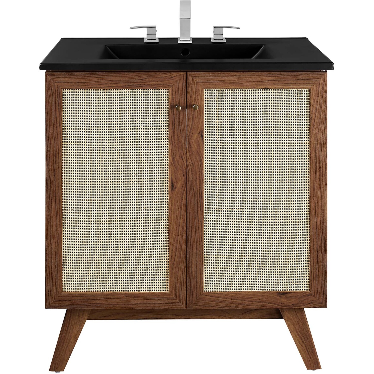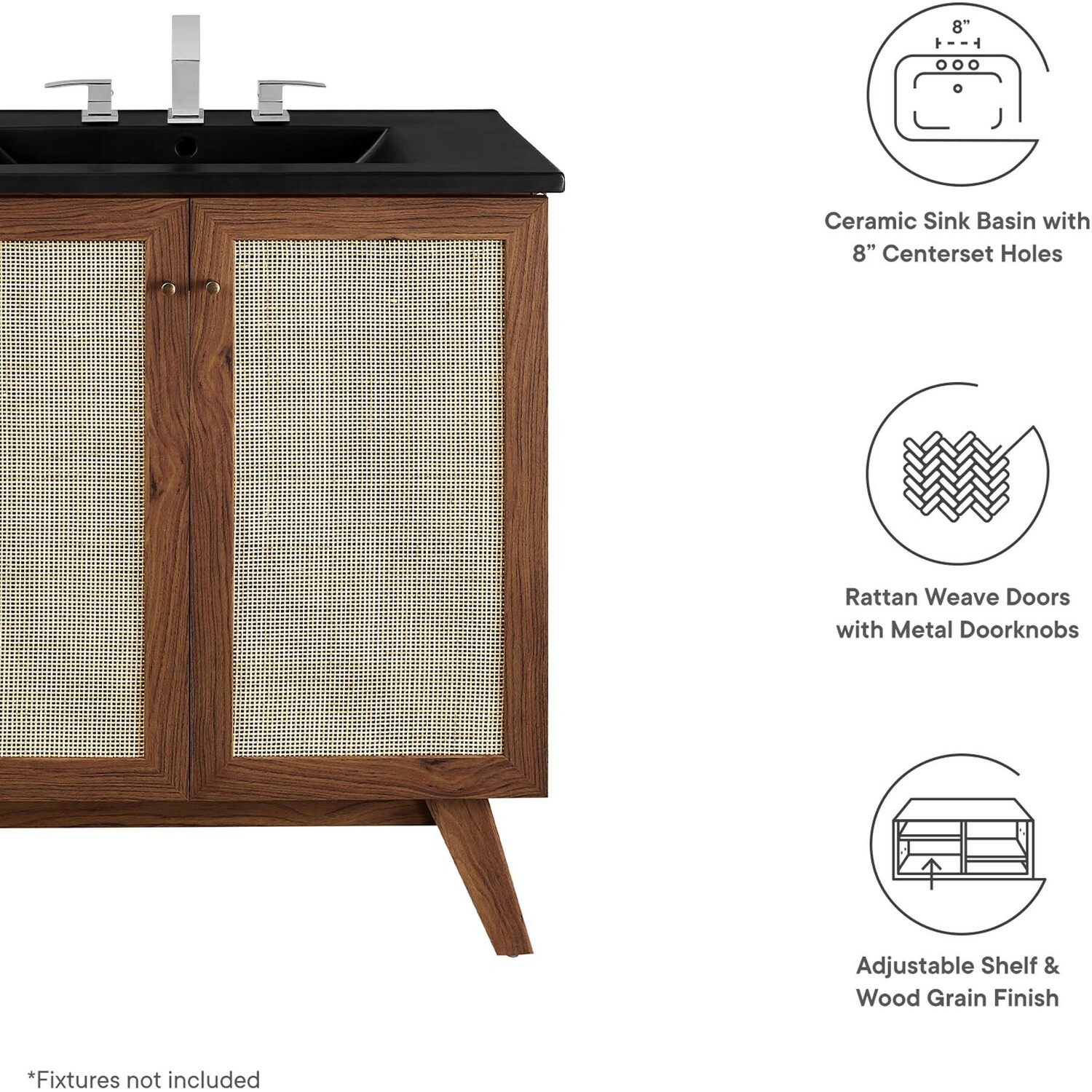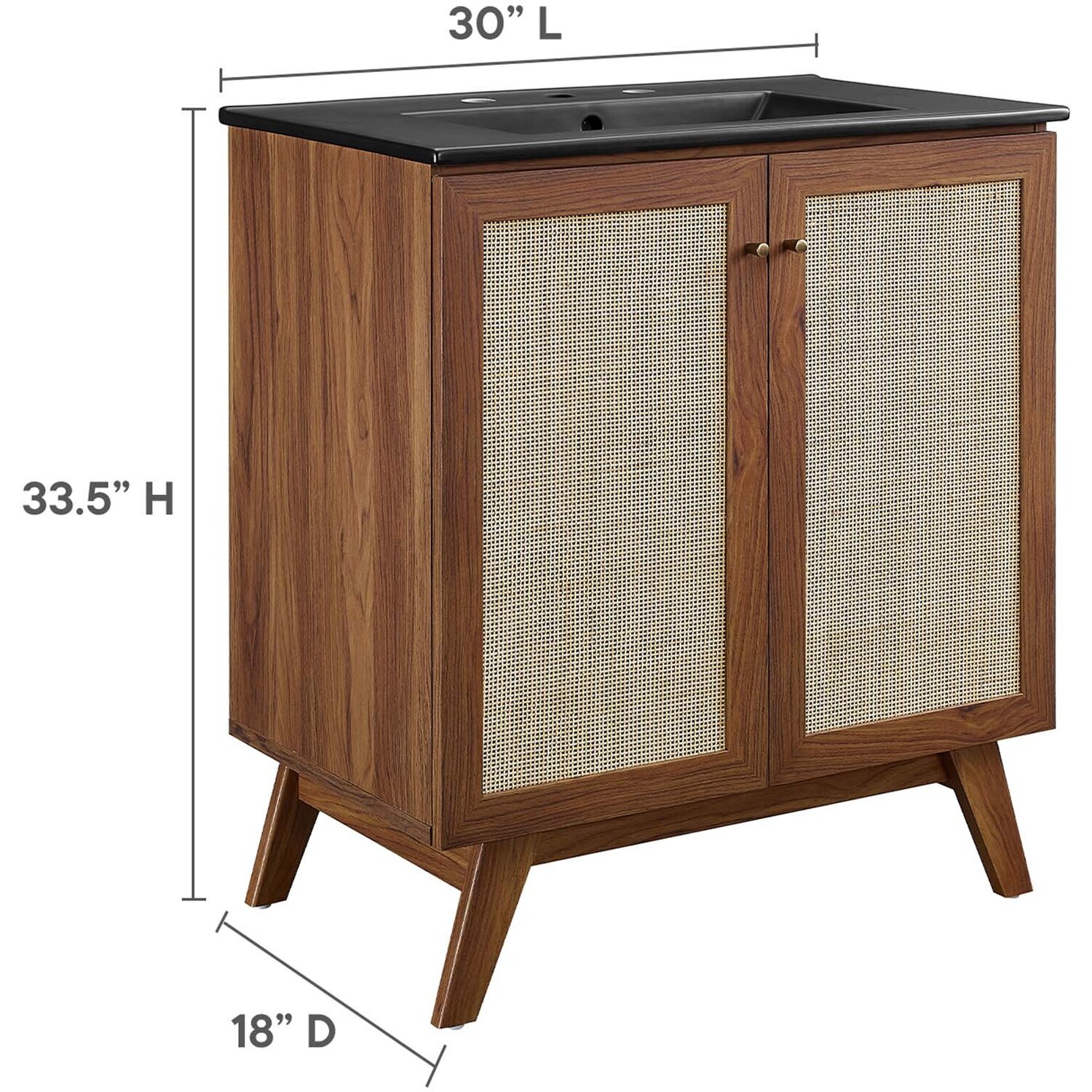 Introduce refreshing style to your restroom with the Soma 30” Bathroom Vanity. Showcasing a beautiful rattan weave on the cupboard doors, this vanity brings organic aesthetics and modern functionality to any bathroom or powder room. Crafted from durable MDF and particleboard with a natural wood grain finish, this vanity boasts a ceramic sink basin with 8-inch centerset holes and an integrated countertop. This vanity features an adjustable shelf, providing easy customization for arranging towels, toiletries, and bathroom necessities. Complete with metal doorknobs with a brushed gold finish and soft-close hinges, this bathroom vanity cabinet is designed for quiet and effortless functionality. Resting on splayed legs, the Soma Bathroom Vanity includes non-marking foot caps to protect flooring. Assembly required. Fixtures not included.MDF and Particleboard