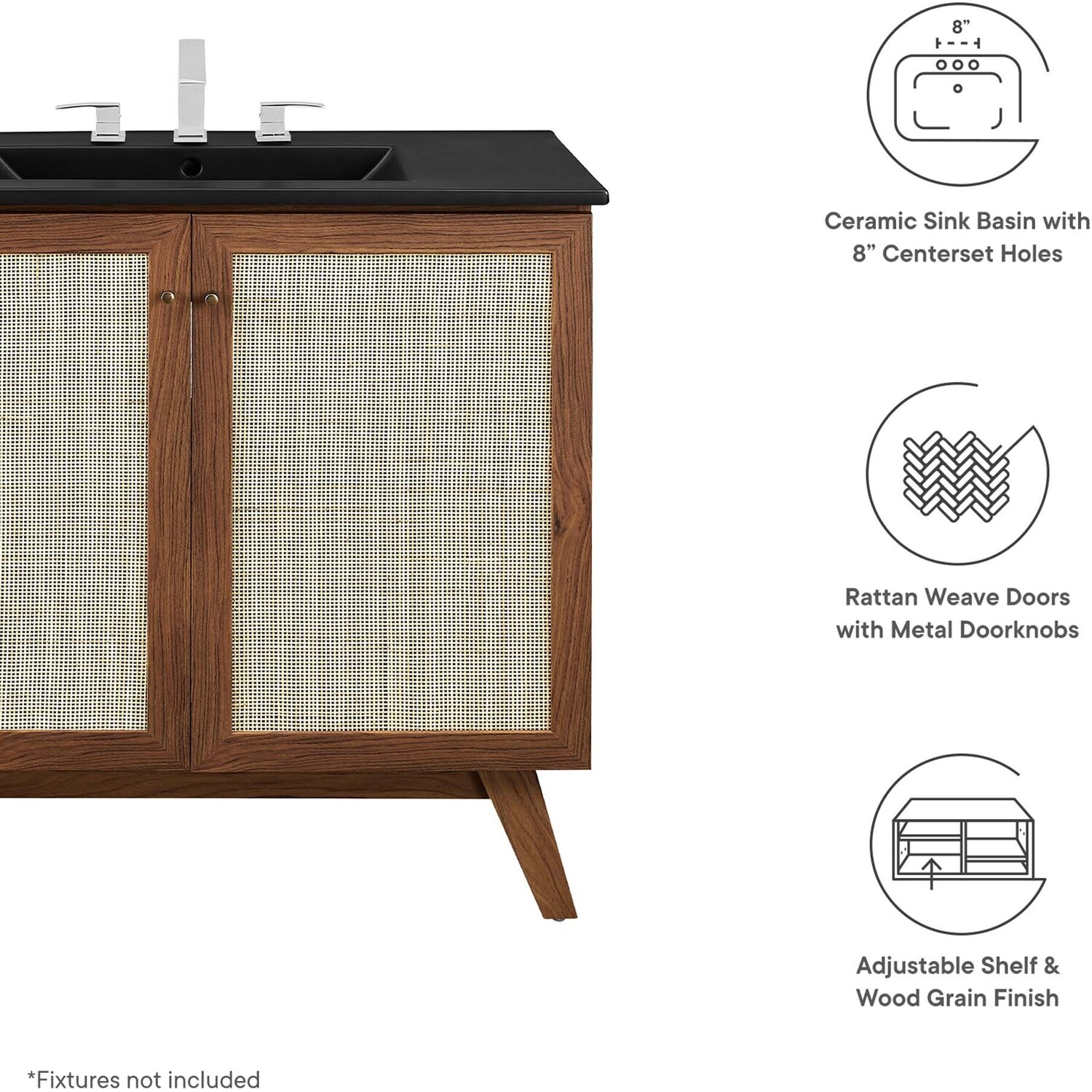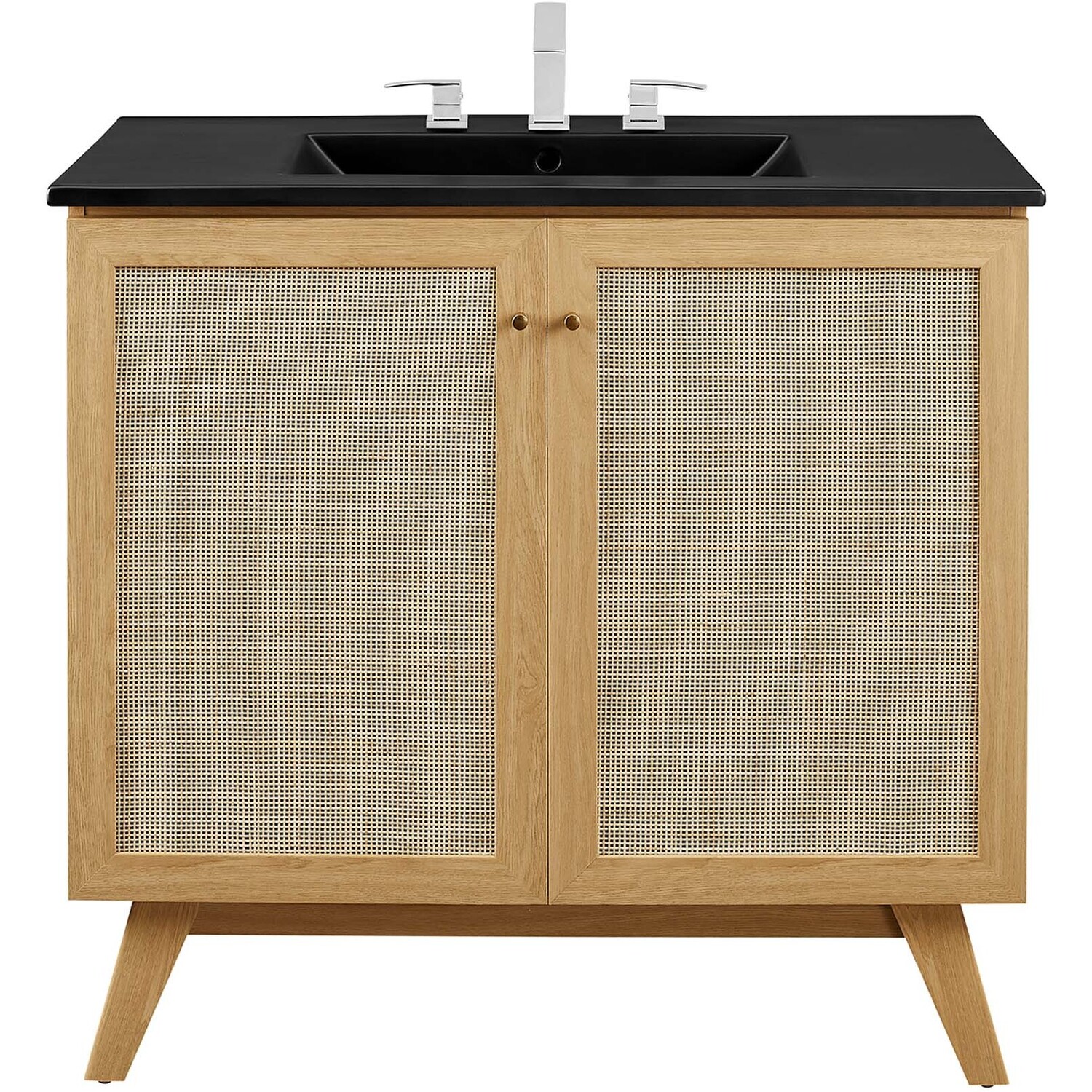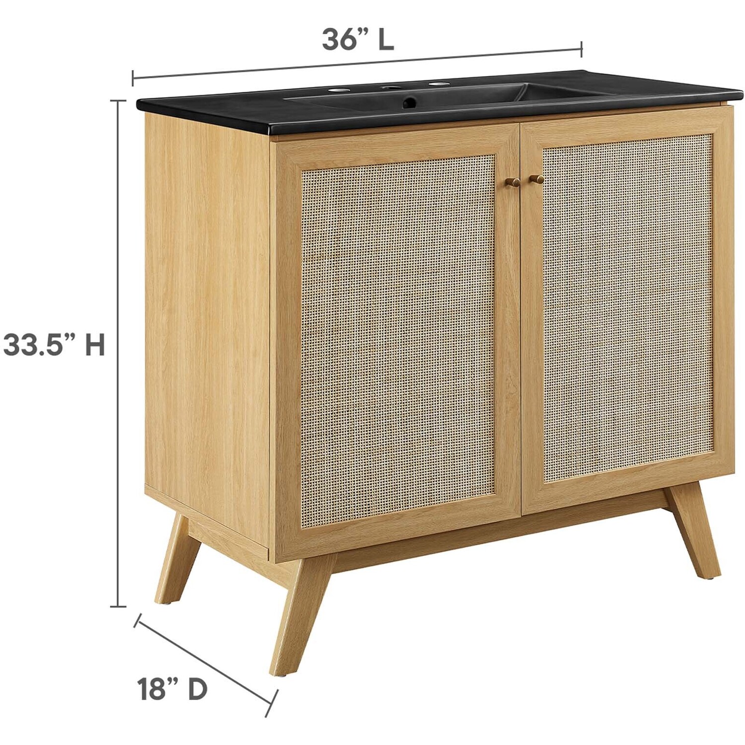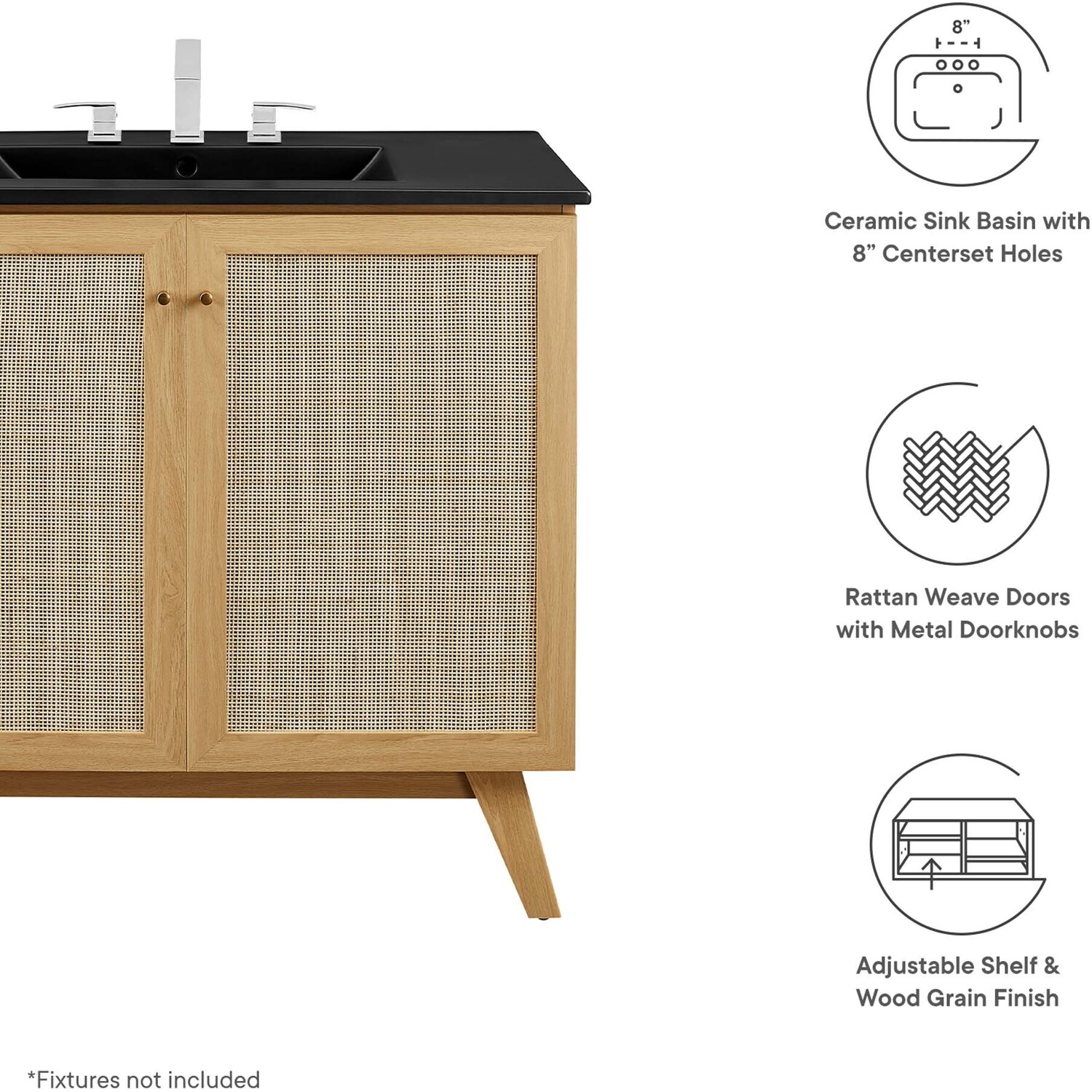Introduce refreshing style to your restroom with the Soma 36” Bathroom Vanity. Showcasing a beautiful rattan weave on the cupboard doors, this vanity brings organic aesthetics and modern functionality to any bathroom or powder room. Crafted from durable MDF and particleboard with a natural wood grain finish, this vanity boasts a ceramic sink basin with 8-inch centerset holes and an integrated countertop. This vanity features an adjustable shelf, providing easy customization for arranging towels, toiletries, and bathroom necessities. Complete with metal doorknobs with a brushed gold finish and soft-close hinges, this bathroom vanity cabinet is designed for quiet and effortless functionality. Resting on splayed legs, the Soma Bathroom Vanity includes non-marking foot caps to protect flooring. Assembly required. Fixtures not included.MDF and Particleboard