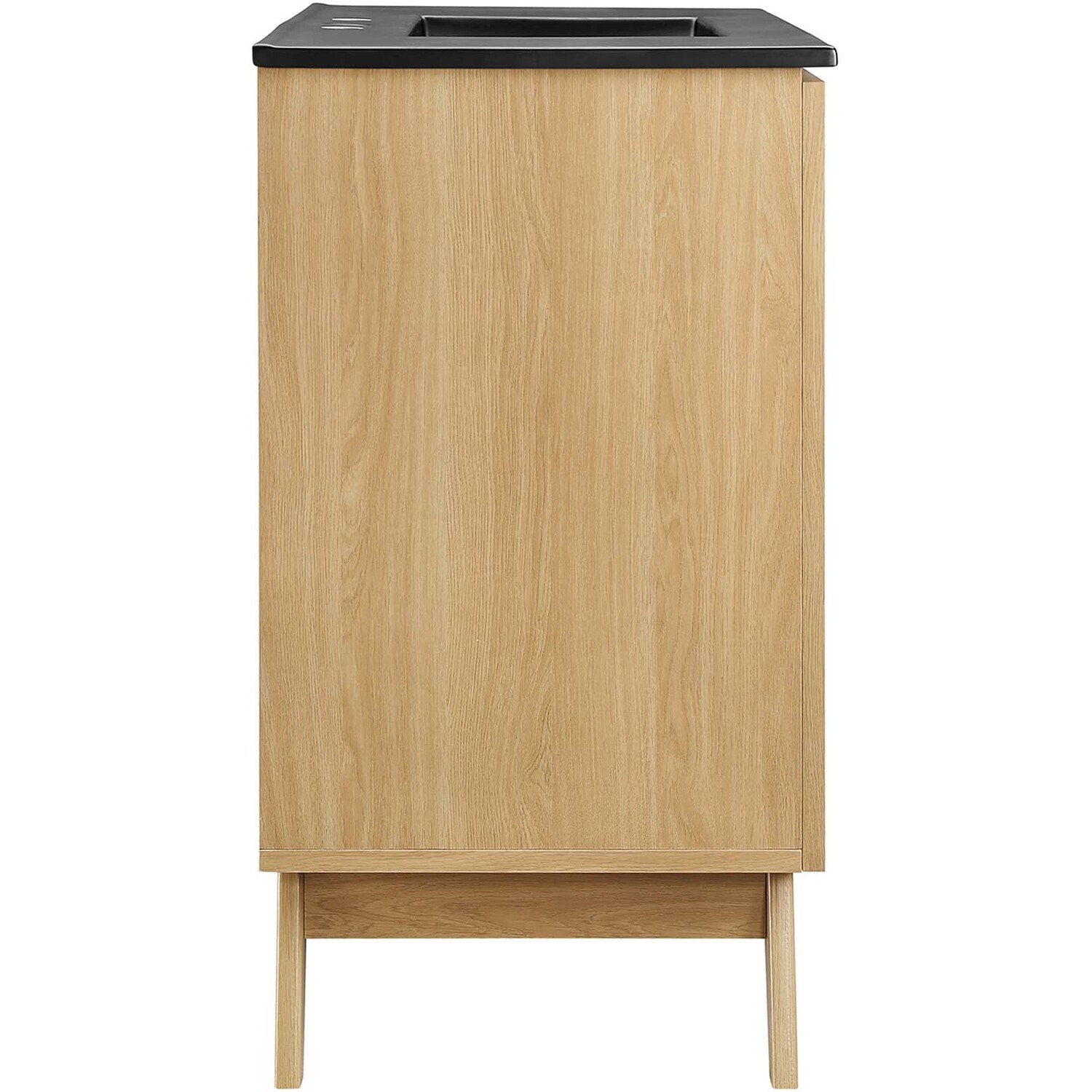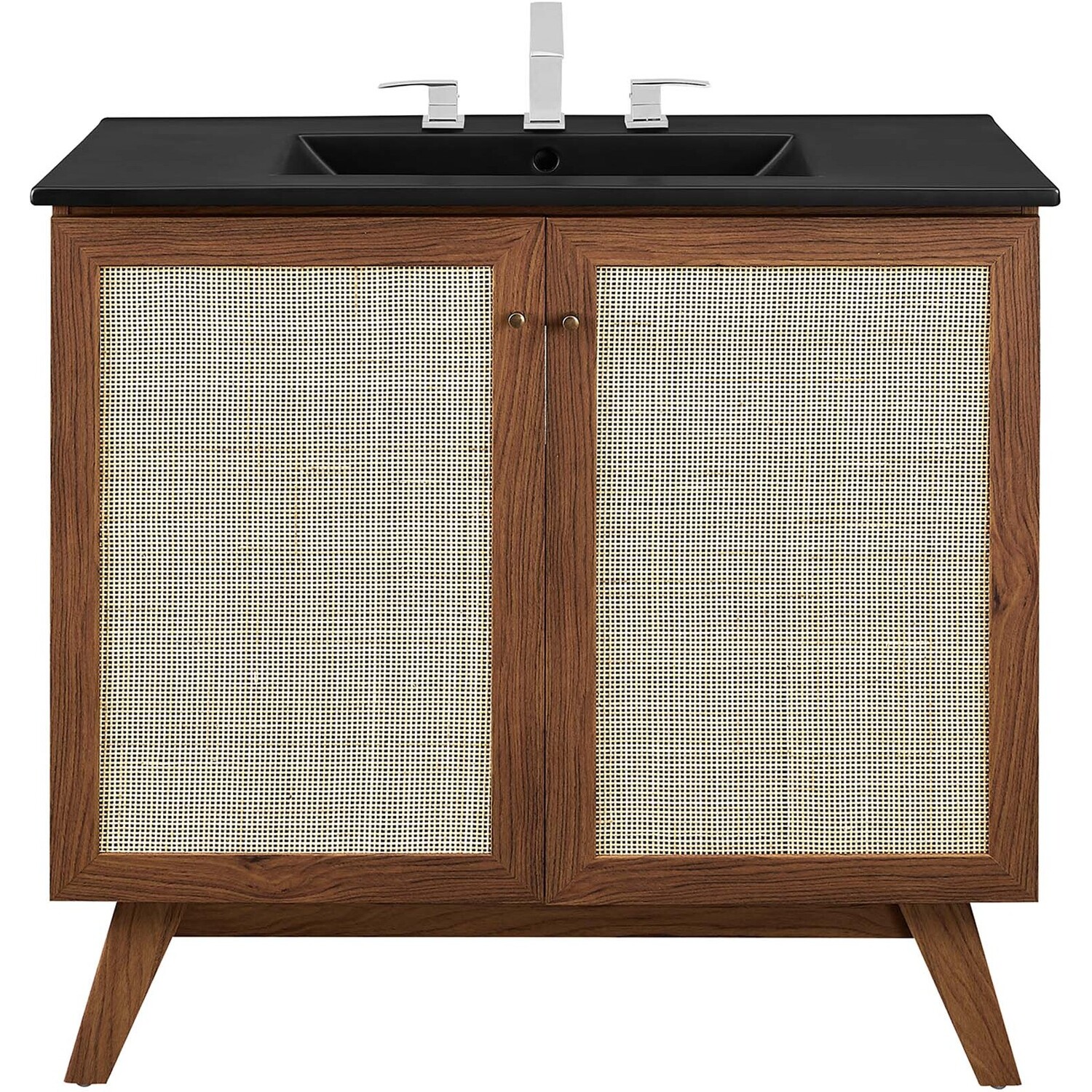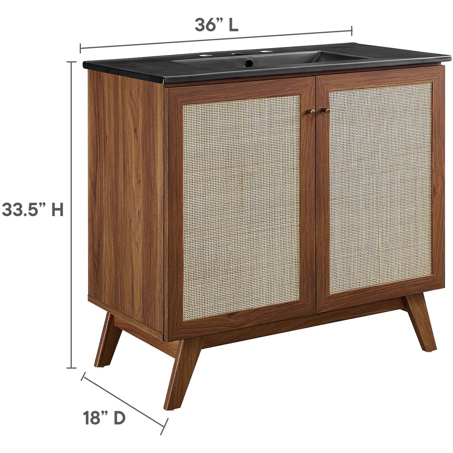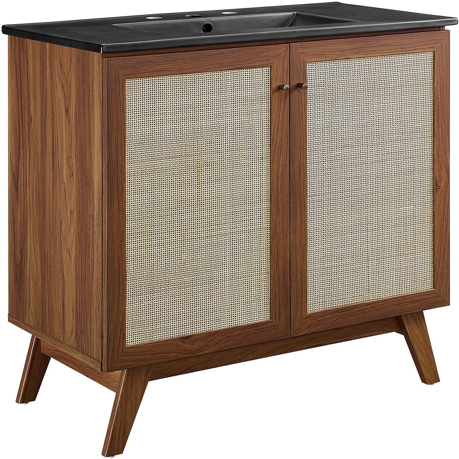 Introduce refreshing style to your restroom with the Soma 36” Bathroom Vanity. Showcasing a beautiful rattan weave on the cupboard doors, this vanity brings organic aesthetics and modern functionality to any bathroom or powder room. Crafted from durable MDF and particleboard with a natural wood grain finish, this vanity boasts a ceramic sink basin with 8-inch centerset holes and an integrated countertop. This vanity features an adjustable shelf, providing easy customization for arranging towels, toiletries, and bathroom necessities. Complete with metal doorknobs with a brushed gold finish and soft-close hinges, this bathroom vanity cabinet is designed for quiet and effortless functionality. Resting on splayed legs, the Soma Bathroom Vanity includes non-marking foot caps to protect flooring. Assembly required. Fixtures not included.MDF and Particleboard