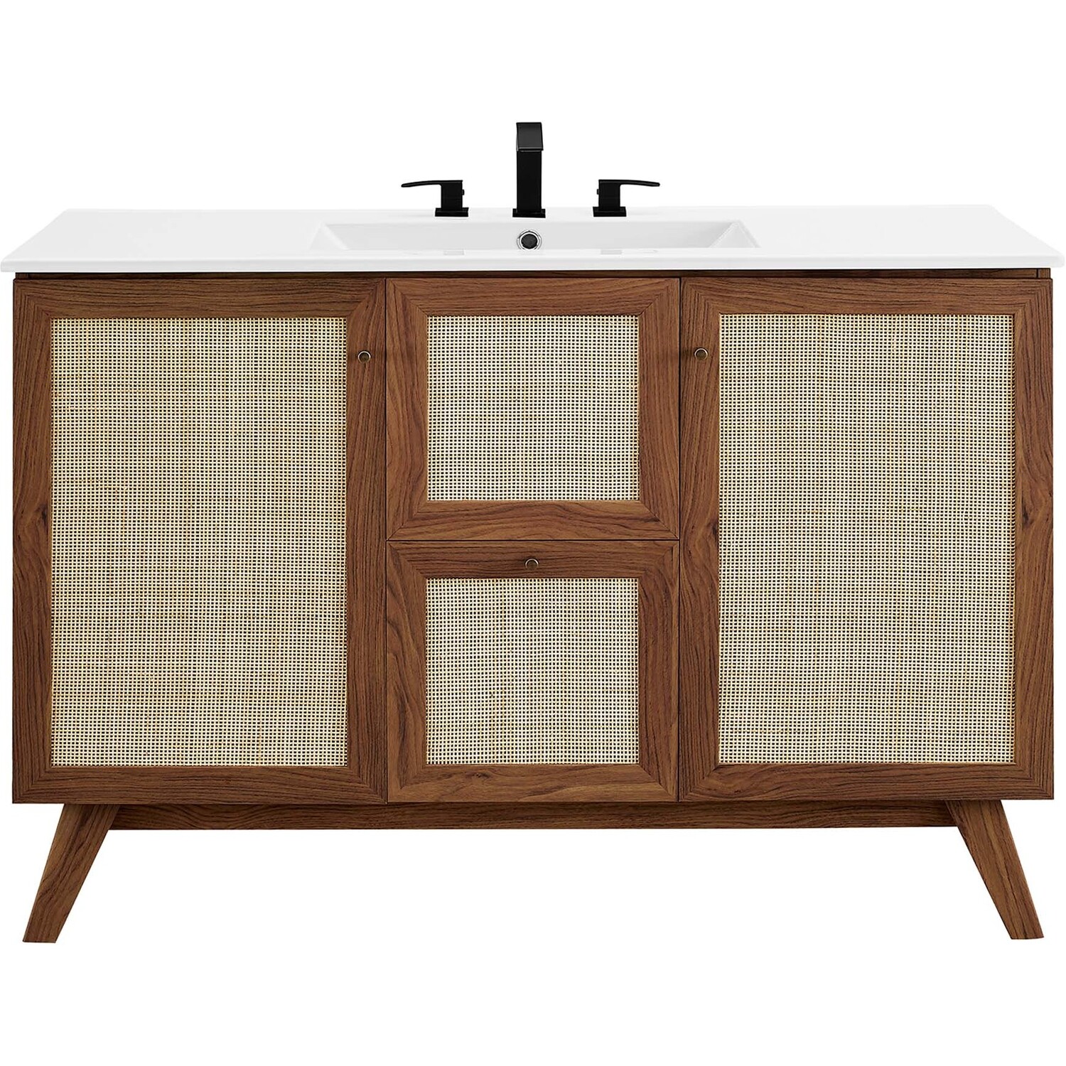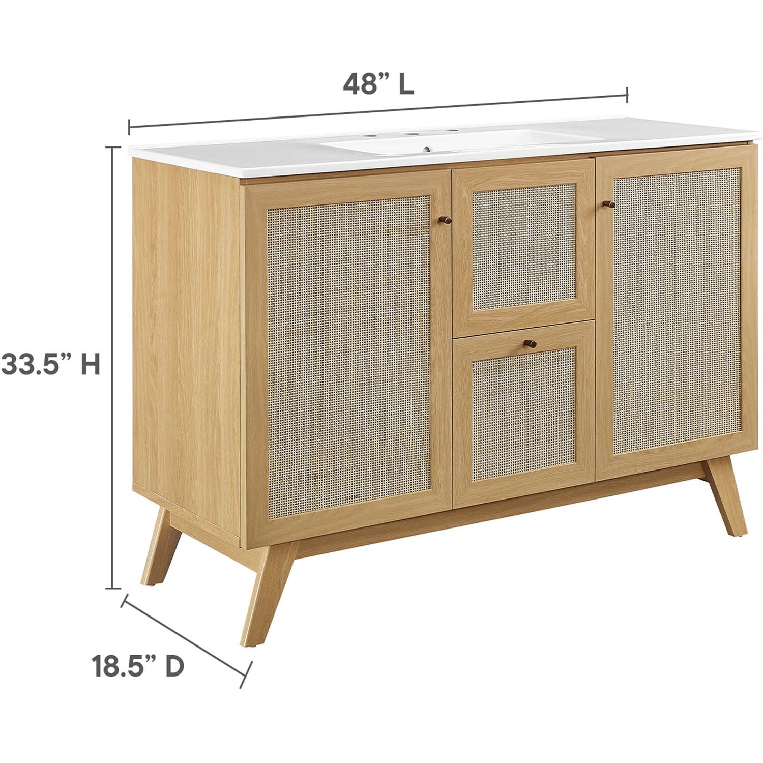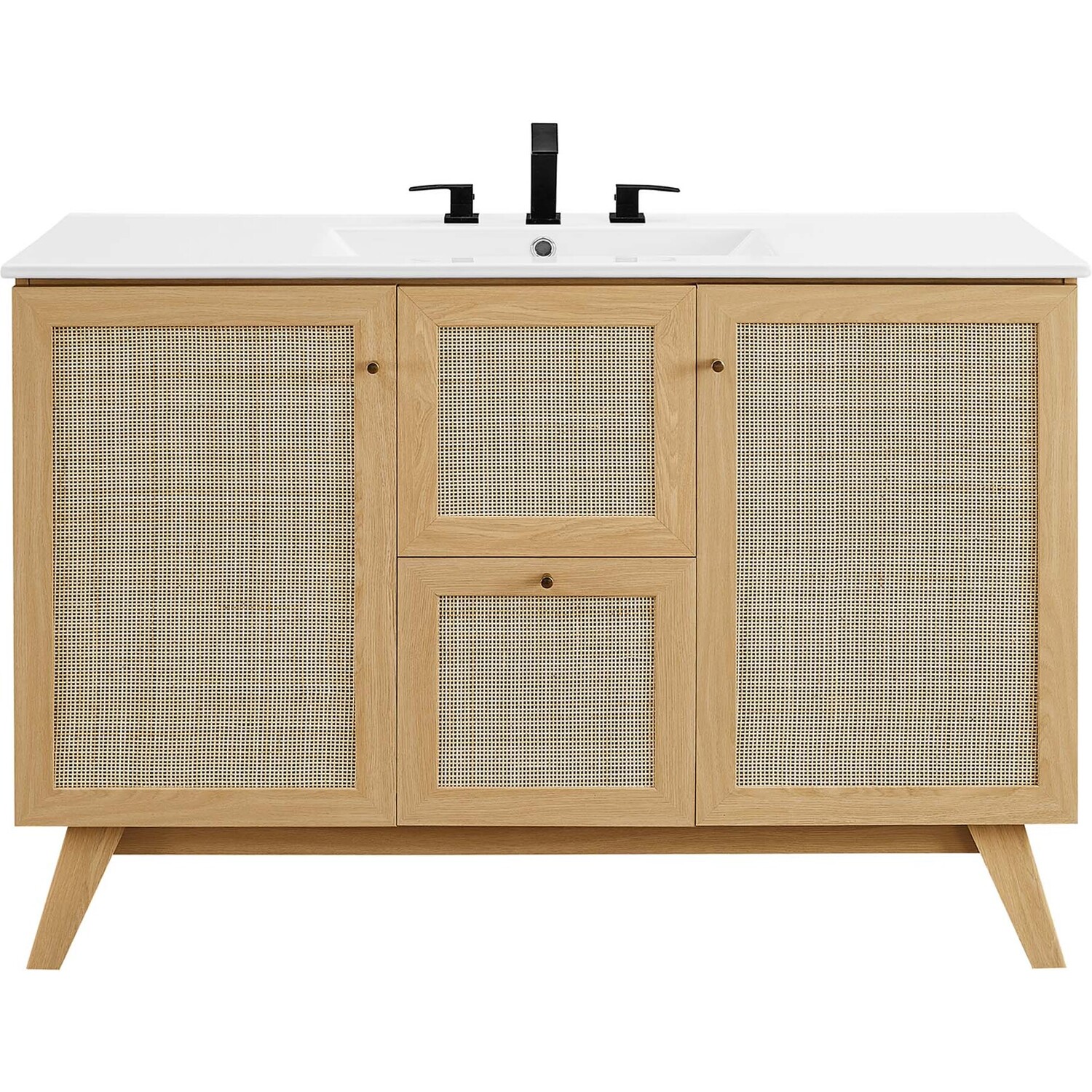 Introduce refreshing style to your restroom with the Soma 48” Bathroom Vanity. Showcasing a beautiful rattan weave on the cupboard doors and drawer fronts, this vanity cabinet brings organic aesthetics and modern functionality to any bathroom or powder room. Crafted from durable MDF and particleboard with a natural wood grain finish, this vanity boasts a ceramic basin with 8-inch centerset holes and an integrated countertop. This vanity features two cupboards with two drawers nestled in between, one thoughtfully spacious and the other decorative and non-functional. Inside each cupboard there’s an adjustable shelf, providing easy customization for arranging towels, toiletries, and bathroom necessities. Complete with metal doorknobs with a brushed gold finish and soft-close hinges, this bathroom vanity cabinet is designed for quiet and effortless functionality. Resting on splayed legs, the Soma Bathroom Vanity includes non-marking foot caps to protect flooring. Assembly required. Fixtures not included.MDF and Particleboard