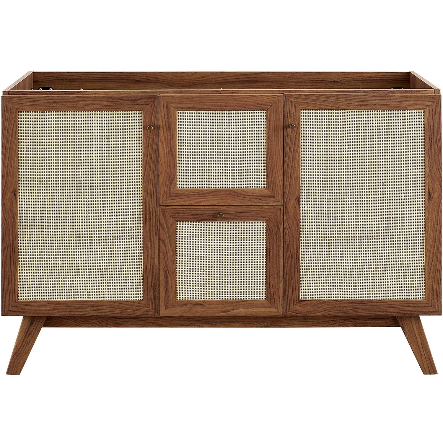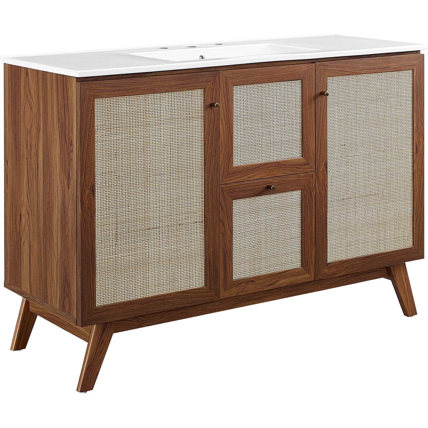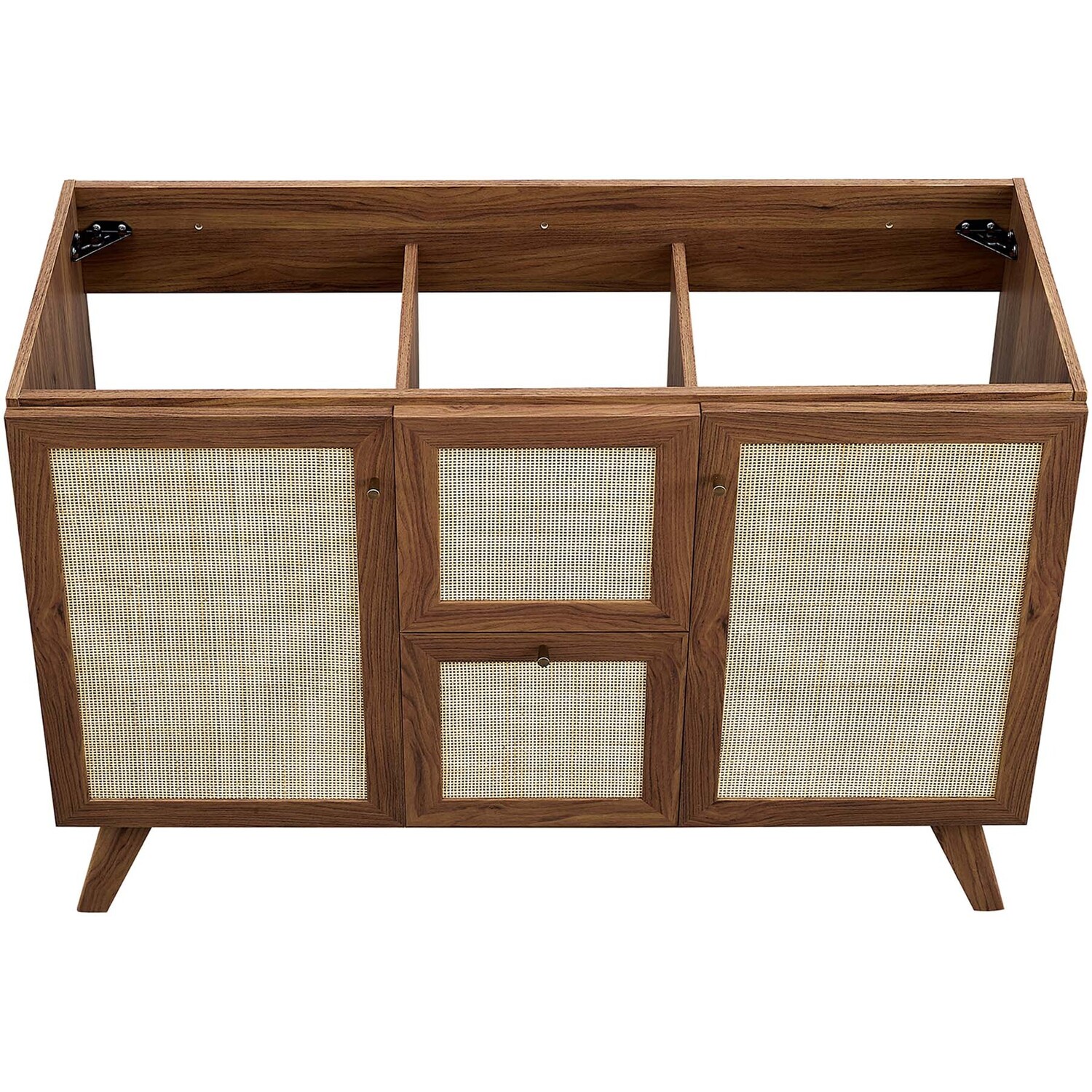 Introduce refreshing style to your restroom with the Soma 48” Bathroom Vanity. Showcasing a beautiful rattan weave on the cupboard doors and drawer fronts, this vanity cabinet brings organic aesthetics and modern functionality to any bathroom or powder room. Crafted from durable MDF and particleboard with a natural wood grain finish, this vanity boasts a ceramic basin with 8-inch centerset holes and an integrated countertop. This vanity features two cupboards with two drawers nestled in between, one thoughtfully spacious and the other decorative and non-functional. Inside each cupboard there’s an adjustable shelf, providing easy customization for arranging towels, toiletries, and bathroom necessities. Complete with metal doorknobs with a brushed gold finish and soft-close hinges, this bathroom vanity cabinet is designed for quiet and effortless functionality. Resting on splayed legs, the Soma Bathroom Vanity includes non-marking foot caps to protect flooring. Assembly required. Fixtures not included.MDF and Particleboard